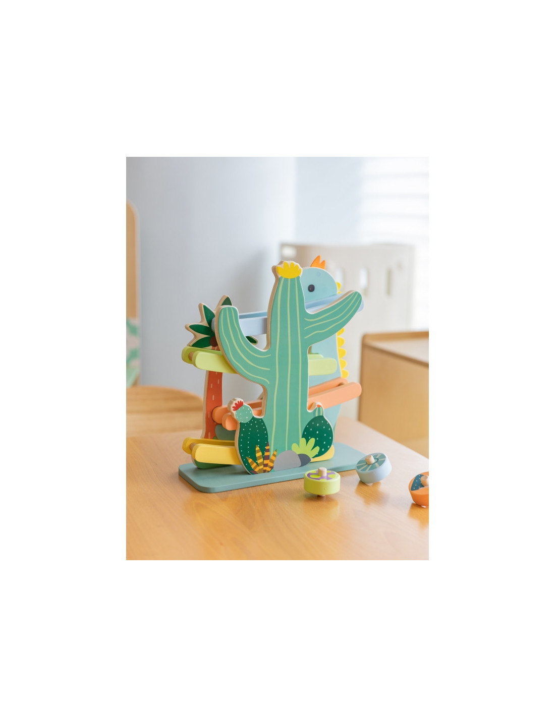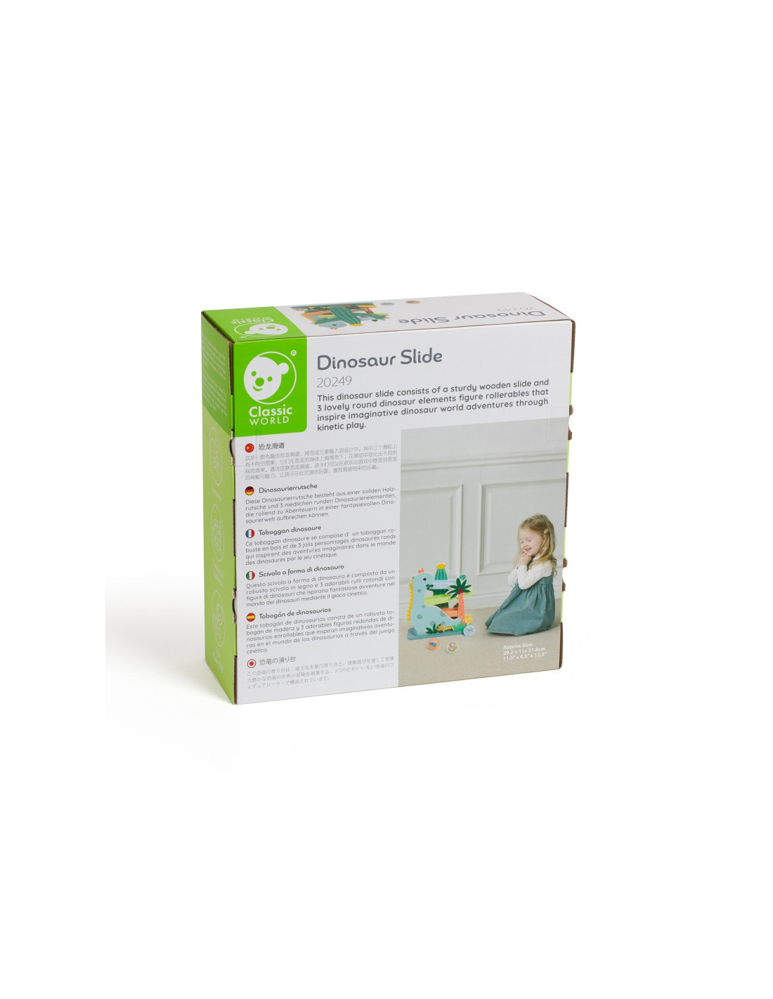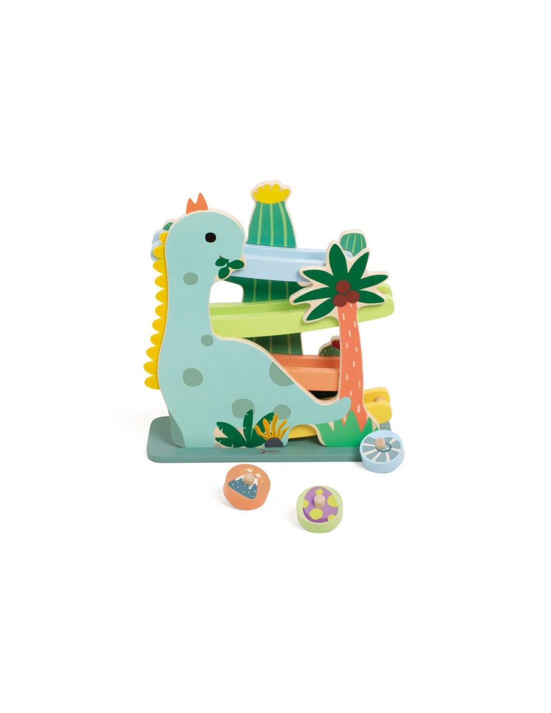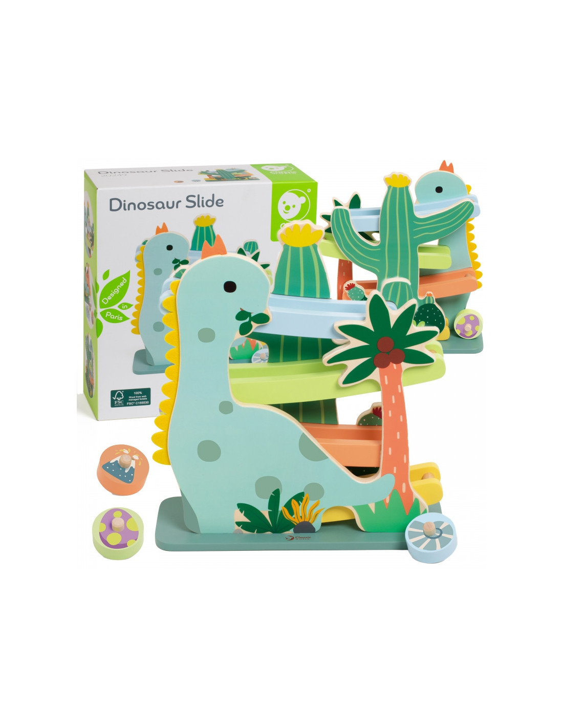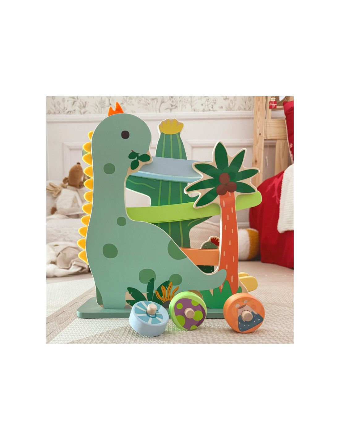 Ta kolorowa zjeżdżalnia dla dinozaurów od marki CLASSIC WORLD to fantastyczna zabawka, która zapewni Twojemu dziecku mnóstwo radości. Składa się z solidnej, drewnianej konstrukcji i 4 uroczych, okrągłych elementów, które inspirują wyobraźnię do przygód w świecie dinozaurów. Poprzez zabawę kinetyczną, maluch może obserwować, jak elementy zjeżdżają w dół toru, co w naturalny sposób uczy go podstawowych zasad fizyki.