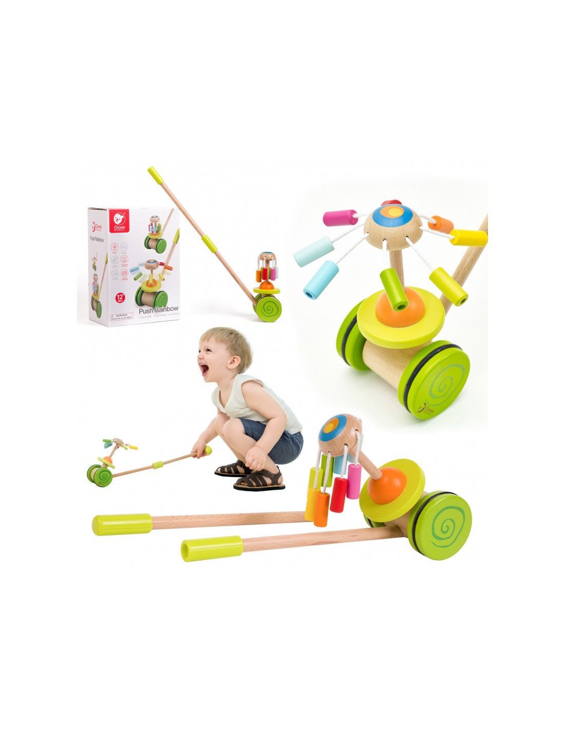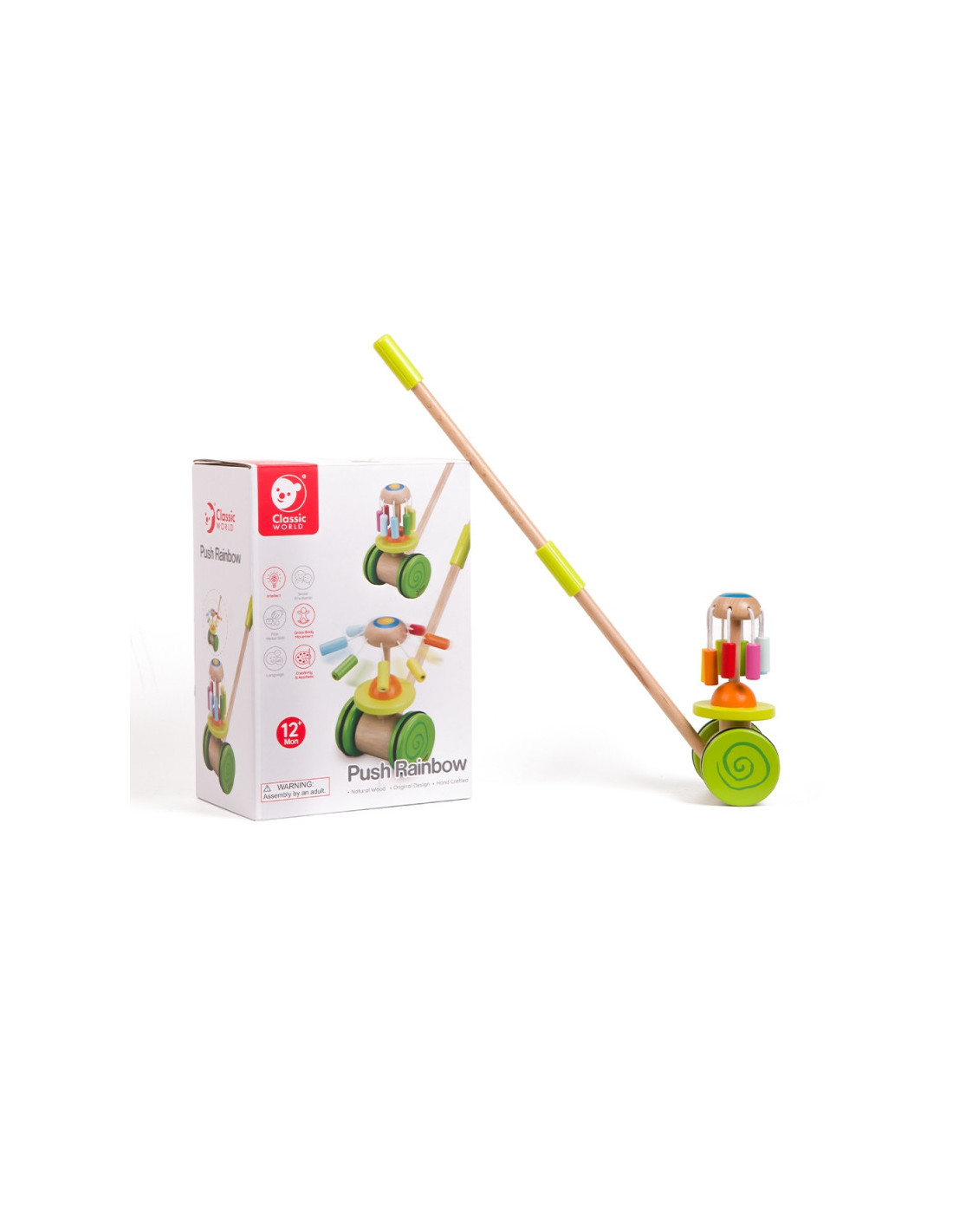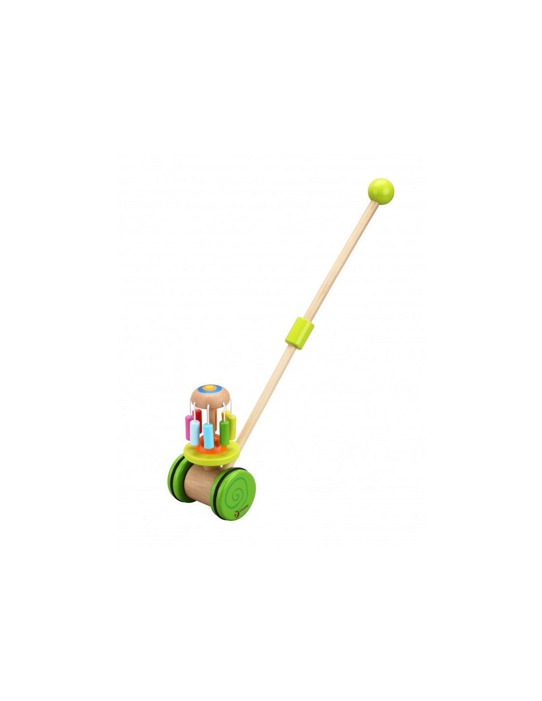 Produkt przeznaczony dla dzieci, które właśnie uczą się stawiać pierwsze kroki. Kolorowy pchacz na pewno zachęci maluszka do doskonalenia techniki chodzenia i umili każdy rodzinny spacer. Dodatkową atrakcją dla malucha jest kolorowa kręcąca karuzelka w kolorach tęczy równocześnie wydająca bardzo przyjemny dźwięk.