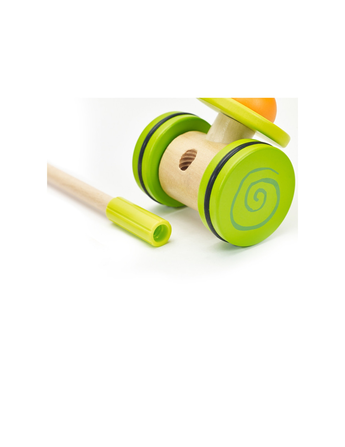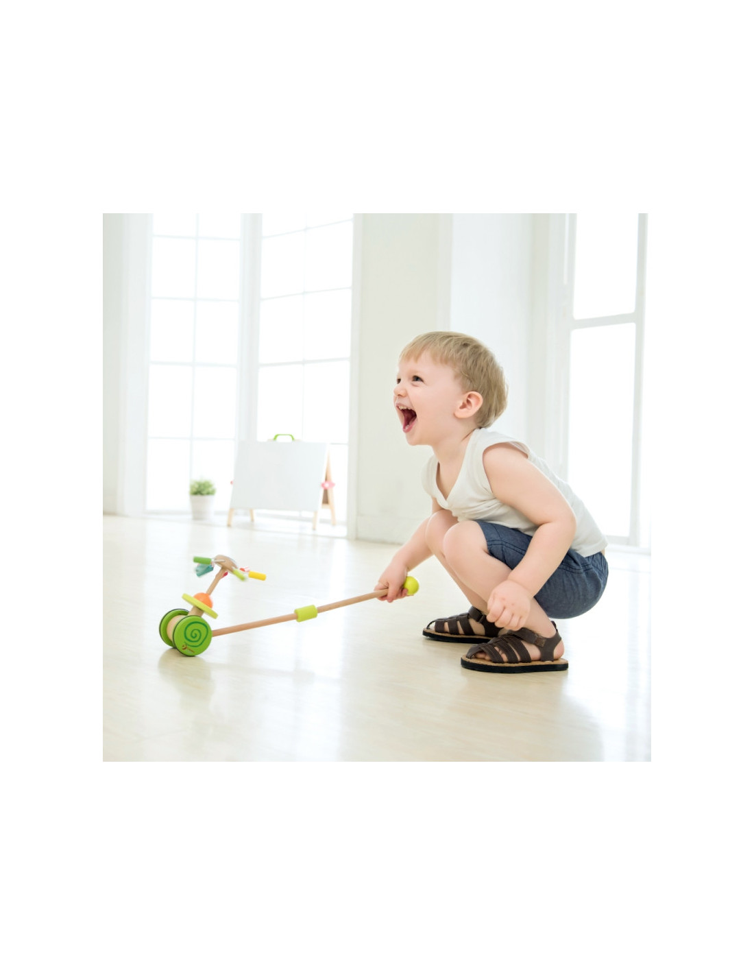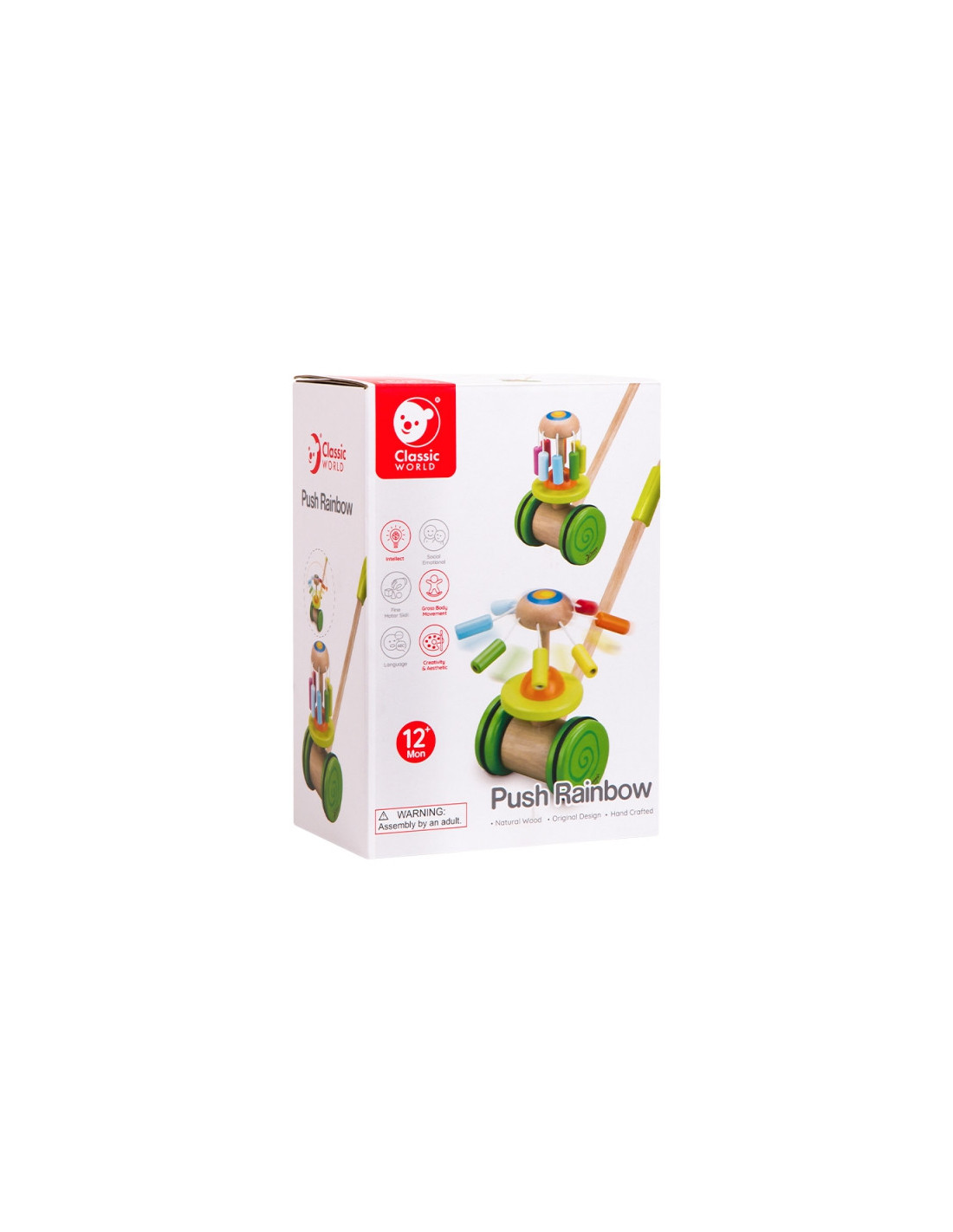 Produkt przeznaczony dla dzieci, które właśnie uczą się stawiać pierwsze kroki. Kolorowy pchacz na pewno zachęci maluszka do doskonalenia techniki chodzenia i umili każdy rodzinny spacer. Dodatkową atrakcją dla malucha jest kolorowa kręcąca karuzelka w kolorach tęczy równocześnie wydająca bardzo przyjemny dźwięk.