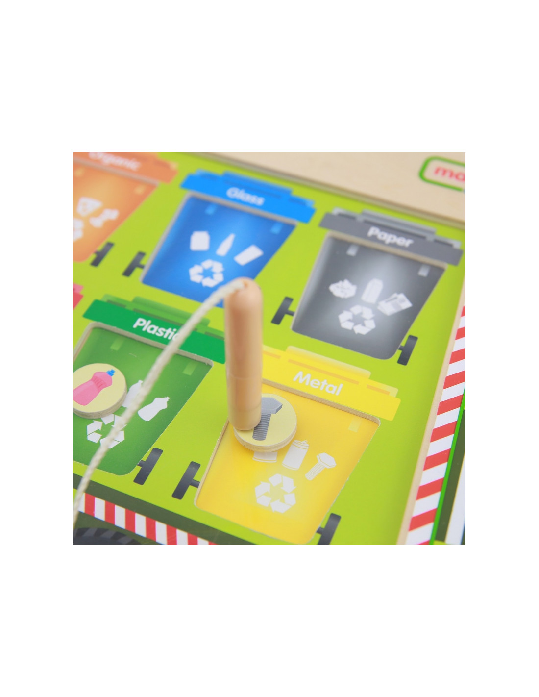 Zabawka sensoryczna edukacyjna dla dzieci. Drewniana tabliczka marki Masterkidz z nauką segregacji odpadów. Za pomocą magnetycznej pałeczki, dziecko ma za zadanie umieszczenie kółeczek ze śmieciami w odpowiednich kontenerach.