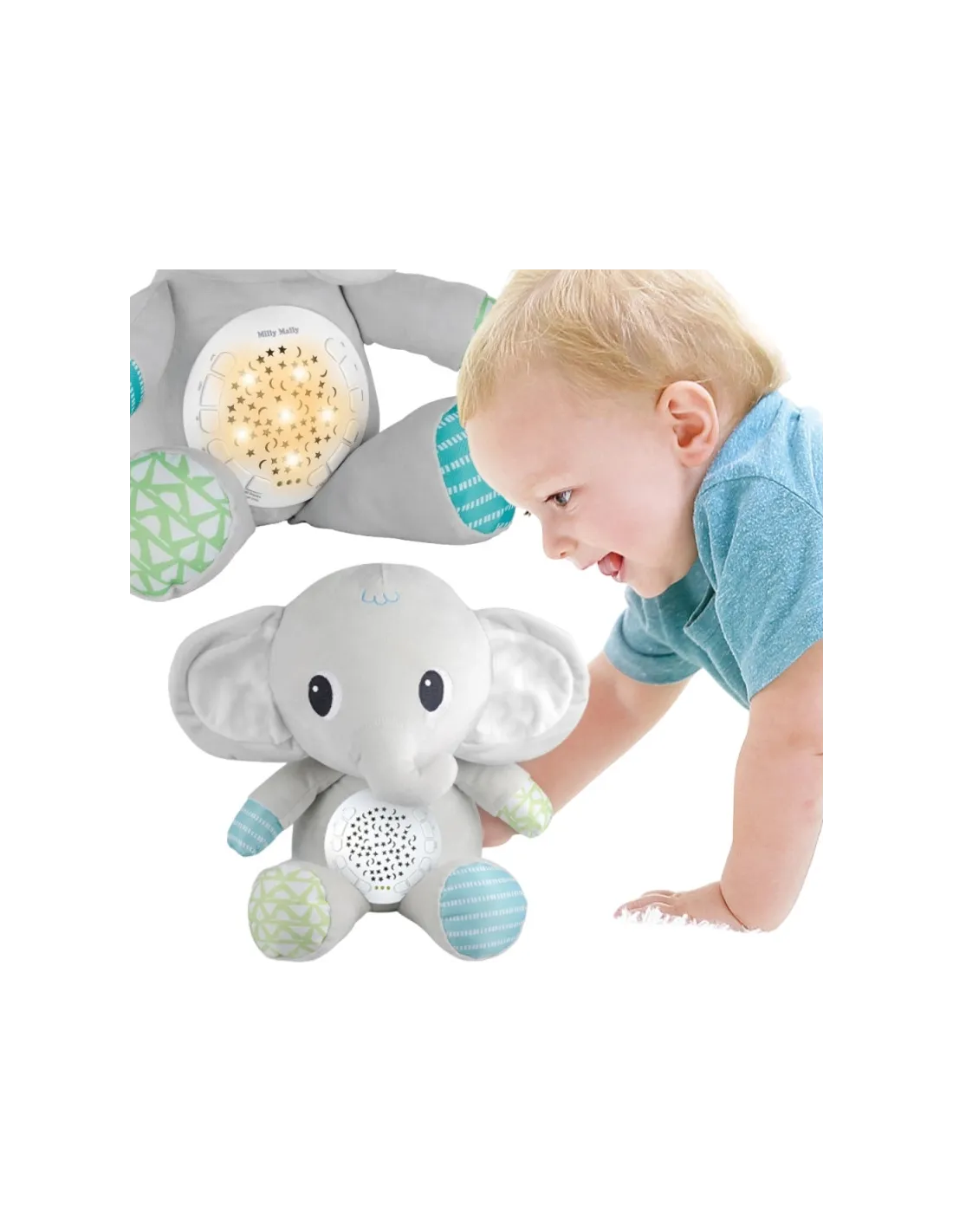 Woopie minkštas dramblys su projektoriumi yra tobulas draugas kiekvienam naujagimiui ir kūdikiui . Šis žavingas pliušinis žaislas sujungia žvaigždžių ir mėnulio projektoriaus funkcijas su muzikine dėžutė su raminančiomis melodijomis . Dramblys padės nuraminti jūsų mažylį ir sukurs magišką, atpalaiduojančią atmosferą kambaryje. Dramblio pilve įmontuotas garso ir šviesos modulis siūlo 12 melodijų , įskaitant švelnias lopšines ir raminantį baltąjį triukšmą . Jis taip pat turi laikmačio funkciją , leidžiančią automatiškai išsijungti po 30, 60 arba 90 minučių. Pliušinis žaislas pagamintas iš minkšto, saugaus pliušo , puikiai tinka glamonėti ir yra saugus nuo gimimo.