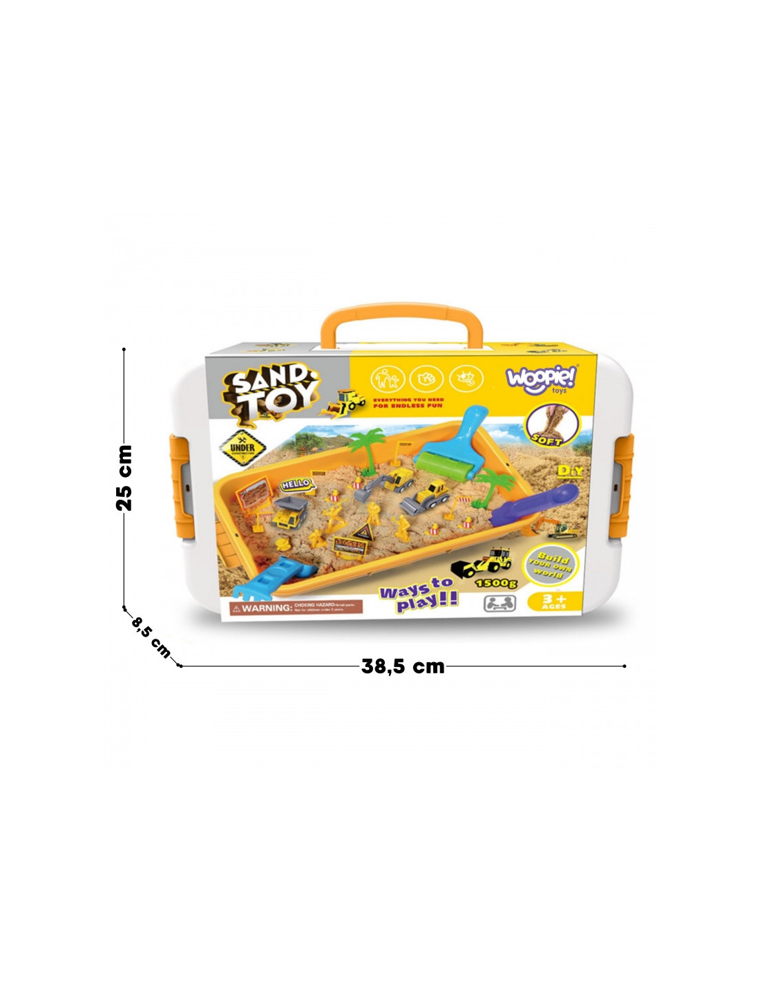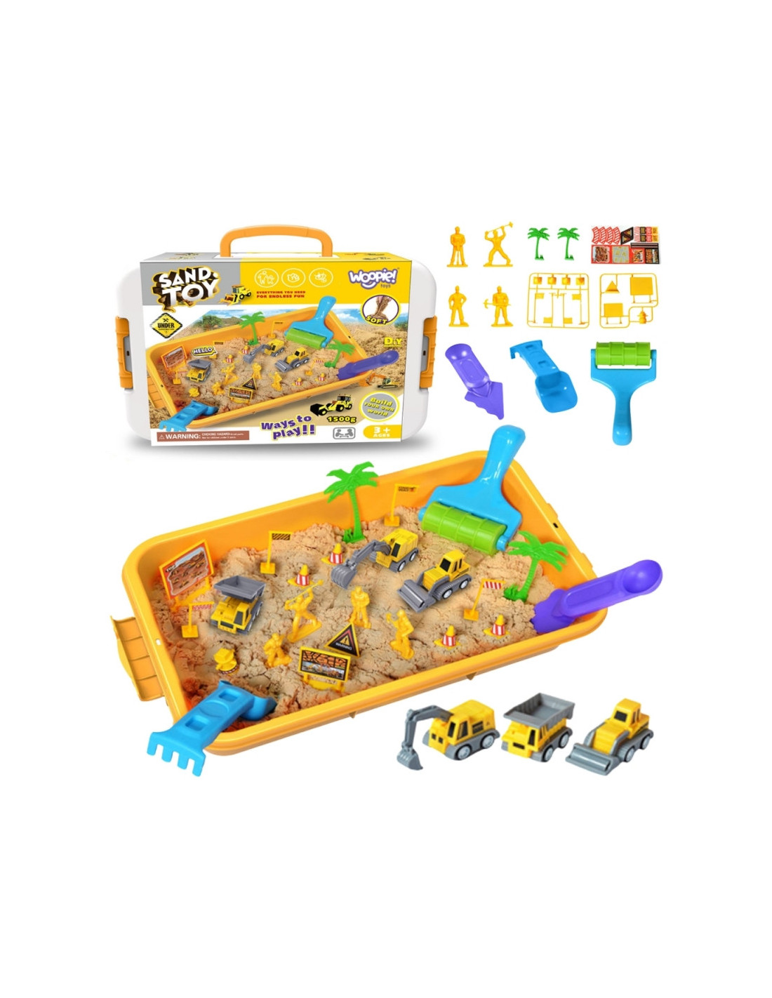 Pasiruošę didžiausiam kada nors jūsų kambario konstravimui? Pristatome Woopie prekės ženklo Magic Kinetic Sand statybvietę – tobulą komplektą kiekvienam mažajam inžinieriui ir statybinės technikos gerbėjui! Šis nuostabus smėlis niekada neišdžiūsta, yra minkštas liesti ir lengvai formuojamas, todėl jūsų vaikas gali konstruoti, kasti ir kurti tikroviškas konstrukcijas. Su daugybe mašinų, formų ir priedų, jis suteiks valandų valandas priklausomybę sukeliančių pramogų, lavindamas kūrybiškumą ir rankinius įgūdžius be netvarkos!
