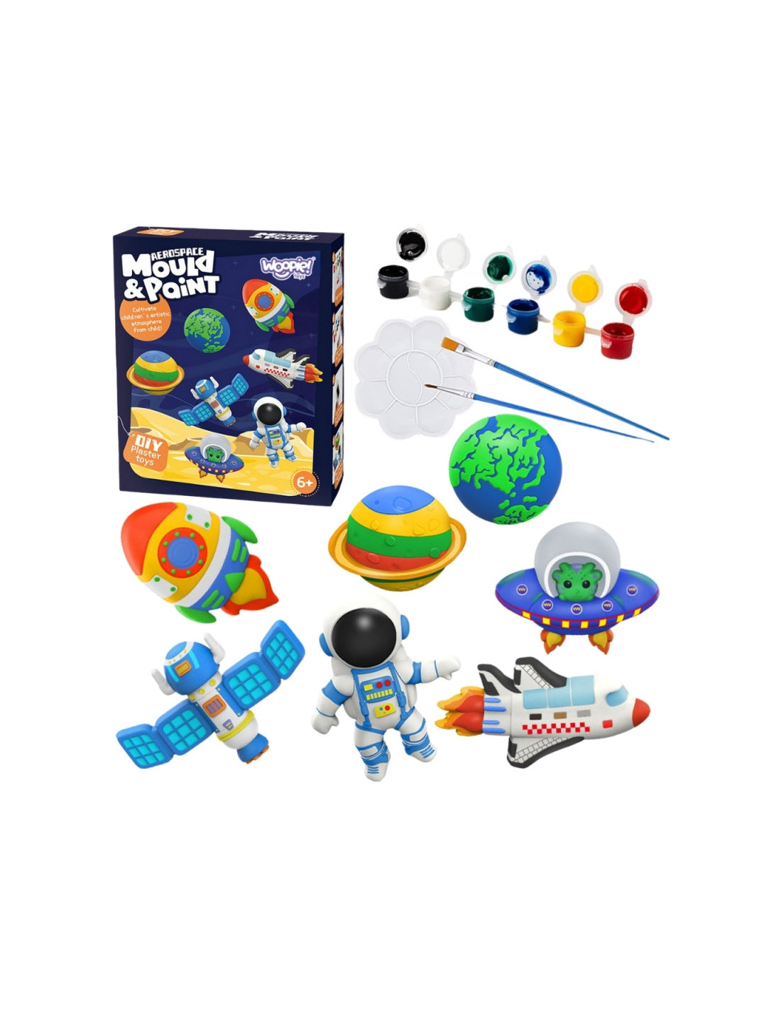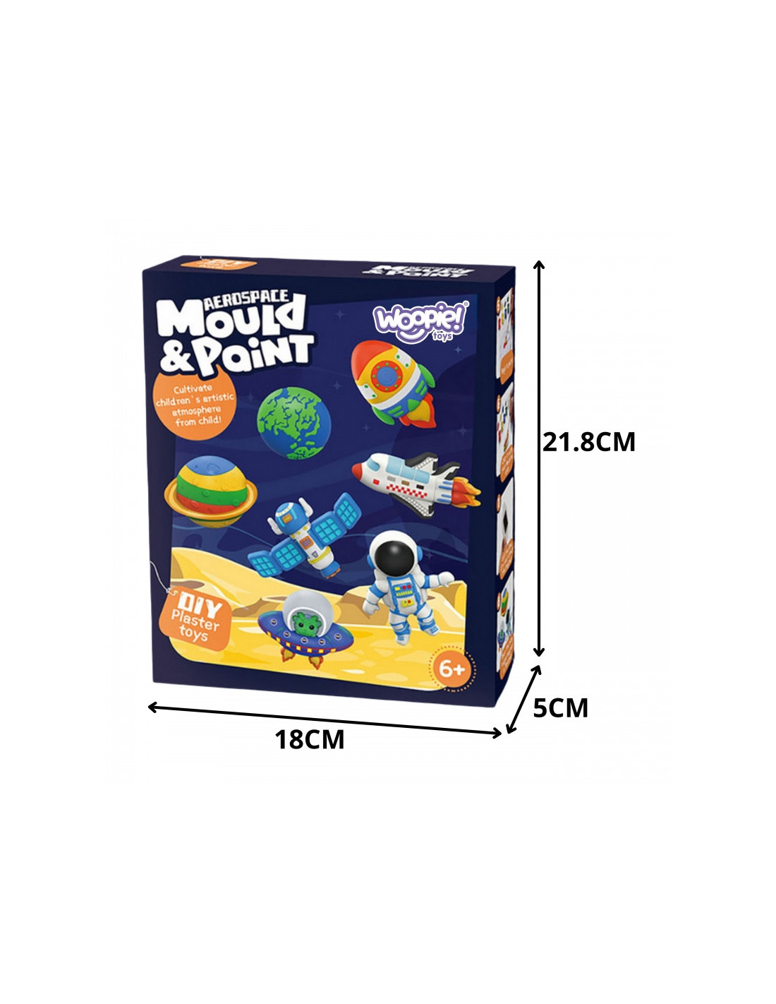 Pasiimkite savo vaiką į įspūdingą kelionę po kosmosą – neišeidami iš namų! Su Woopie prekės ženklo "Mould & Paint SPACE" rinkiniu jūsų mažylis iš gipso sukurs savo raketas, astronautus, planetas ir kitus kosminius stebuklus ir nudažys juos pagal savo idėjas. Edukacija ir smagios pramogos viename!