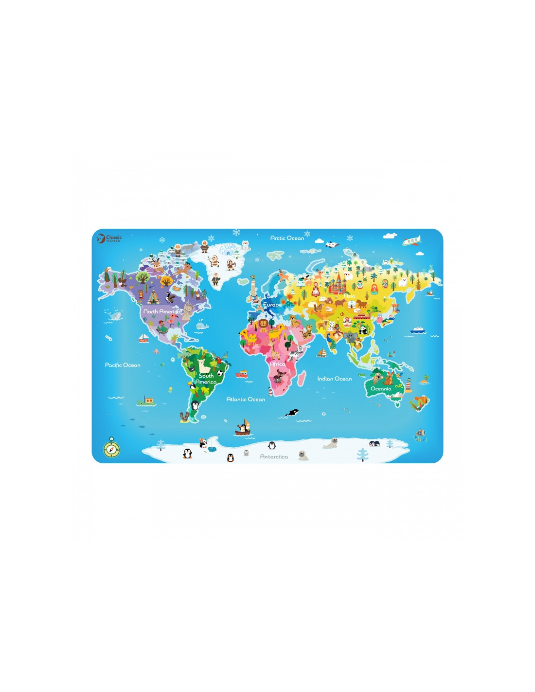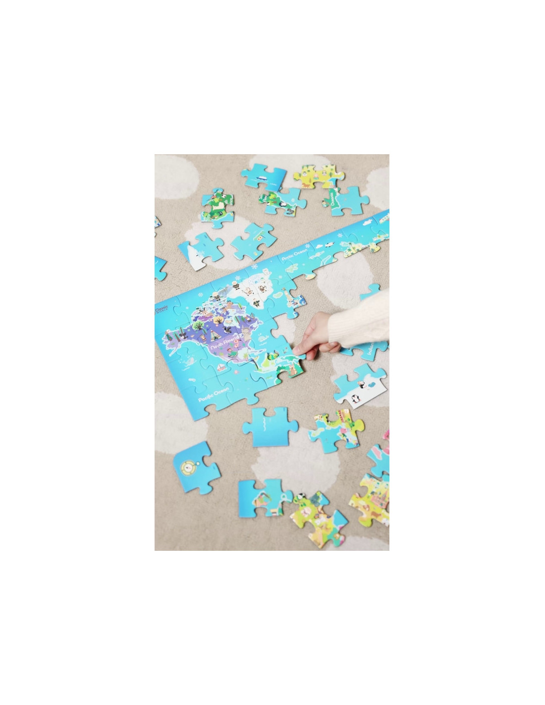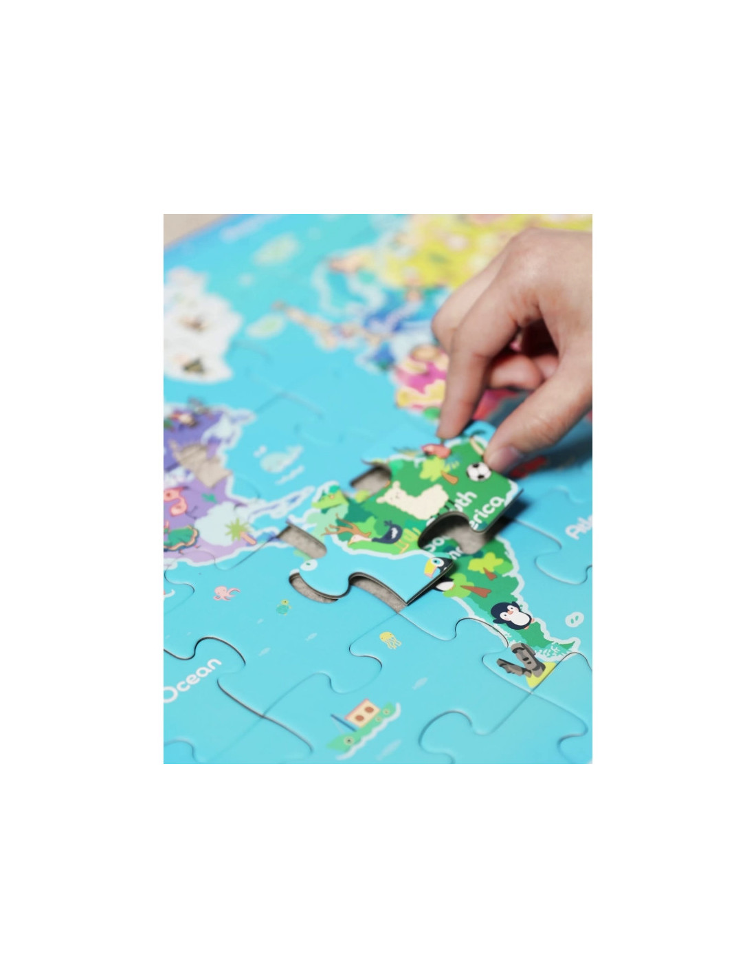 Spalvingi galvosūkiai, vaizduojantys pasaulio žemėlapį, lavina stebėjimo įgūdžius, rankinius įgūdžius, vaizduotę ir geografines žinias. Vaikas įdomiai ir interaktyviai sužino apie žemynus, vandenynus ir mūsų žemės rutulio įvairovę.