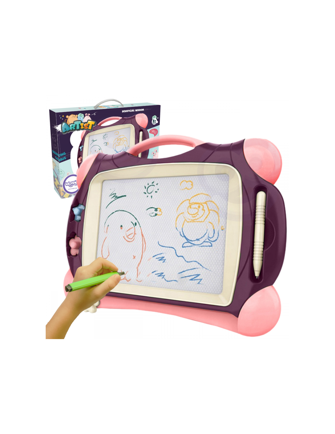 Znikopis Tablica Magnetyczna daje możliwość kreatywnej zabawy na długi czas! Tablica zachęca do pisania i rysowania. Rysowanie pozwoli wyciszyć i uspokoić się Twojemu dziecko. Znikopis pozwala na tworzenie nieskończonej ilość obrazków – wystarczy przejechać specjalnym suwakiem, a rysunek zniknie i można rysować od nowa! Zestaw dodatkowo zawiera wygodny magiczny długopis oraz 2 stempelki, które urozmaicą dzieło. Tablica posiada wygodny uchwyt, dzięki czemu dziecko może zabrać ją wszędzie. Znikopis rozwinie u dziecka zdolności manualne, wyobraźnie, kreatywność oraz da szansę na rozwinięcie artystycznej strony dziecka!