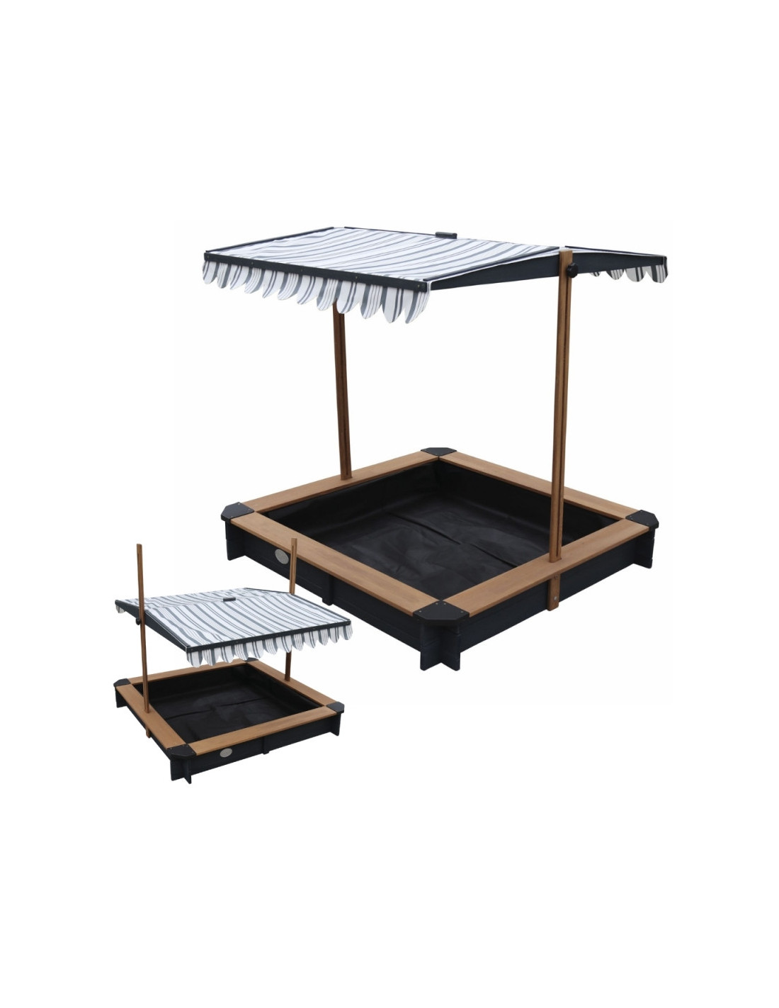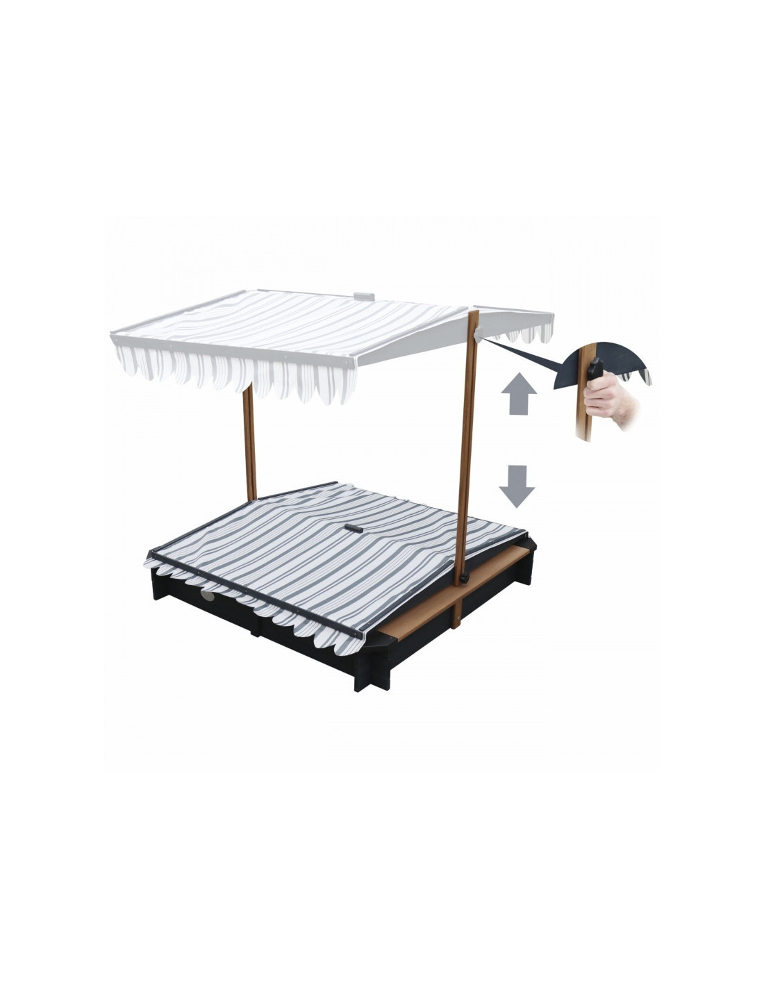 - Regulowany daszek 2w1 – wykonany z wodoodpornego poliestru (280 g/m²) z ochroną UV50, który chroni dzieci przed słońcem i deszczem. Można go łatwo regulować, dostosowując kąt nachylenia, a po zakończeniu zabawy – opuścić, zamieniając go w ochronną pokrywę piaskownicy.