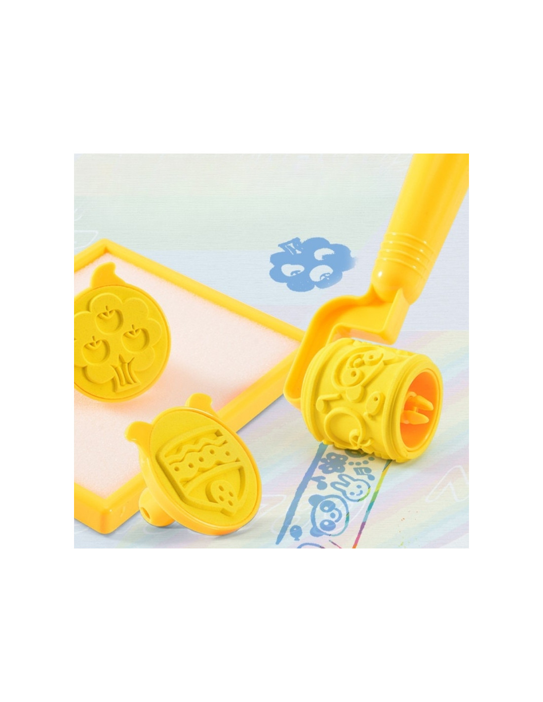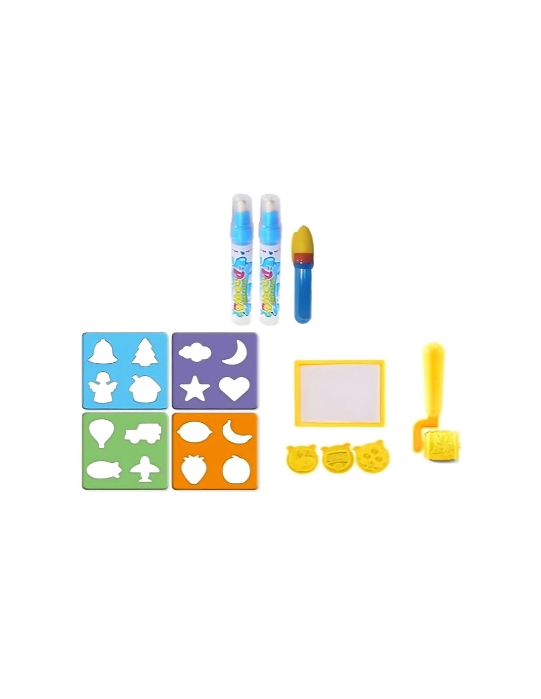 Zestaw zawiera szablony i stempelki, które urozmaicają zabawę i pozwalają tworzyć jeszcze ciekawsze wzory -