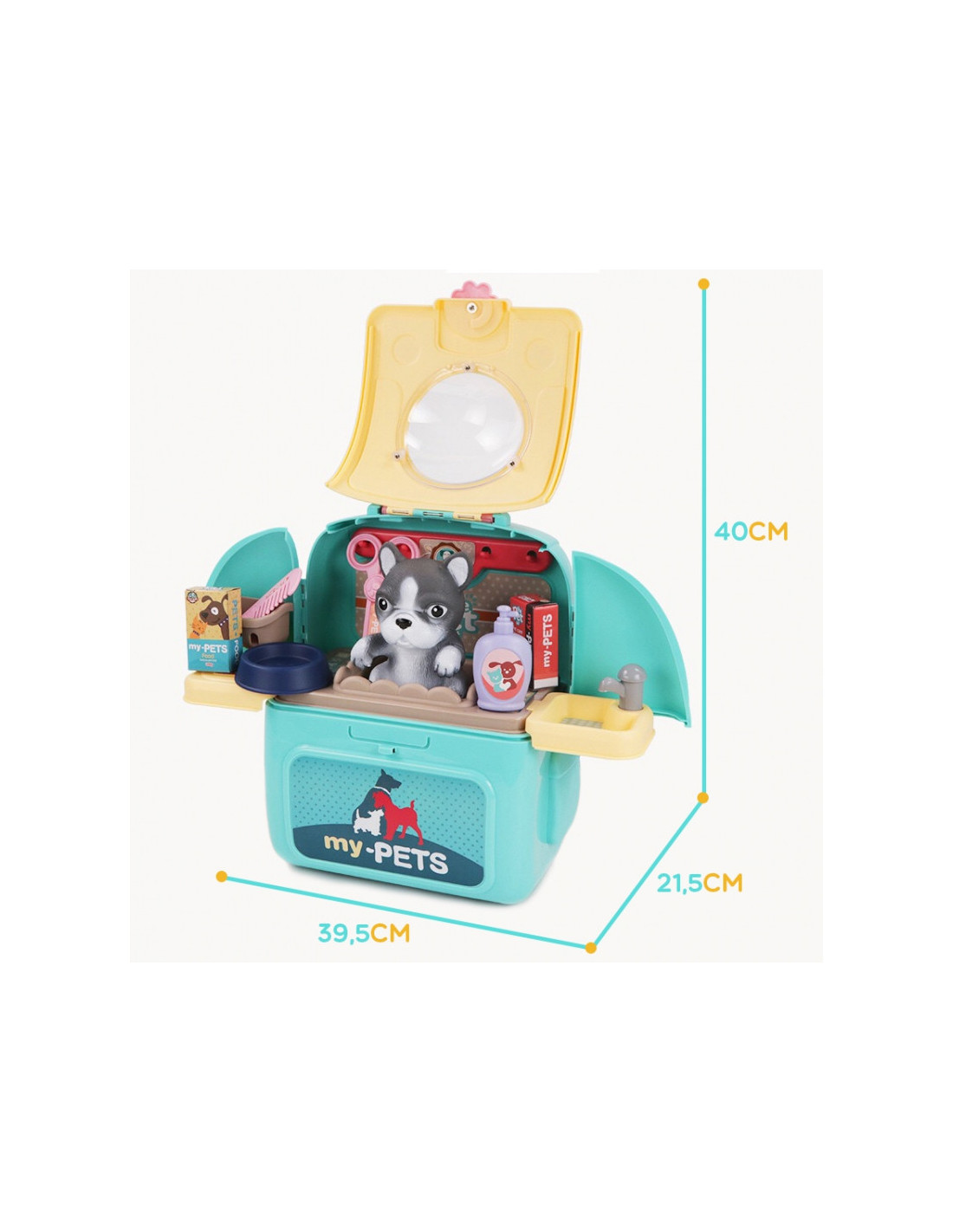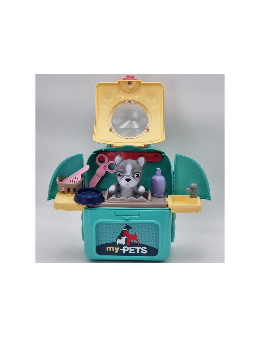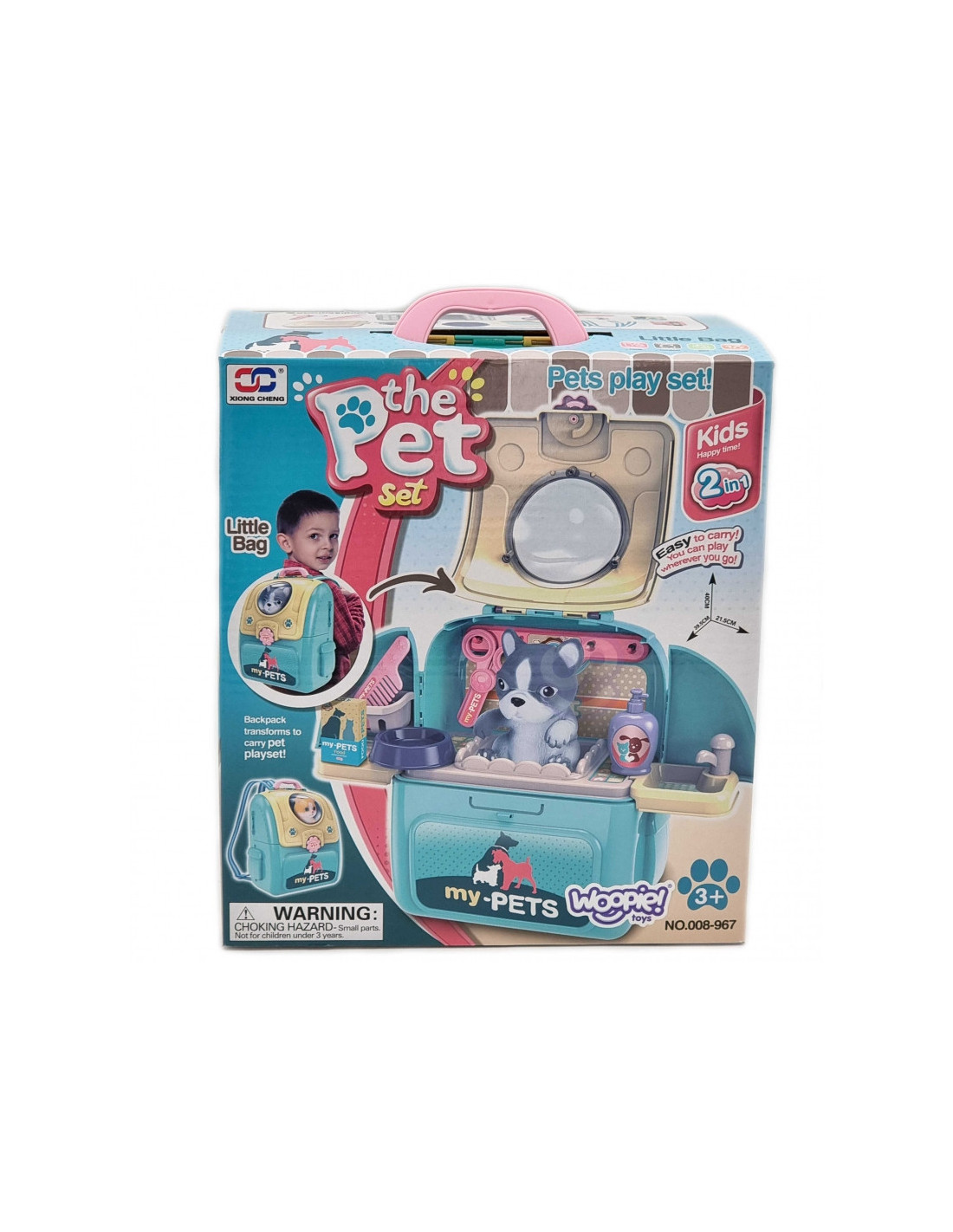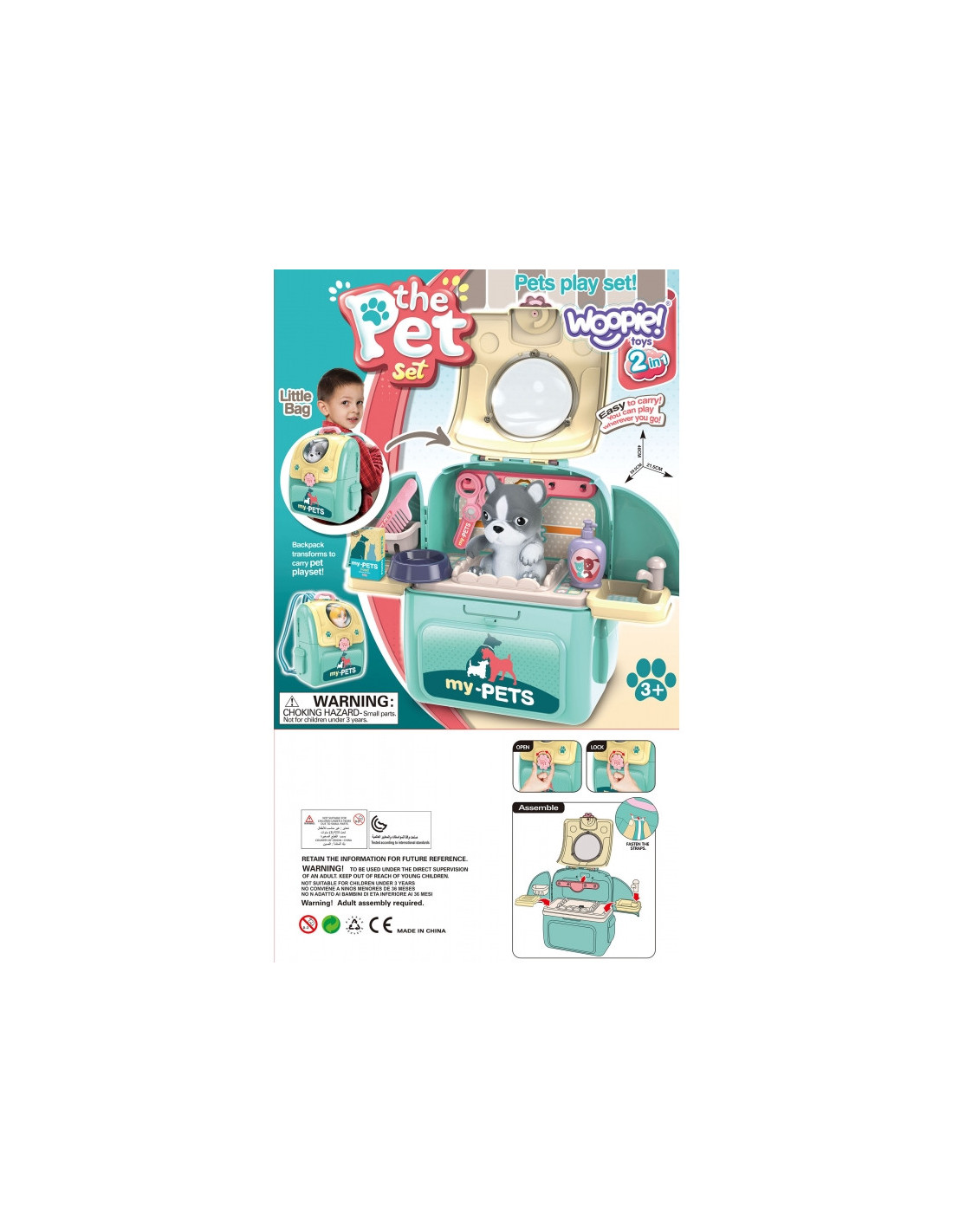 WOOPIE prekės ženklo nešiojamas šunų kirpimo rinkinys leis jūsų vaikui pasirūpinti savo mėgstamu augintiniu. Patogioje nešiojamoje kuprinėje šunį galite pasiimti bet kur: į kelionę, į žaidimų aikštelę ar į darželį. Kuprinė turi pakeliamą rankeną ir specialų užsegimą, kuris neleis kabinai atsidaryti nešiojant ir užtikrins maksimalų augintinio saugumą. 2-in-1 kirpimo rinkinį sudaro: šuns figūrėlė, kuprinė, dirželis (kabinai uždėti ant nugaros), dubuo, žirklės, šukos, aksesuarų krepšelis, 2 maisto dėžutės, šampūnas, kriauklė, čiaupas, lentyna ir pakaba. Rinkinyje yra viskas, ko reikia norint pasirūpinti savo augintiniu. Vaikas gali nusiprausti ir maitinti savo šunį. Vaidindamas slaugytojo ar veterinarijos gydytojo vaidmenį, vaikas lavina vaizduotę ir empatijos jausmą. Gali būti, kad žaislas bus aistros ugdymo pradžia ir kelias tapti veterinaru.