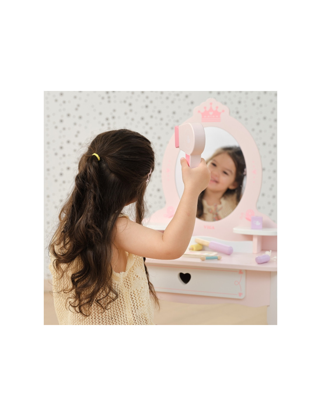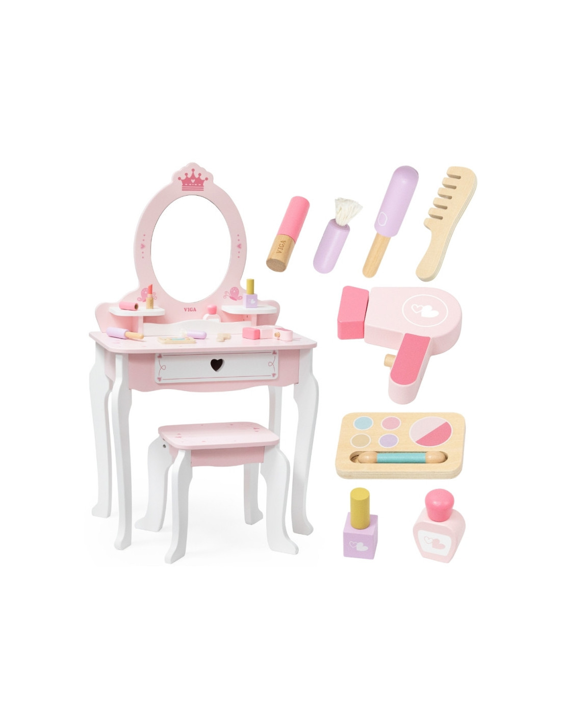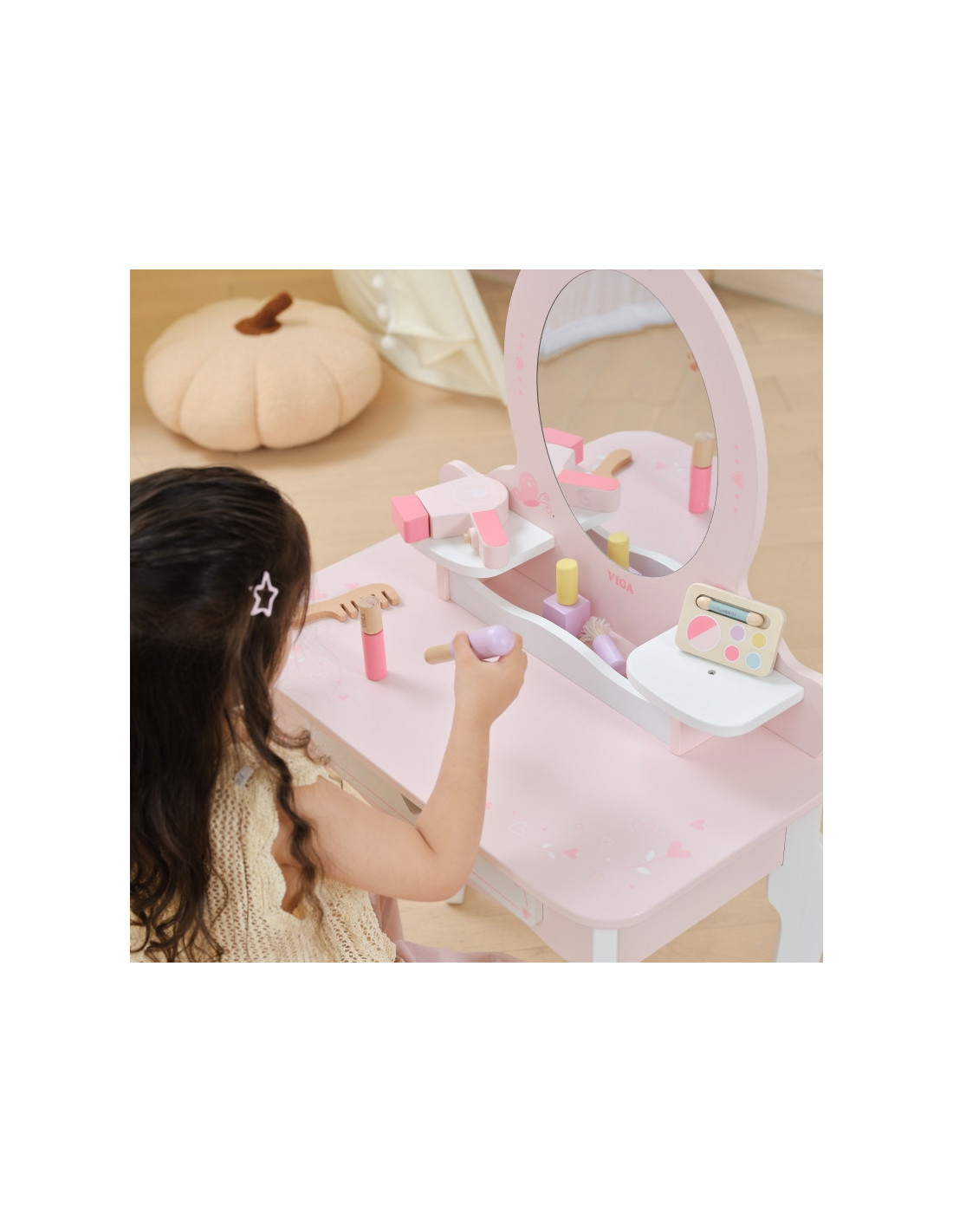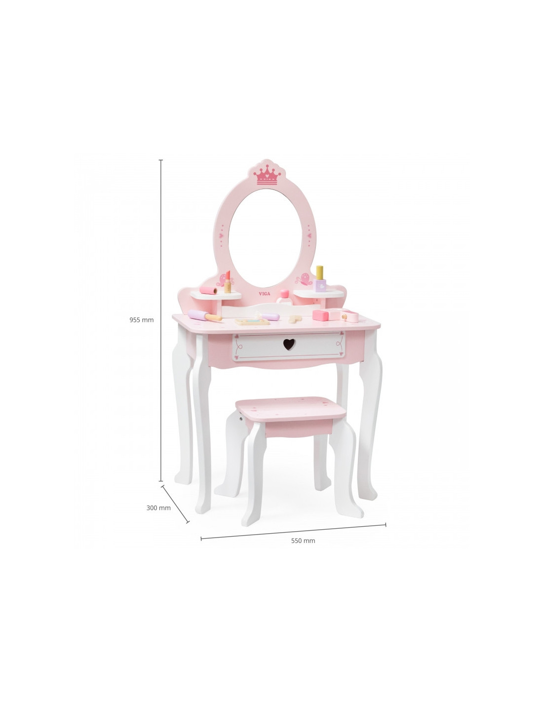 Didelis medinis tualetinis staliukas iš Viga prekės ženklo yra unikalus medinis tualetinis staliukas mažajai princesei, kuris įgyvendins kiekvienos mergaitės svajones! Pagamintas iš aukščiausios kokybės medienos, subtilių rožinių ir baltų atspalvių, šis žavingas tualetinis staliukas džiugina savo pasakišku dizainu. Stilingos, suapvalintos formos, subtilios dekoracijos ir elegantiškos kojos puikiai tinka vaiko kambariui, suteikdami jam žavesio ir magijos. Tualetinis staliukas lavina kūrybiškumą, vaizduotę ir skatina žaisti vaidmenimis. Tai taip pat puiki dovanos idėja – tvirtas apdirbimas ir estetinė išvaizda leis jai tarnauti daugelį metų.