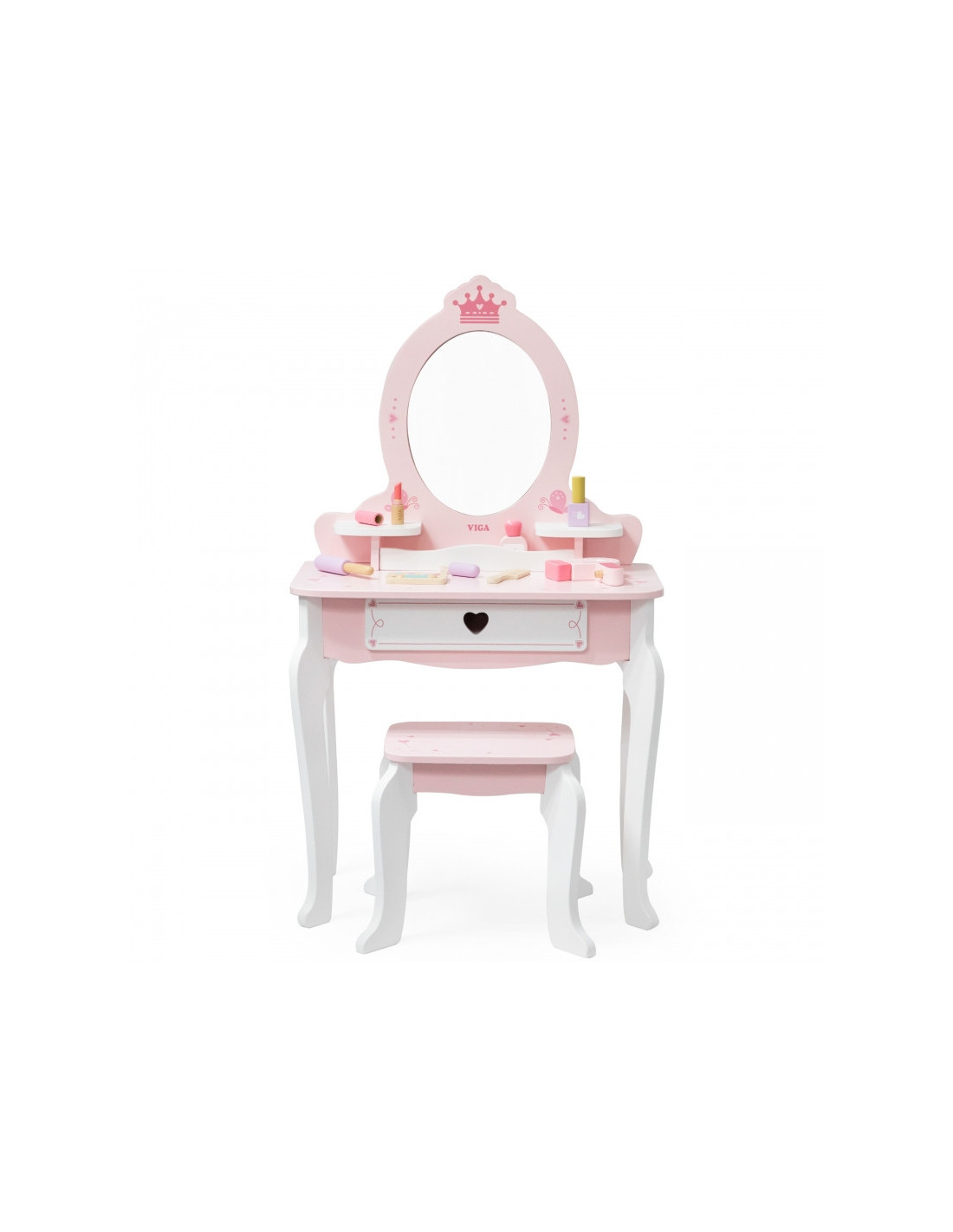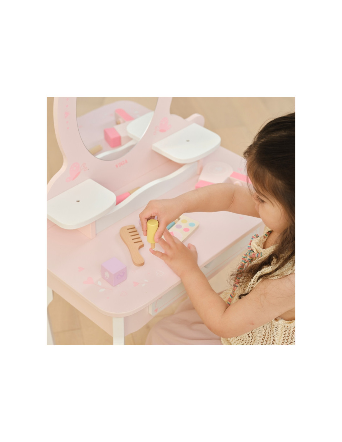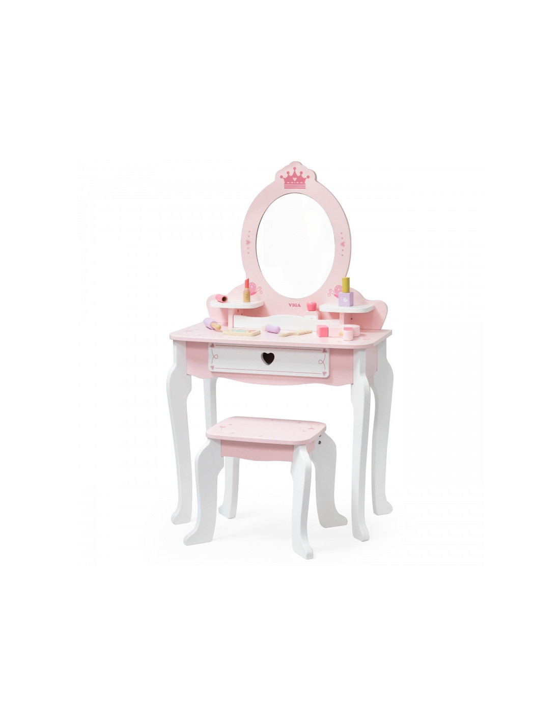 Didelis medinis tualetinis staliukas iš Viga prekės ženklo yra unikalus medinis tualetinis staliukas mažajai princesei, kuris įgyvendins kiekvienos mergaitės svajones! Pagamintas iš aukščiausios kokybės medienos, subtilių rožinių ir baltų atspalvių, šis žavingas tualetinis staliukas džiugina savo pasakišku dizainu. Stilingos, suapvalintos formos, subtilios dekoracijos ir elegantiškos kojos puikiai tinka vaiko kambariui, suteikdami jam žavesio ir magijos. Tualetinis staliukas lavina kūrybiškumą, vaizduotę ir skatina žaisti vaidmenimis. Tai taip pat puiki dovanos idėja – tvirtas apdirbimas ir estetinė išvaizda leis jai tarnauti daugelį metų.