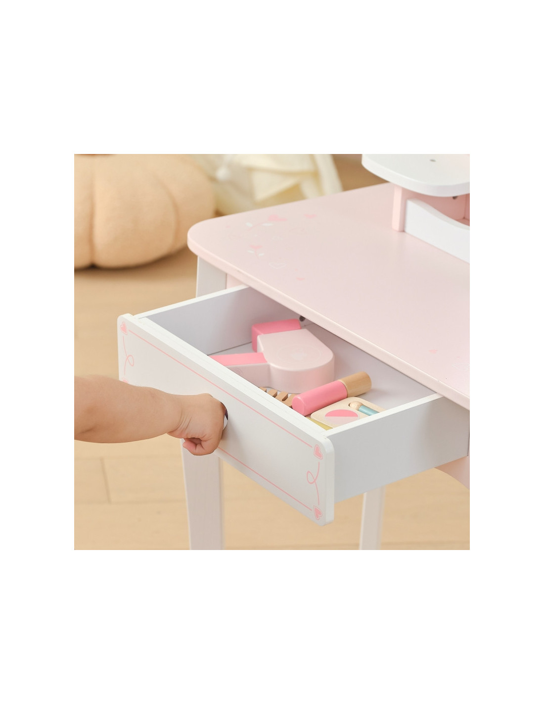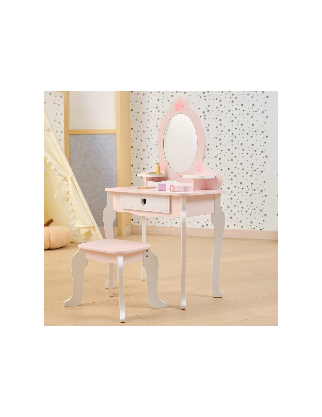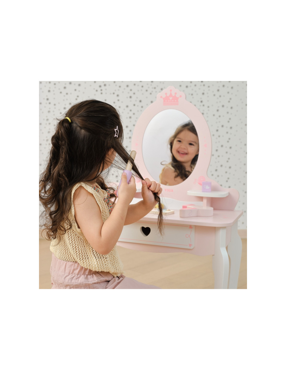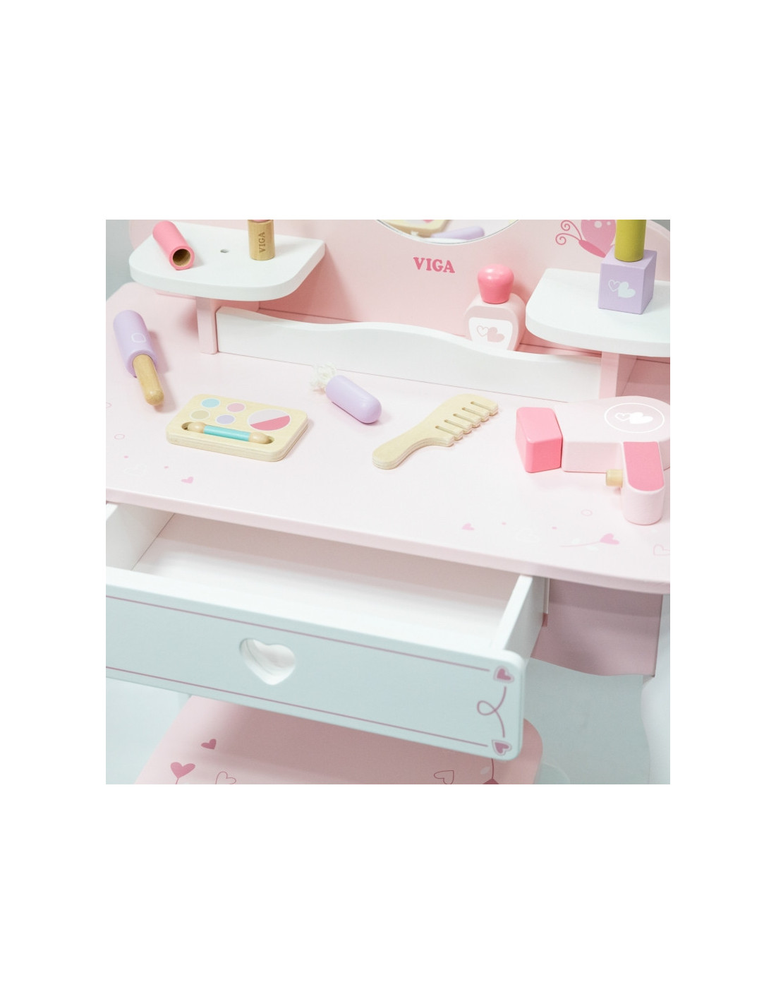 Didelis medinis tualetinis staliukas iš Viga prekės ženklo yra unikalus medinis tualetinis staliukas mažajai princesei, kuris įgyvendins kiekvienos mergaitės svajones! Pagamintas iš aukščiausios kokybės medienos, subtilių rožinių ir baltų atspalvių, šis žavingas tualetinis staliukas džiugina savo pasakišku dizainu. Stilingos, suapvalintos formos, subtilios dekoracijos ir elegantiškos kojos puikiai tinka vaiko kambariui, suteikdami jam žavesio ir magijos. Tualetinis staliukas lavina kūrybiškumą, vaizduotę ir skatina žaisti vaidmenimis. Tai taip pat puiki dovanos idėja – tvirtas apdirbimas ir estetinė išvaizda leis jai tarnauti daugelį metų.
