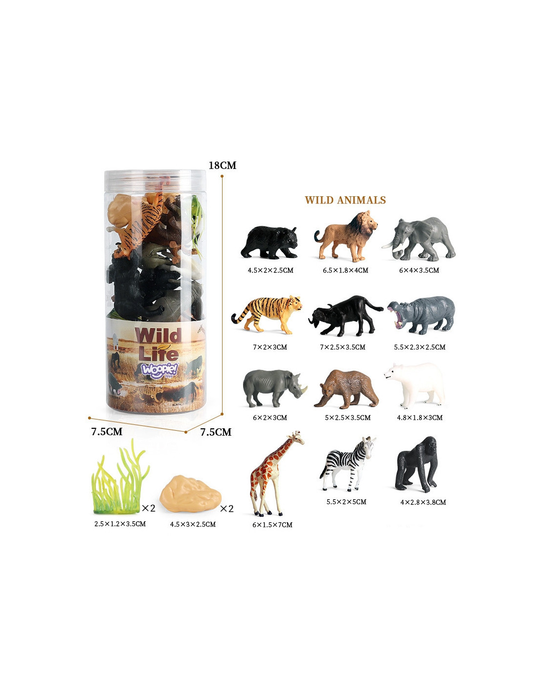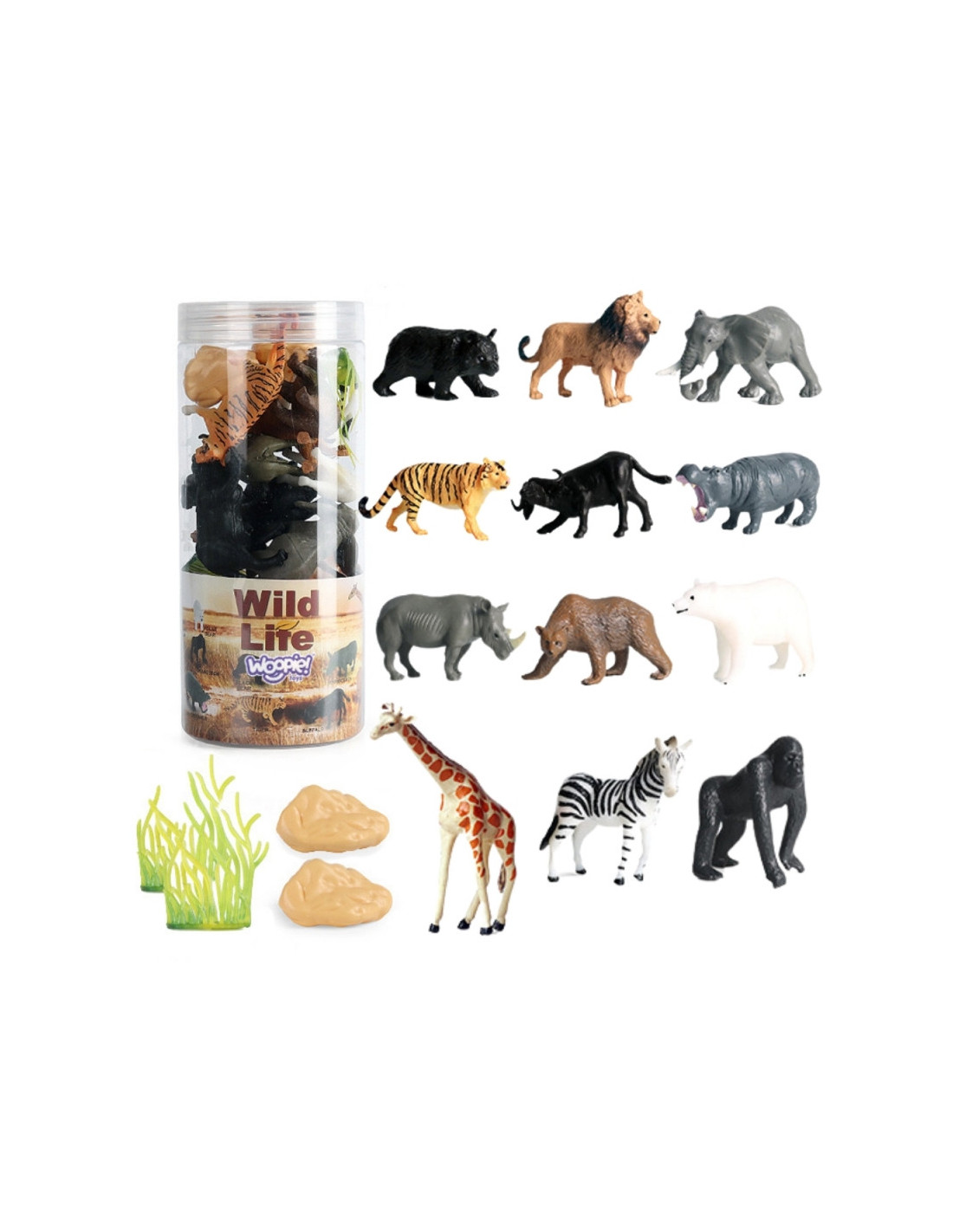 WOOPIE figūrėlių rinkinys yra puikus rinkinys kiekvienam gyvūnų gerbėjui. Rinkinyje yra 12 laukinių gyvūnų ir 2 augalai bei 2 akmenys.  Tikroviškai atrodančios figūrėlės padidins mažojo kolekcininko kolekciją, atliks edukacinę funkciją ir suteiks linksmybių, kurių dėka mažylis išplės savo vaizduotės ir kūrybiškumo galimybes.