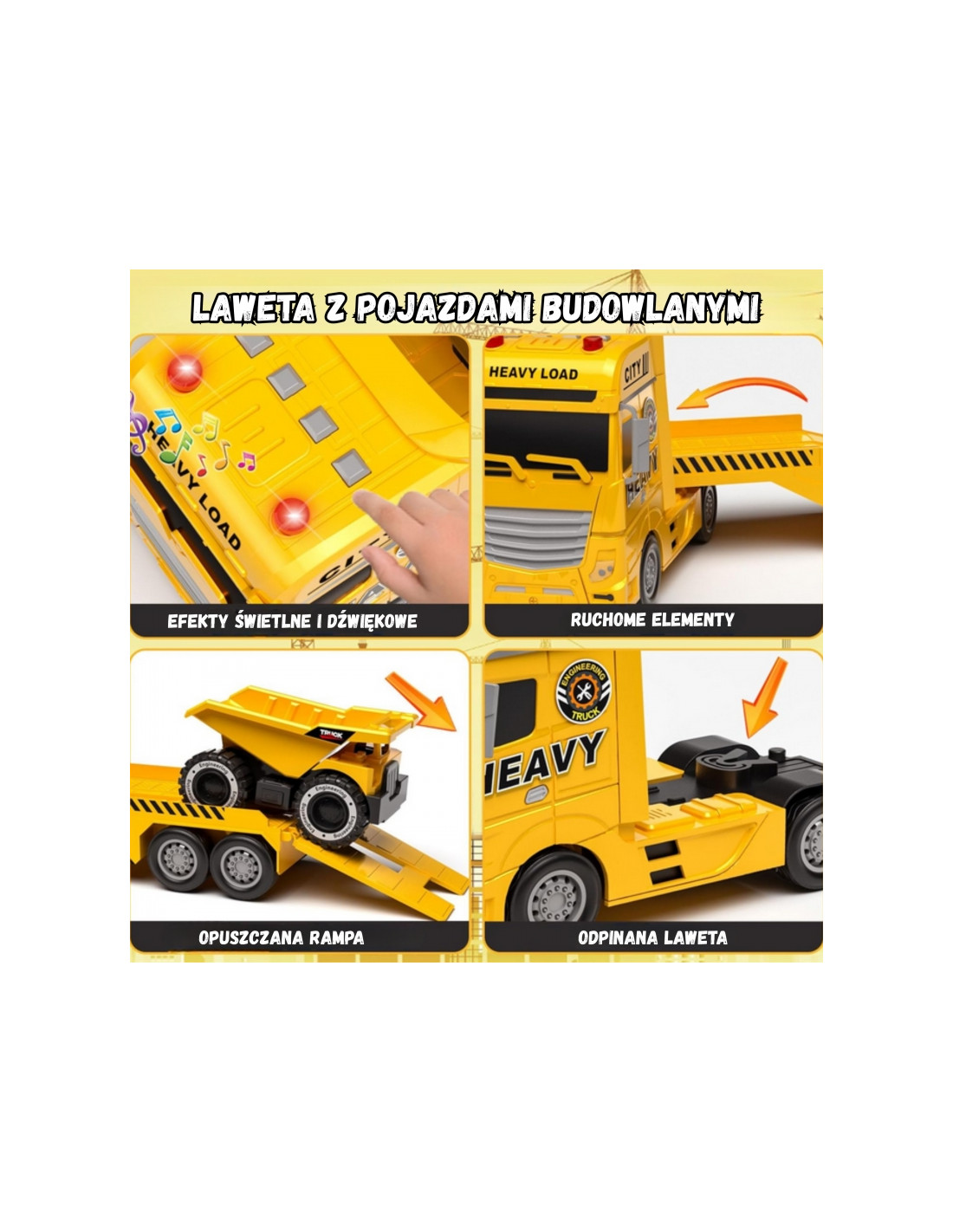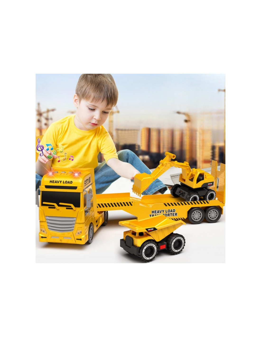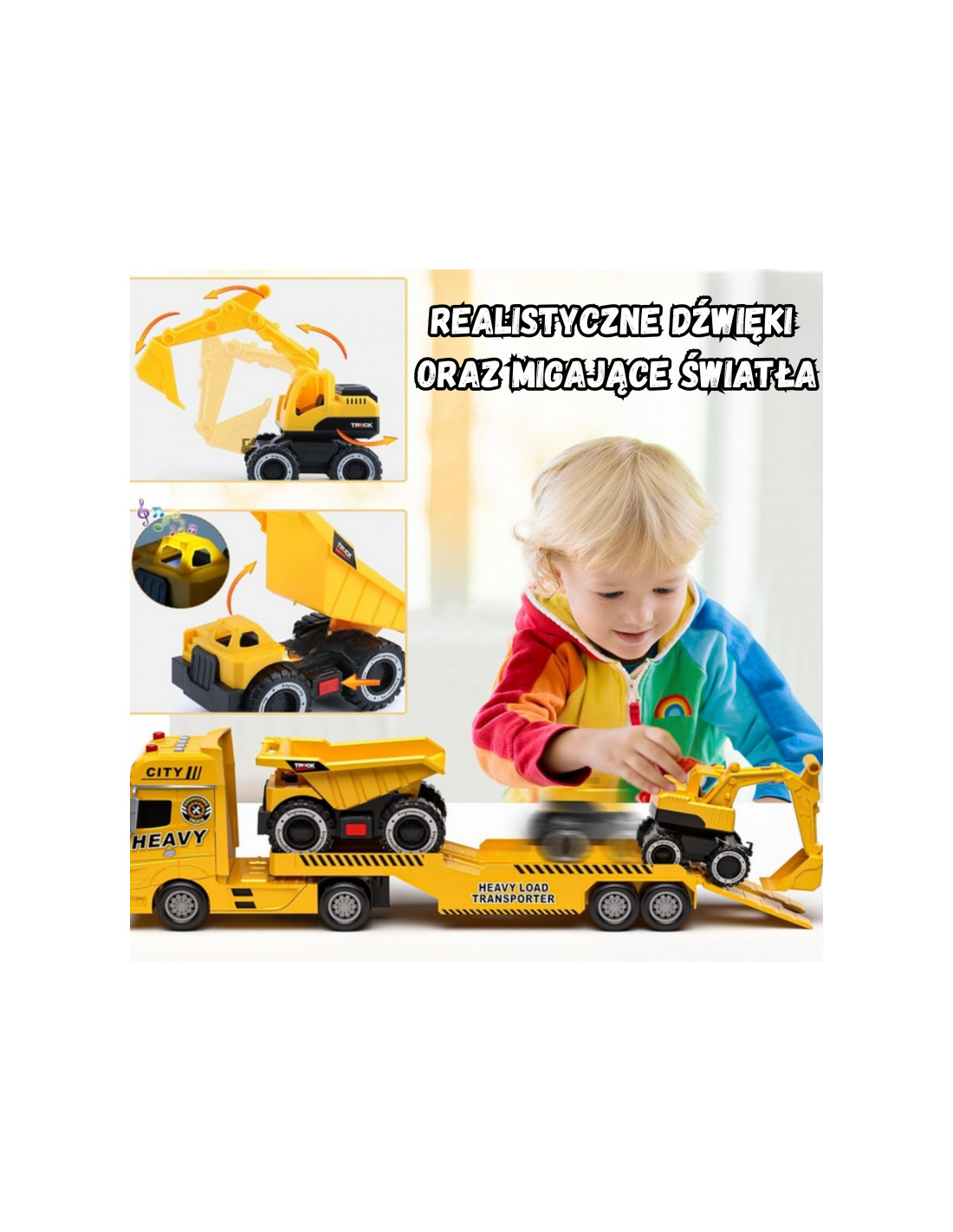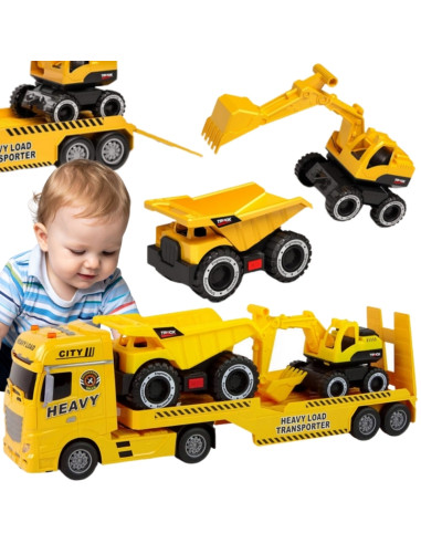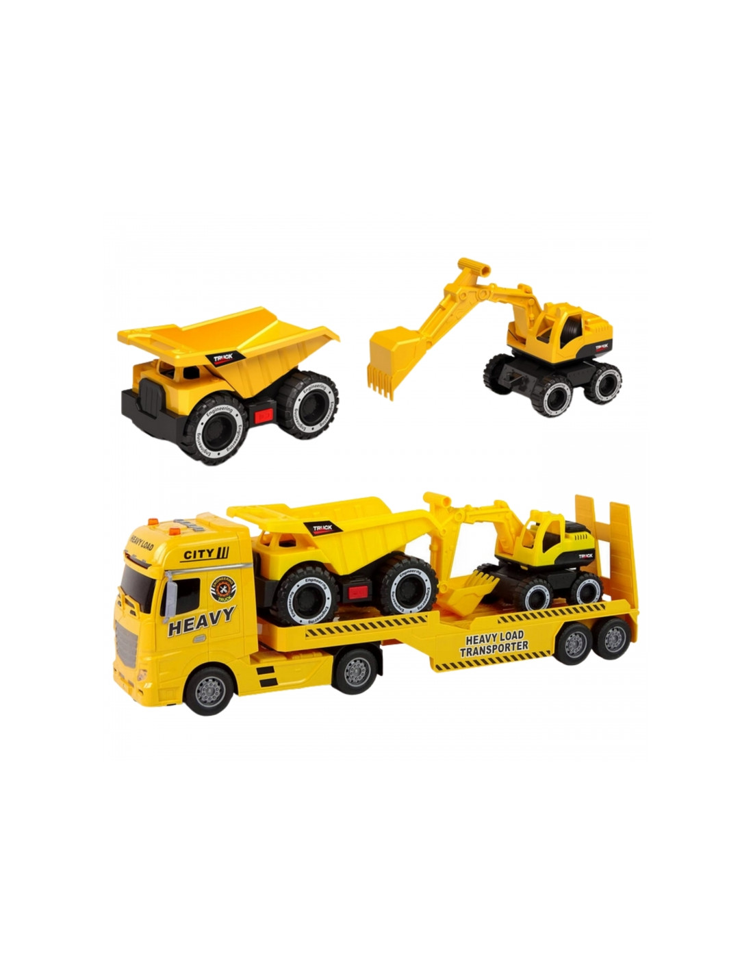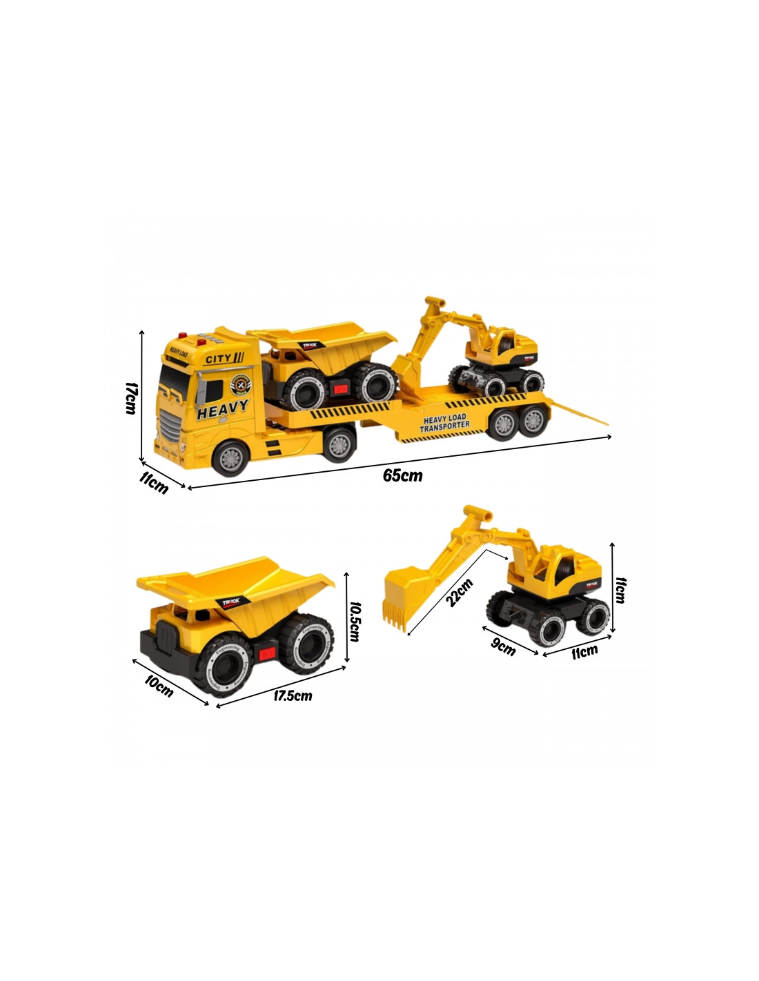 - - Į komplektą įeina 3 statybinės transporto priemonės - vilkikas, ekskavatorius ir savivartis, suteikiančios daug žaidimo galimybių