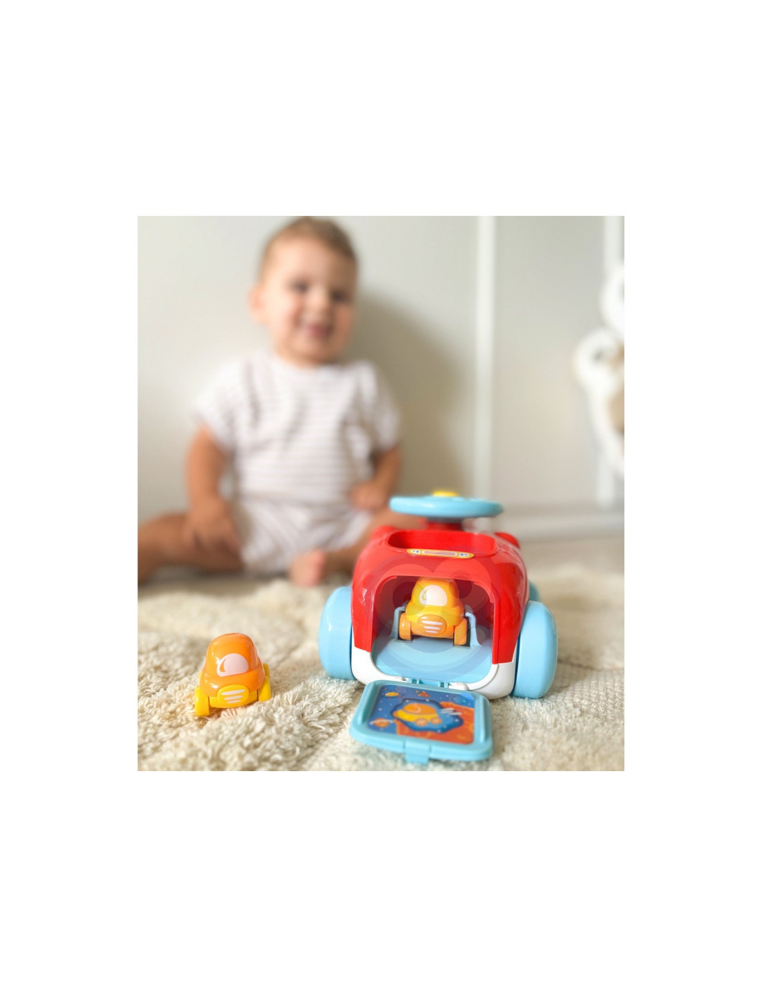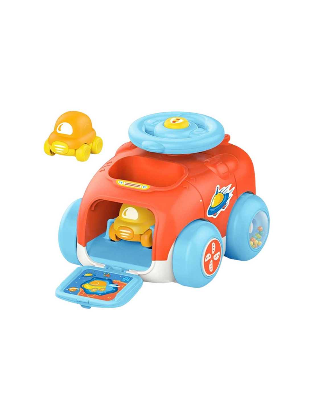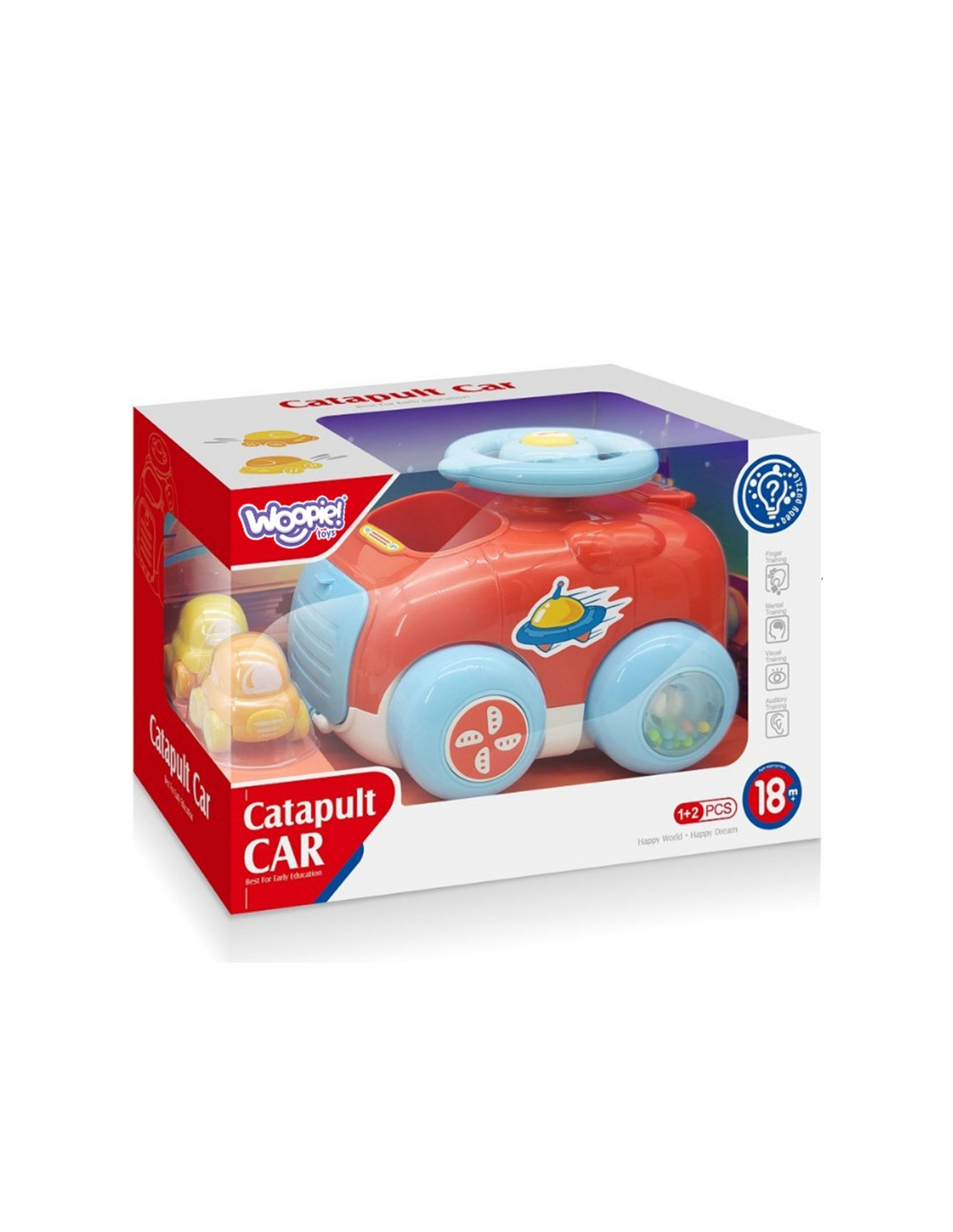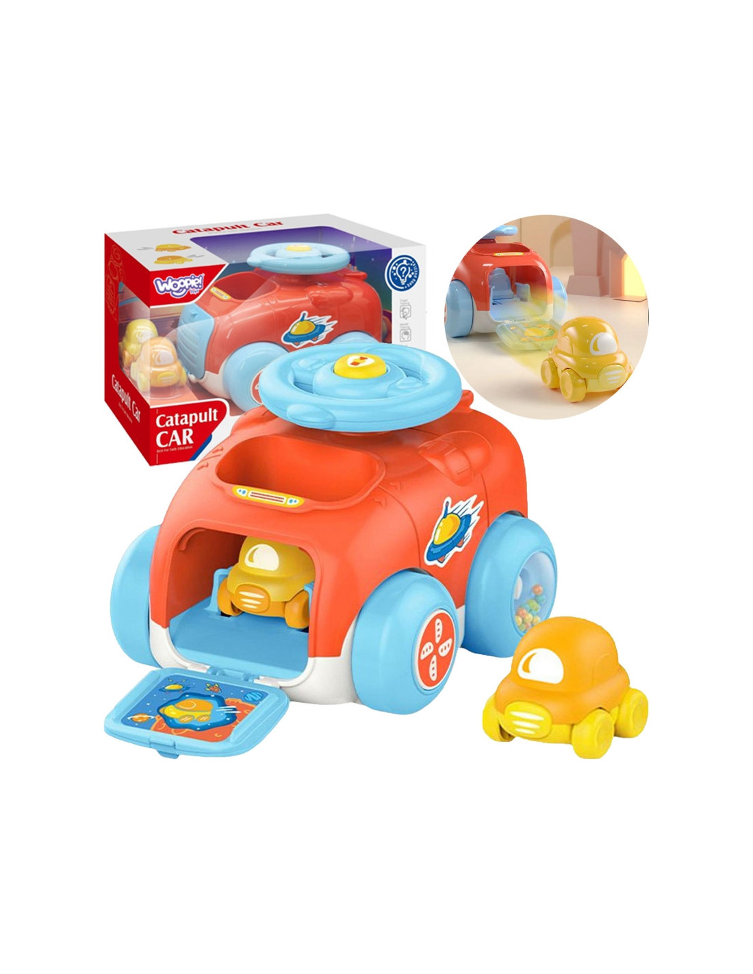 WOOPIE prekės ženklopaleidimo automobilis yra puiki idėja vaikams. Automobilio viduje yra 2 mažesnės transporto priemonės ant ratukų. Visame rinkinyje yra paleidimo įrenginys, kad pramoga būtų dar įdomesnė. Įstatykite automobilį į katapultą, pasukite vairą ir paspauskite garsinį signalą, ir jūsų automobilis iššoka iš transporto priemonės! Automobilis taip pat turi sensorinių elementų, pavyzdžiui, ratų garsus, kai jie sukasi. Puiki galimybė žaisti su draugais arba vienam.