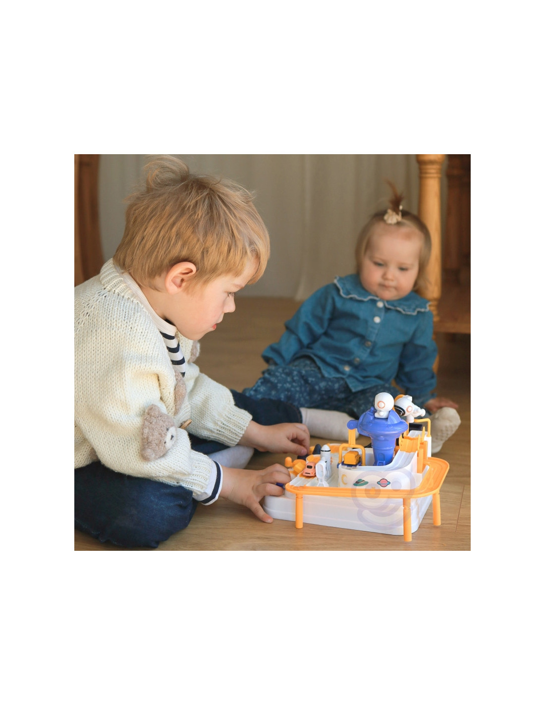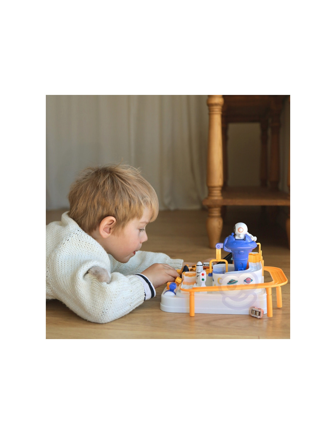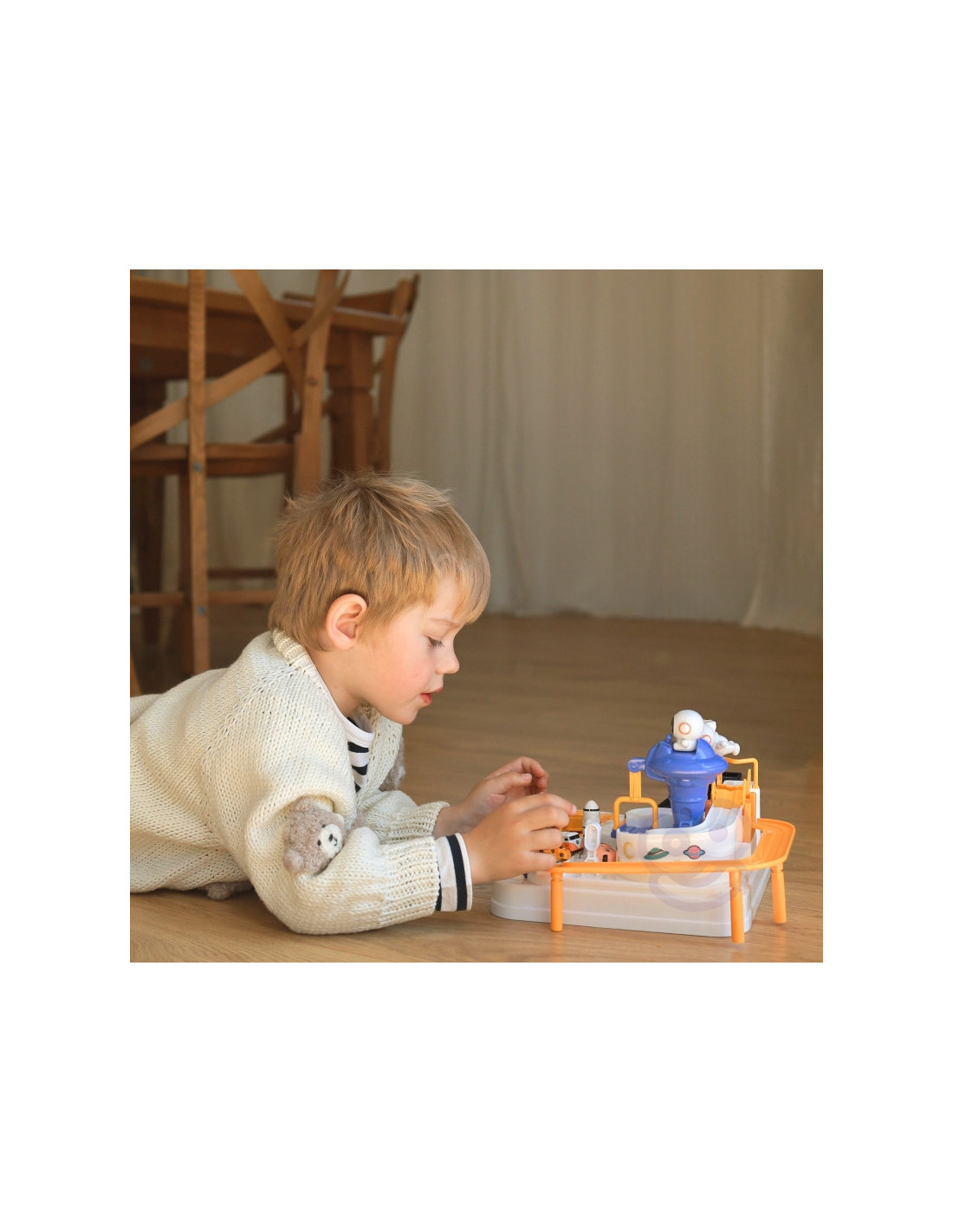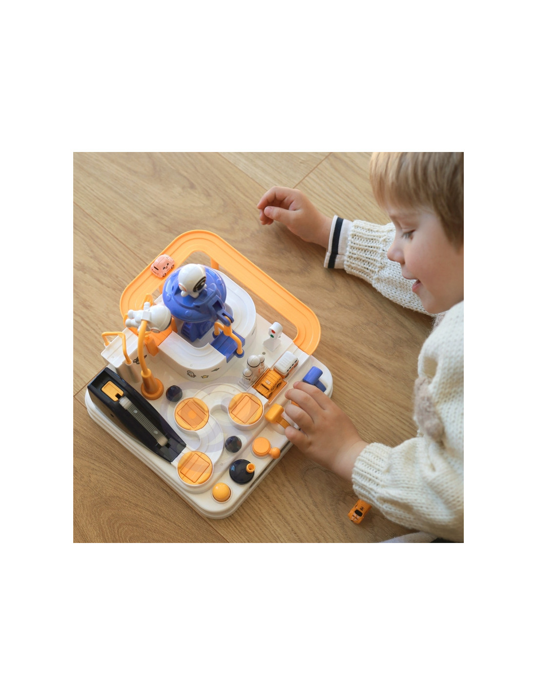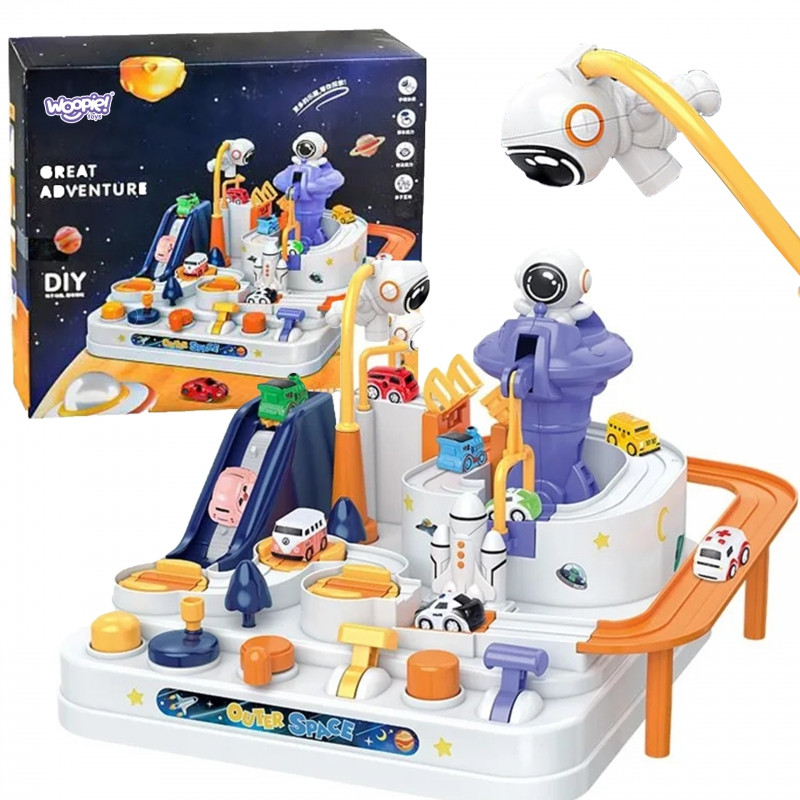 Interaktyvusis kliūčių ruožas"Astronautų nuotykiai" - nepaprasta dovana mažiesiems tyrinėtojams, norintiems įdomių nuotykių ir nepamirštamų iššūkių. Tai daugiau nei žaislas - tai tikra arena, kurioje vaikai gali atlikti vairuotojų vaidmenis ir įveikti įvairias kliūtis. Dėl sumanaus dizaino ir įvairių elementų žaislas suteikia nepamirštamų akimirkų, kupinų įspūdžių ir iššūkių. Tai ideali priemonė vaizduoteiir rankų darbo įgūdžiams lavinti, kartu suteikianti daug džiaugsmo. Automobilių trasoje galima ne tik važiuoti, bet ir naudotis dinamiškais interaktyviais elementais, kurie valdomi mygtukais ir rankenėlėmis. Tai jaudinantis žaidimas, reikalaujantis susikaupimo ir vikrumo. Rinkinyje yra trys automobiliai, kurie gali laisvai tyrinėti trasą, priklausomai nuo mažylio vaizduotės. Transporto priemonės paįvairins žaidimą arba leis vaikams varžytis trasoje. Trasos kirtimas atrodo lengvas, tačiau daugybė elementų, tokių kaip pavarų dėžės ar pakeliamieji tilteliai, pavers kelionę kupina adrenalino.