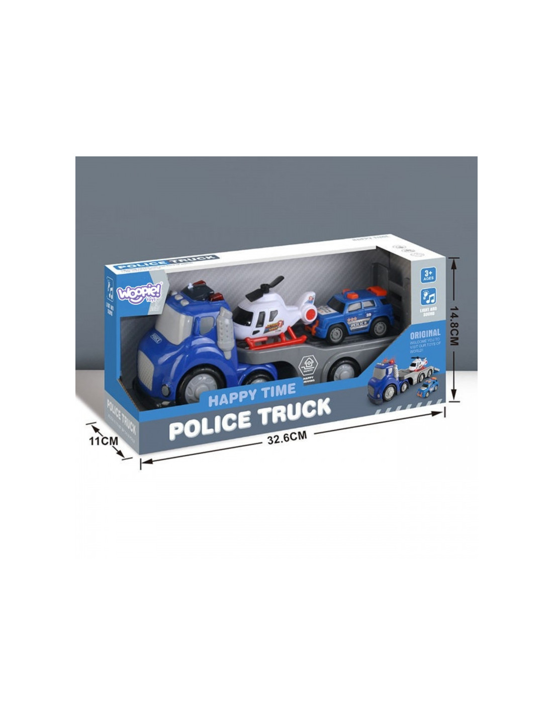 Policijos sunkvežimis iš serijos CITY TRUCK leis jūsų vaikui persikelti į policijos nuotykių pasaulį ir atlikti teisėsaugos pareigūno vaidmenį. Iš aukštos kokybės medžiagų pagamintą rinkinį sudaro didelis mėlynas sunkvežimis su priekaba, sraigtasparnis ir visureigis. Šviesos ir garso efektai padarys pramogą dar tikroviškesnę ir įdomesnę. Tai puikus rinkinys kūrybiškam žaidimui namų policijos nuovadoje arba gelbėjimo operacijoms.