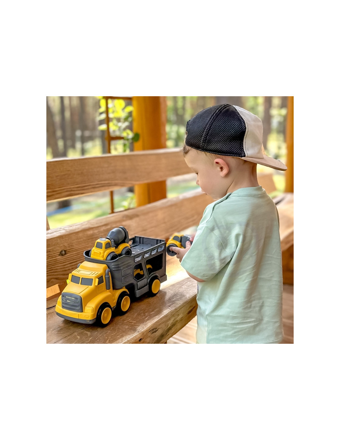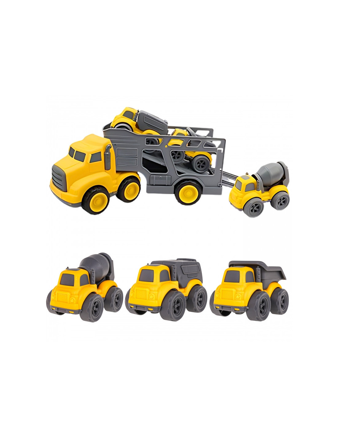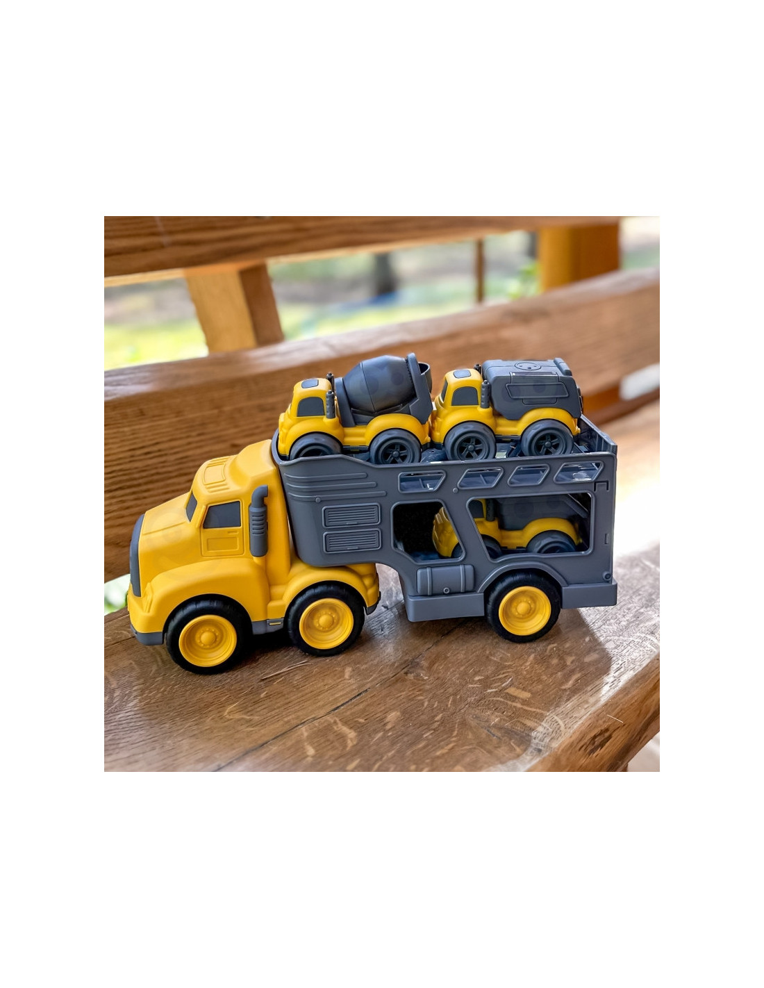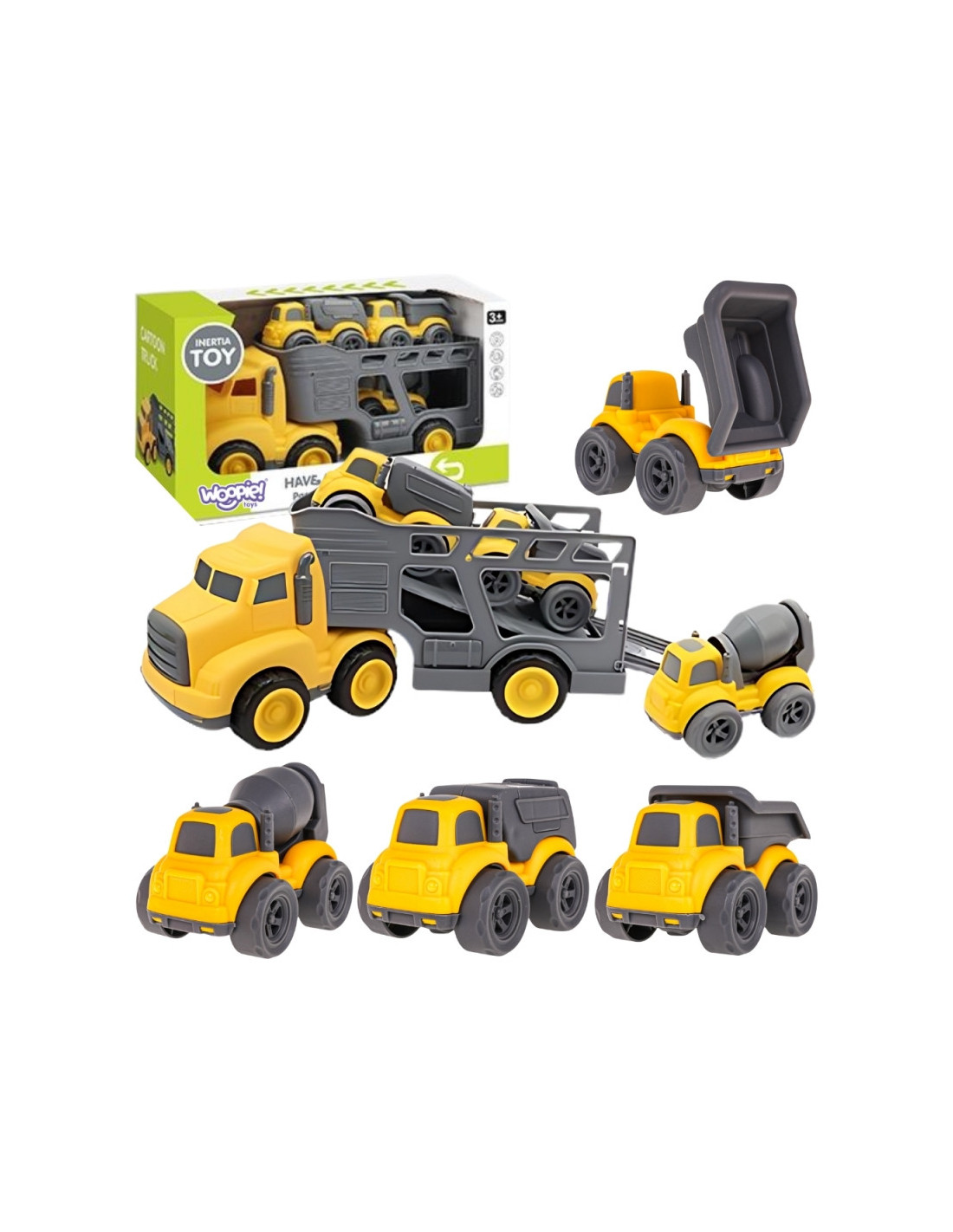 Įvažiuokite į statybų aikštelę su nepaprastu statybinių transporto priemonių rinkiniu iš prekės ženklo Woopie! Didelis sunkvežimis su priekaba veža tris mažesnes transporto priemones: savivartį, betono maišyklę ir šiukšliavežę. Kiekvienoje iš jų yra judančių elementų, todėl žaidimas tampa dar tikroviškesnis ir įtraukiantis. Rinkinys stebina tvirtu apdirbimu, ryškiomis spalvomis ir dėmesiu detalėms, todėl kiekvienam mažajam konstruktoriui garantuoja valandų valandas kūrybinių pramogų.