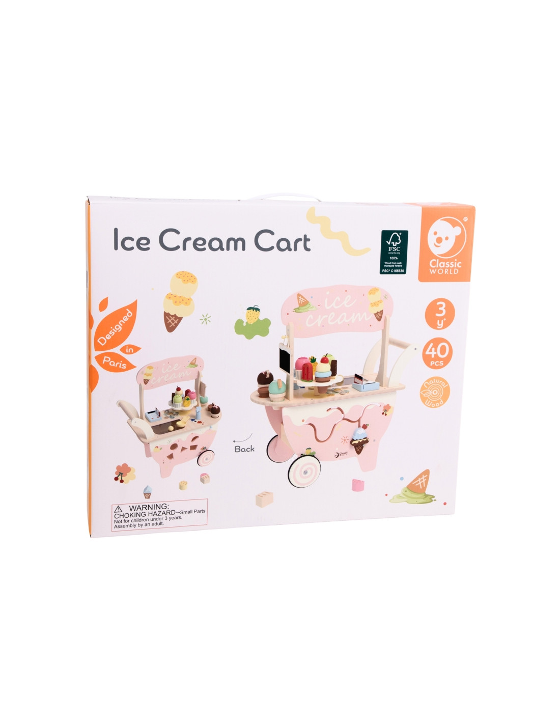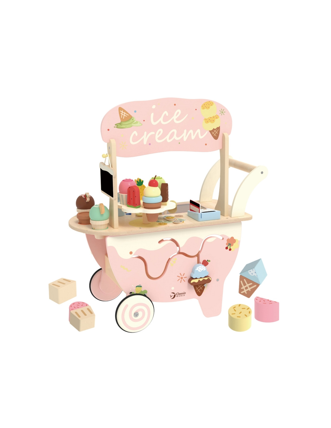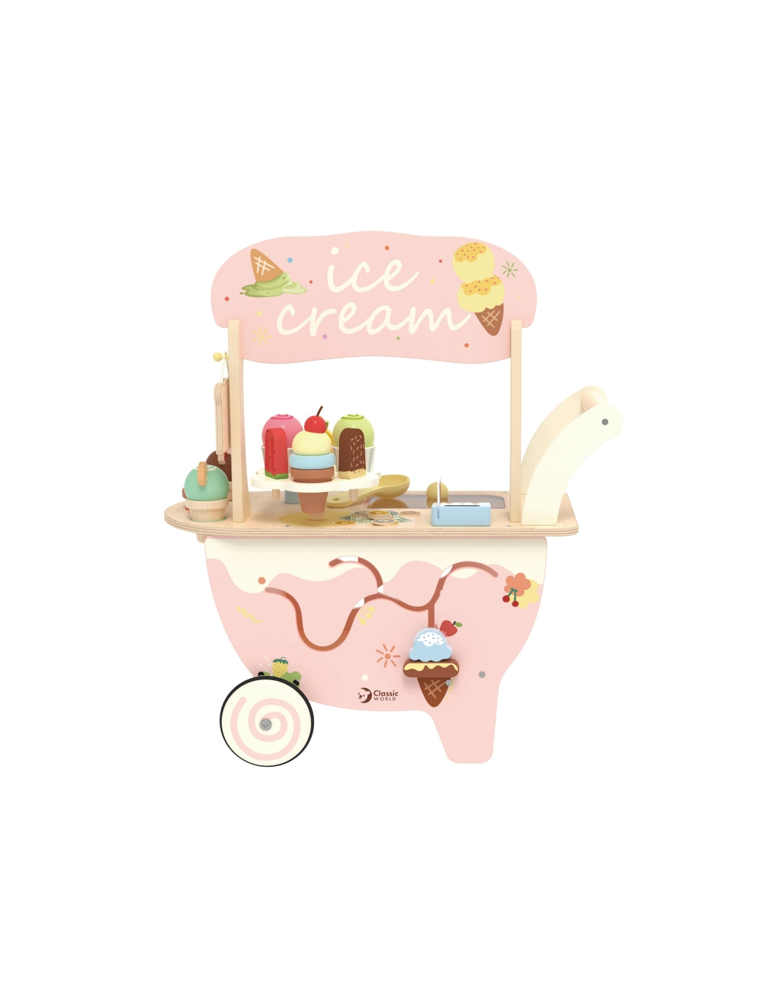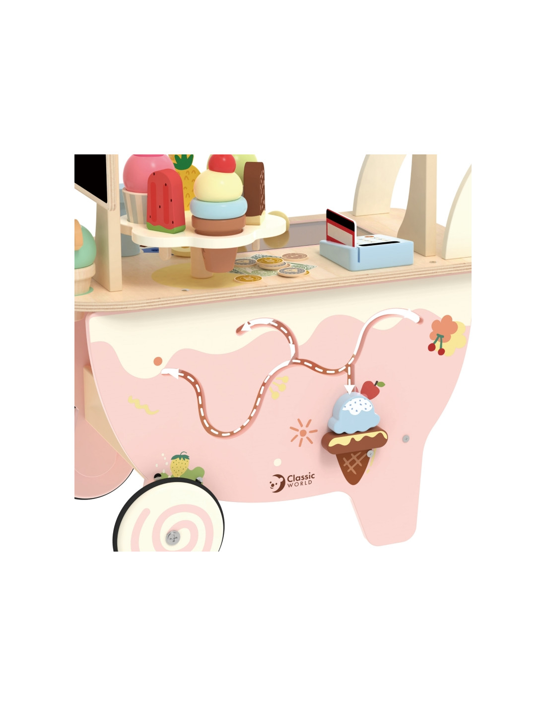 Paverskite savo vaiko kambarį saldžia ledaine! Šis medinis ledų pardavėjo vežimėlis iš „Classic World“ yra unikalus žaislas – jis atlieka ir lavinamojo žaislo, ir ledainės funkciją. Turėdamas platų priedų asortimentą, jūsų mažylis gali patiekti skirtingų skonių ledus, lavindamas kūrybiškumą ir socialinius įgūdžius. Puikiai tinka vaikams, kurie mokosi vaikščioti ir mėgsta vaidmenų žaidimus.