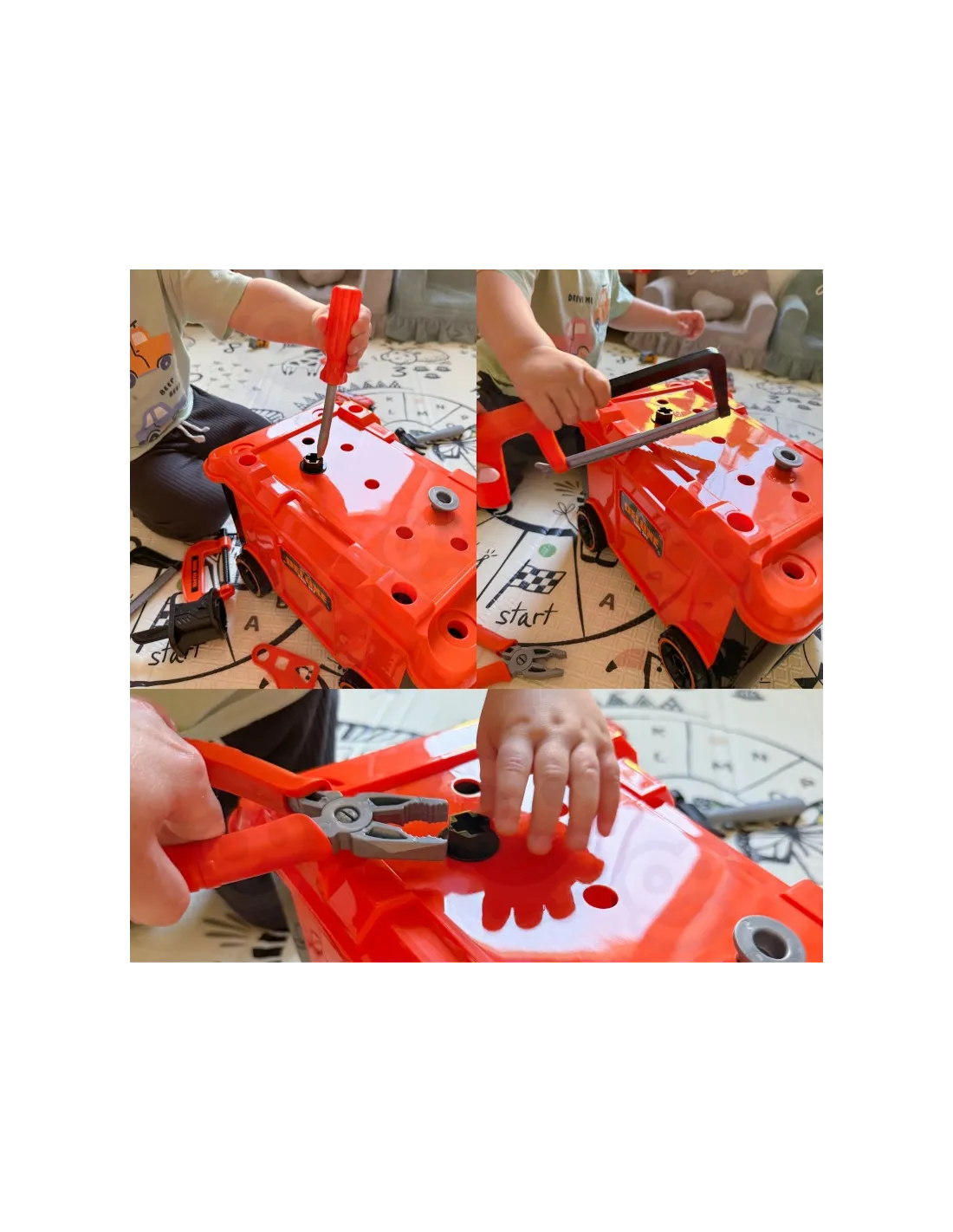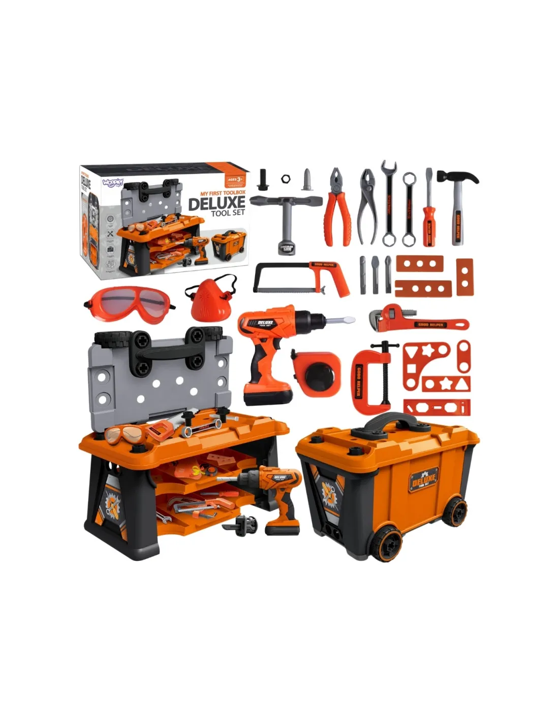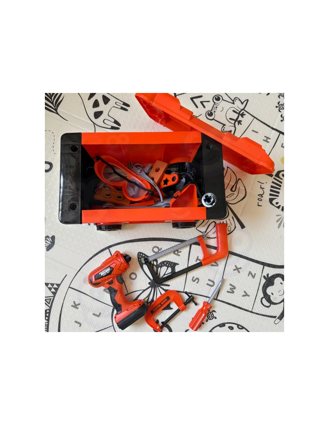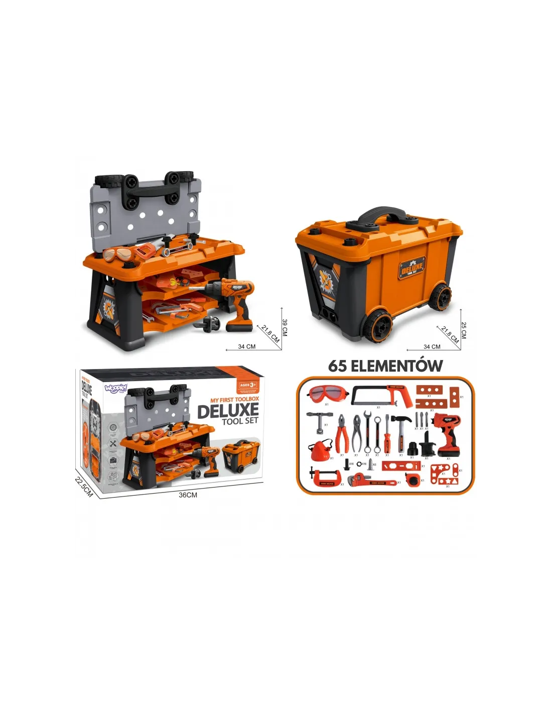 Mobili įrankių dėžė "Dirbtuvės 2in1" Pagaminta iš tvirto plastiko su oranžiniais, juodais ir pilkais elementais, ji lengvai ir saugiai leidžia vaikams atlikti tikro profesionalo vaidmenį. Šis funkcionalus 2 in 1 rinkinys yra ne tik dirbtuvės, bet ir lagaminas ant ratukų, kuris taps mėgstamiausiu žaidimų draugu. Šis praktiškas rinkinys skatina kūrybišką žaidimą vaidmenimis ir leidžia vaikams per žaidimą lavinti rankų darbo įgūdžius.