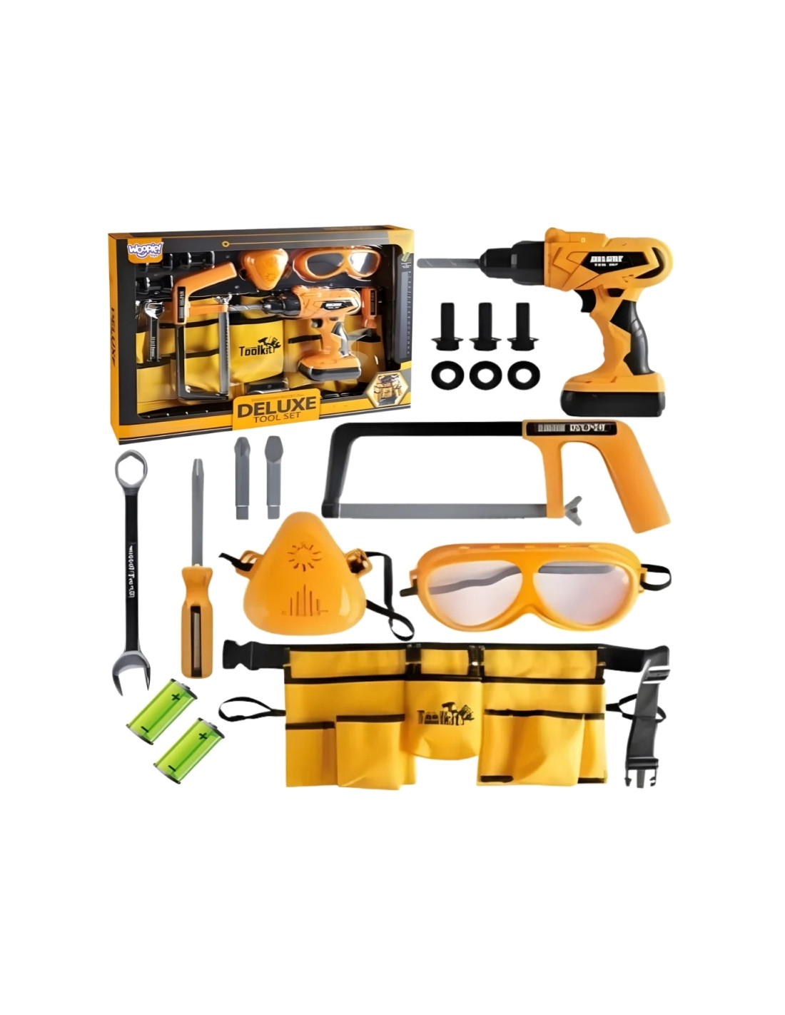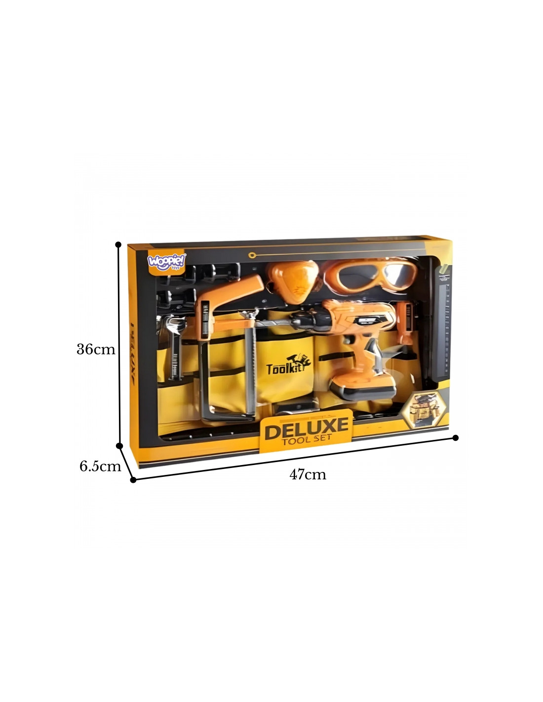" WOOPIE" mažojo meistro įrankių rinkinys - tai pilnas įrankių rinkinys, skirtas statybų pramogoms: apsauginiai akiniai, įrankių diržas, akumuliatorinis atsuktuvas, įrankiai ir statybinės kaladėlės, skatinantys vaizduotę ir kūrybišką "pasidaryk pats" žaidimą. Tikroviški žaislo efektai ir tvirtumas suteikia autentiškumo ir užtikrina valandų valandas smagių pramogų.