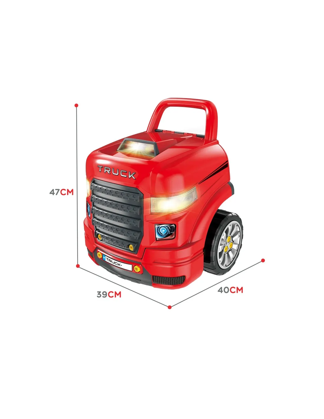 - - žaislas veiksmingai imituoja priekinę sunkvežimio dalį su pakeliamu variklio dangčiu, vairu ir prietaisų skydeliu,