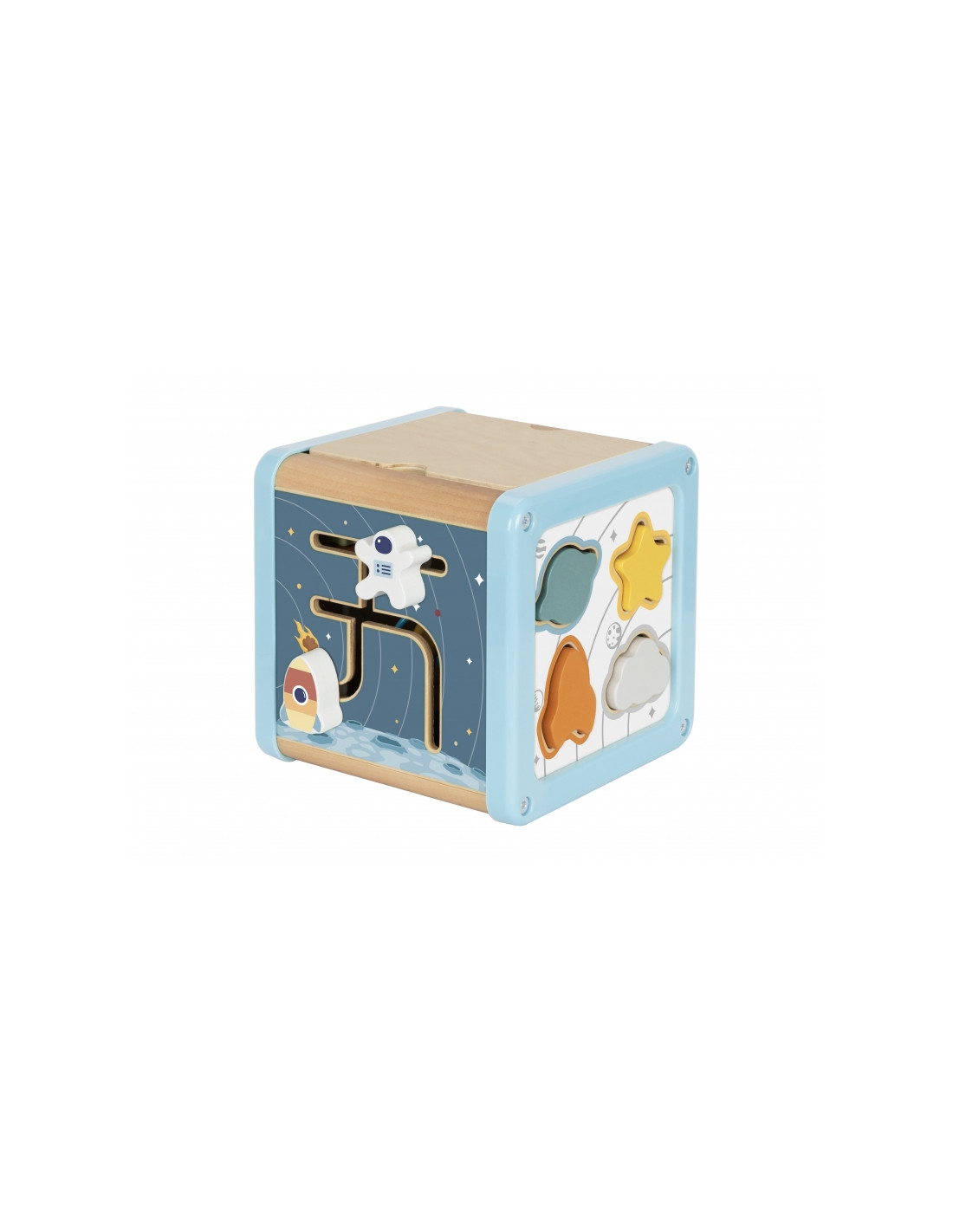Medinis kosmoso veiklos kubas iš Tooky Toy yra išsamus, lavinamasis rinkinys švelnių pastelinių spalvų. Veiklos kubas yra daugiapusis , kiekvienoje pusėje yra įvairių interaktyvių skydelių. Jame yra krumpliaračiai, rūšiavimo kaladėlės ir slankikliai, kurie ne tik skatina vaikų smalsumą, bet ir lavina smulkiąją motoriką. Karoliukų labirintas yra puiki priemonė vaikų akių ir rankų koordinacijai lavinti . Labirinto dalį galima laikyti kubo viduje, kad būtų lengva laikyti.