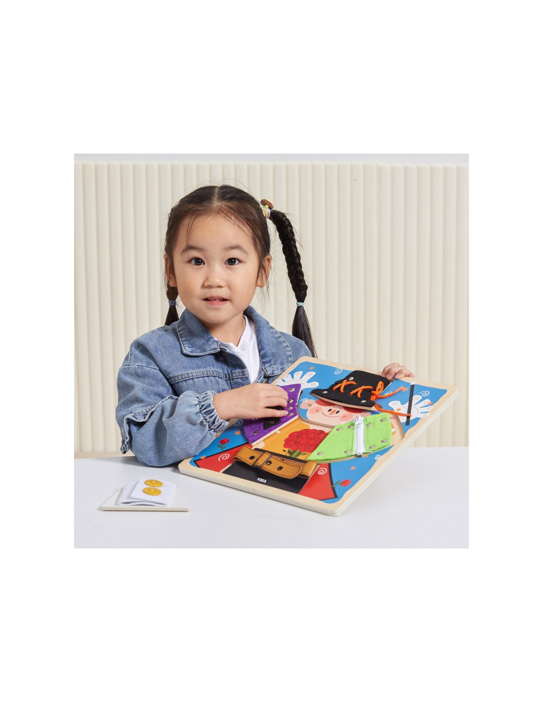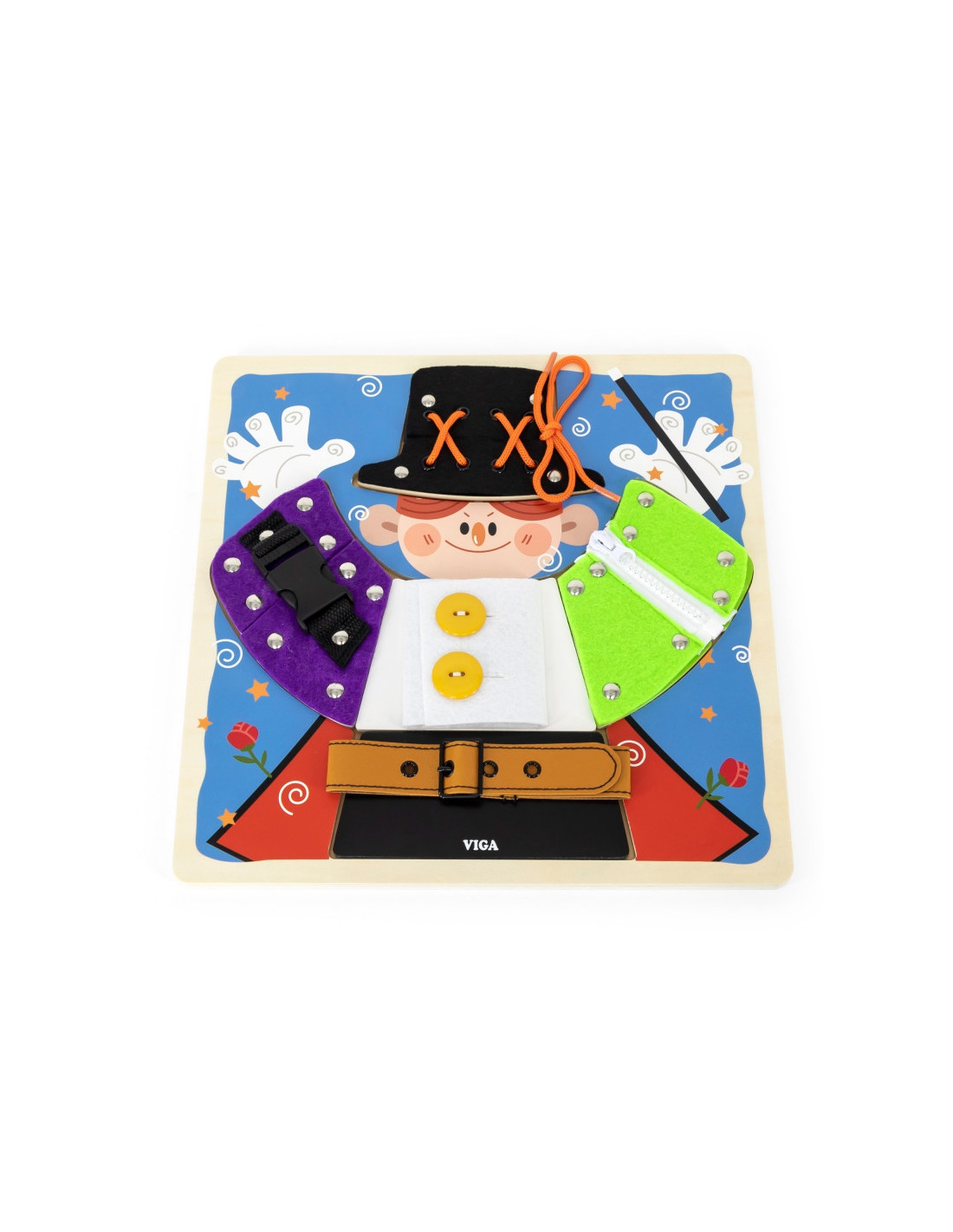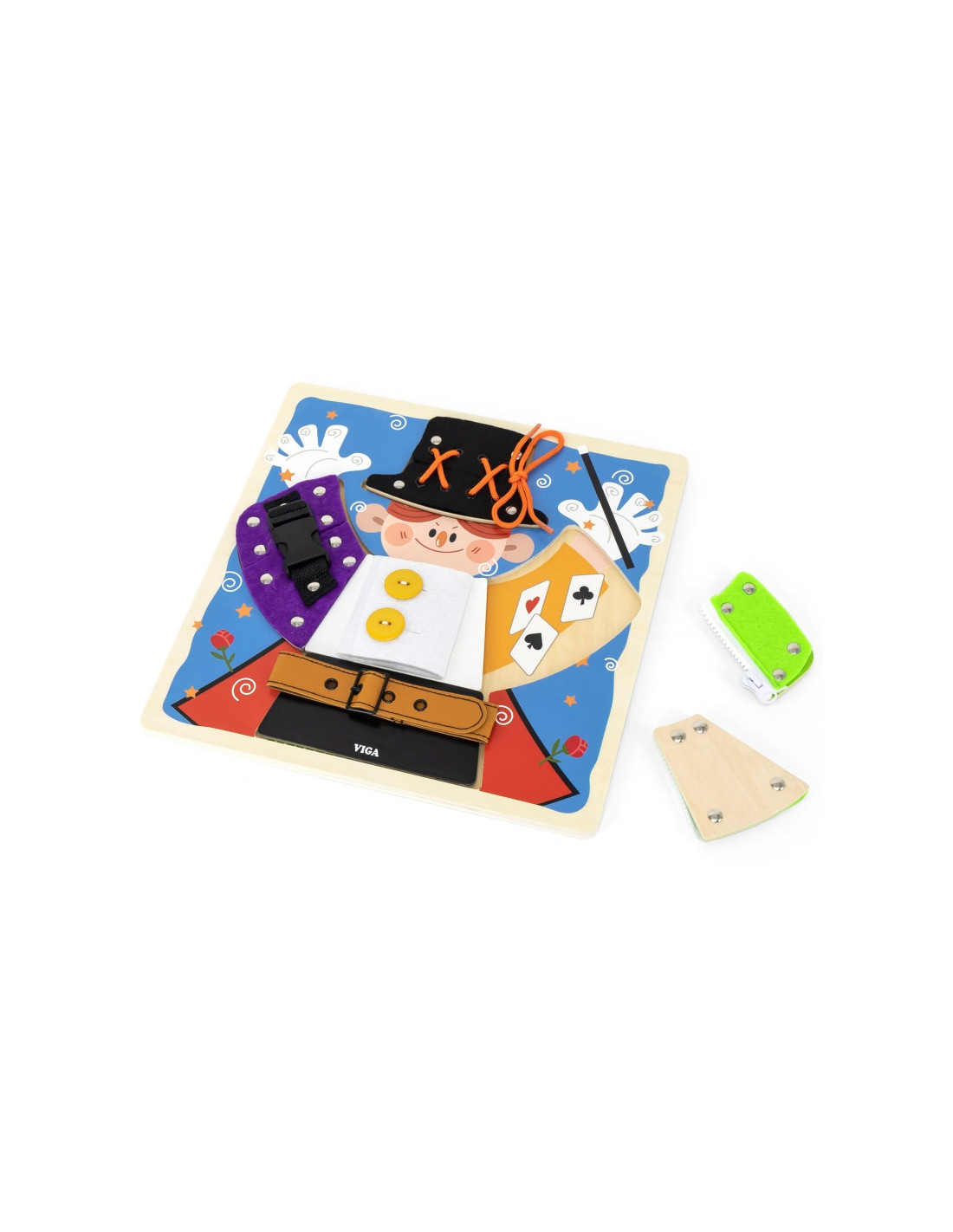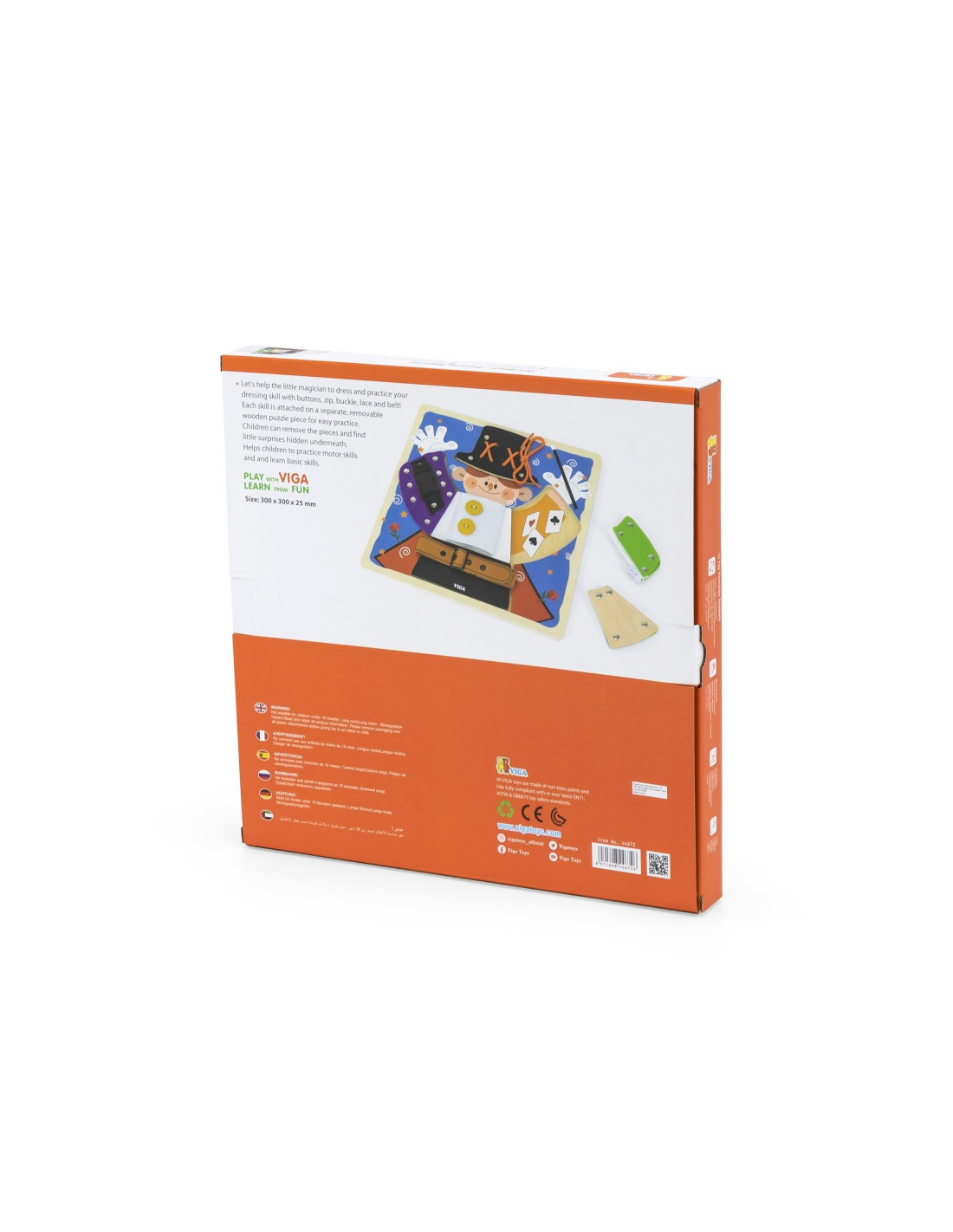 VIGA mago manipuliacinė lenta padės lavinti savarankiško rengimosi įgūdžius. Žaisdami persirengimo žaidimus, vaikai išmoks apsirengimo pagrindų, tokių kaip raištelių varstymas, užtrauktukų, sagų, spaudžių ir sagčių užsegimas . Kiekvienai iš šių veiklų manipuliacinėje lentoje yra atskira mažojo mago drabužių dalis, kurią galima praktikuoti atskirai. Po šiomis dalimis paslėpti mago triukų elementai: zuikutis, korta, balandis ir gėlių puokštė, todėl lentas galima naudoti ir atminties žaidimui.