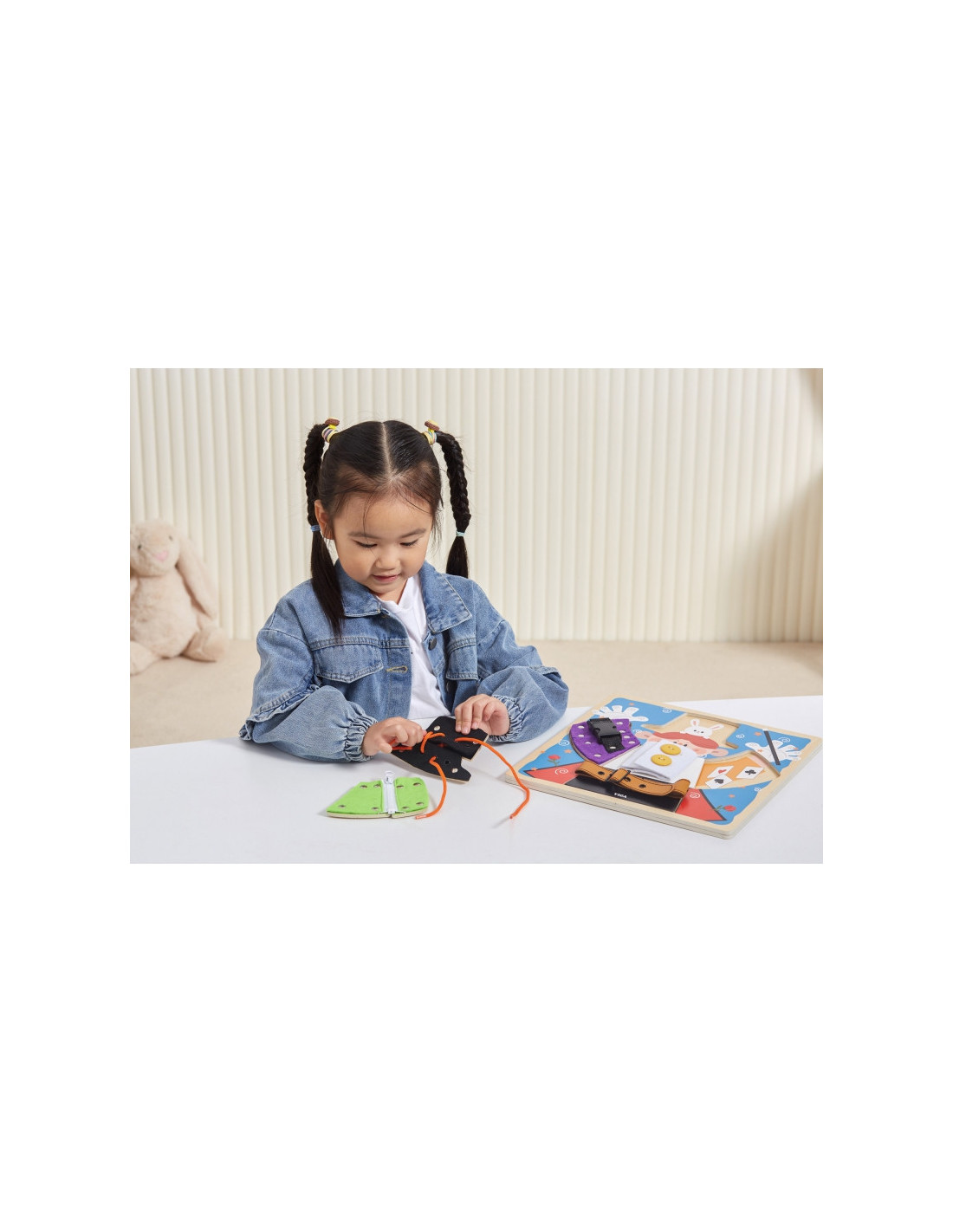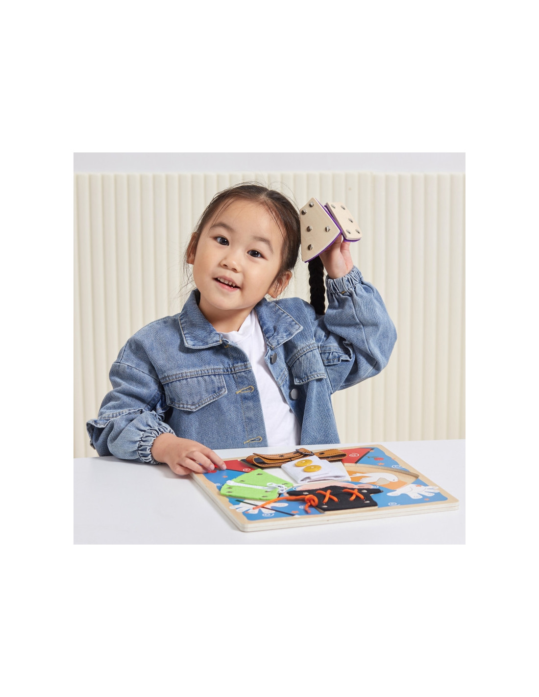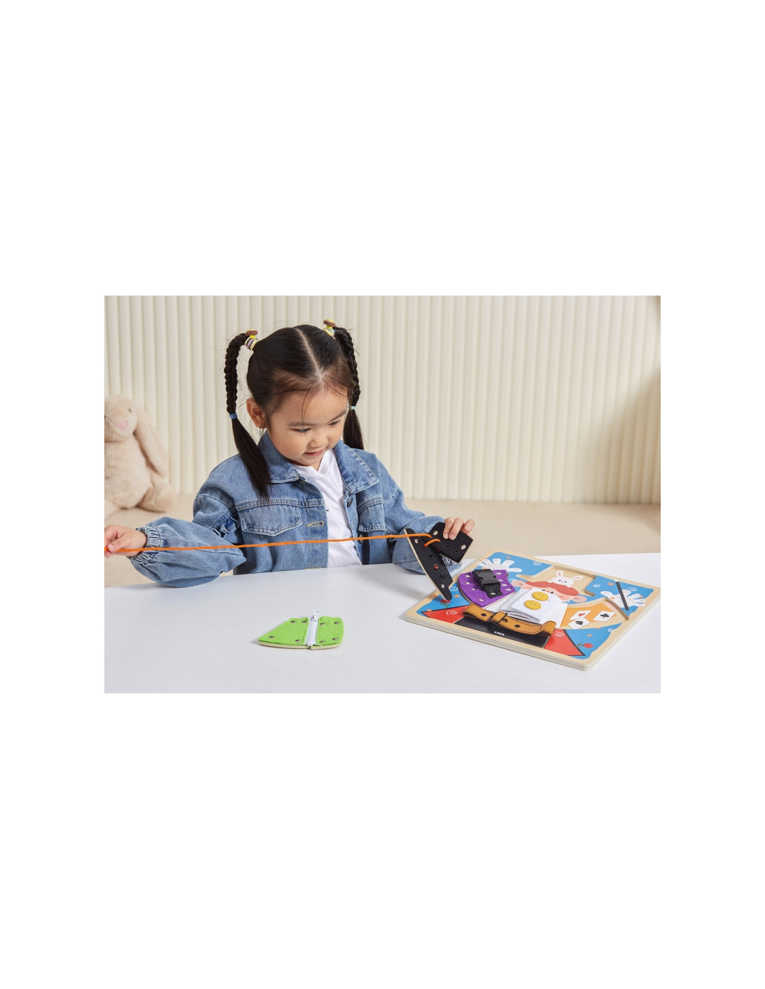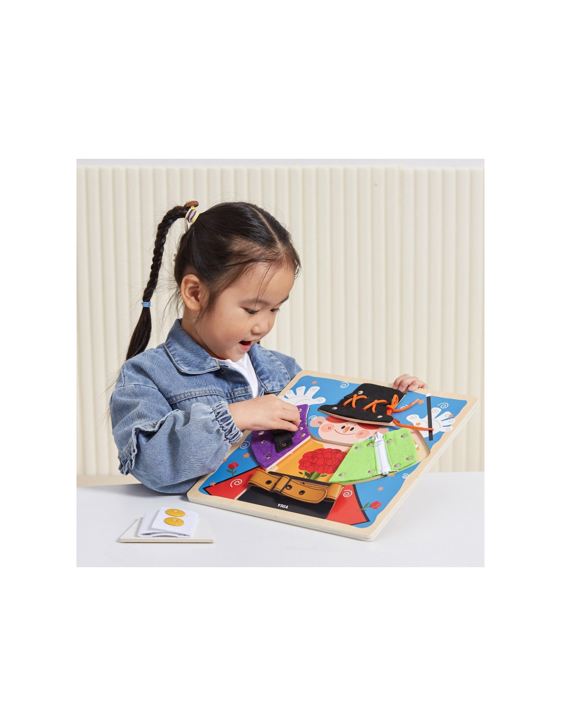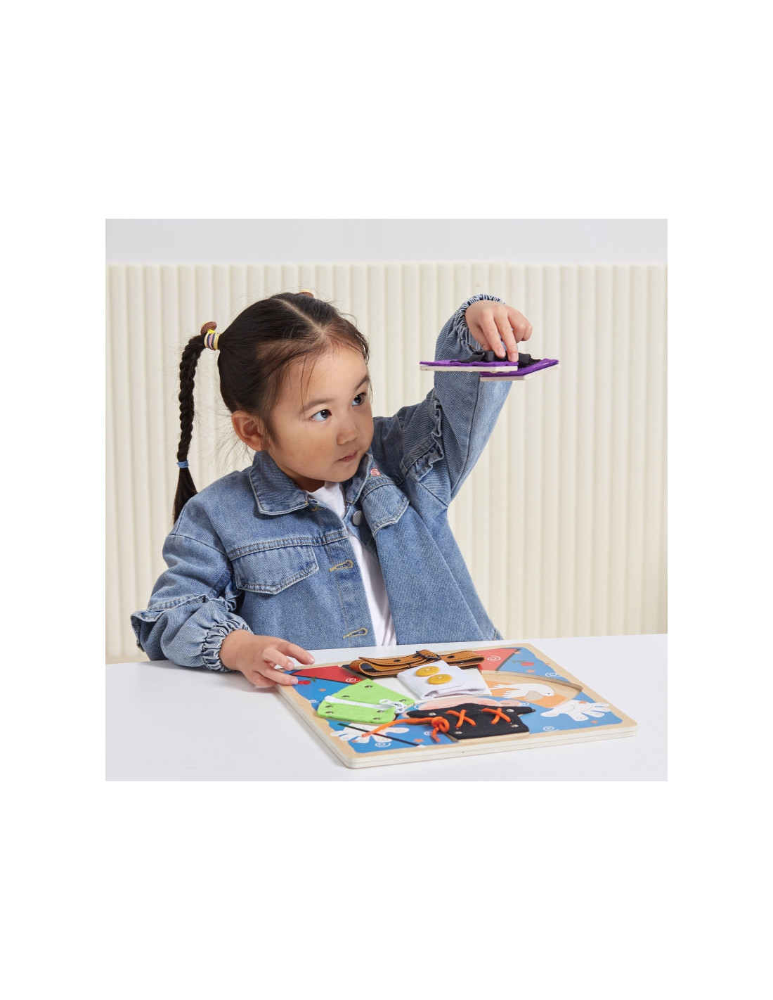 VIGA mago manipuliacinė lenta padės lavinti savarankiško rengimosi įgūdžius. Žaisdami persirengimo žaidimus, vaikai išmoks apsirengimo pagrindų, tokių kaip raištelių varstymas, užtrauktukų, sagų, spaudžių ir sagčių užsegimas . Kiekvienai iš šių veiklų manipuliacinėje lentoje yra atskira mažojo mago drabužių dalis, kurią galima praktikuoti atskirai. Po šiomis dalimis paslėpti mago triukų elementai: zuikutis, korta, balandis ir gėlių puokštė, todėl lentas galima naudoti ir atminties žaidimui.