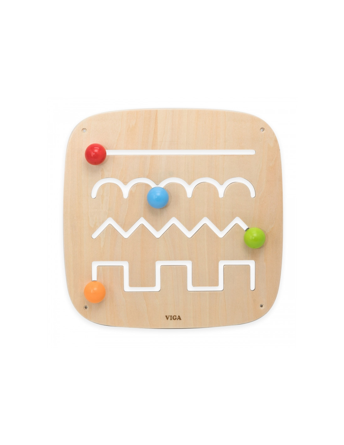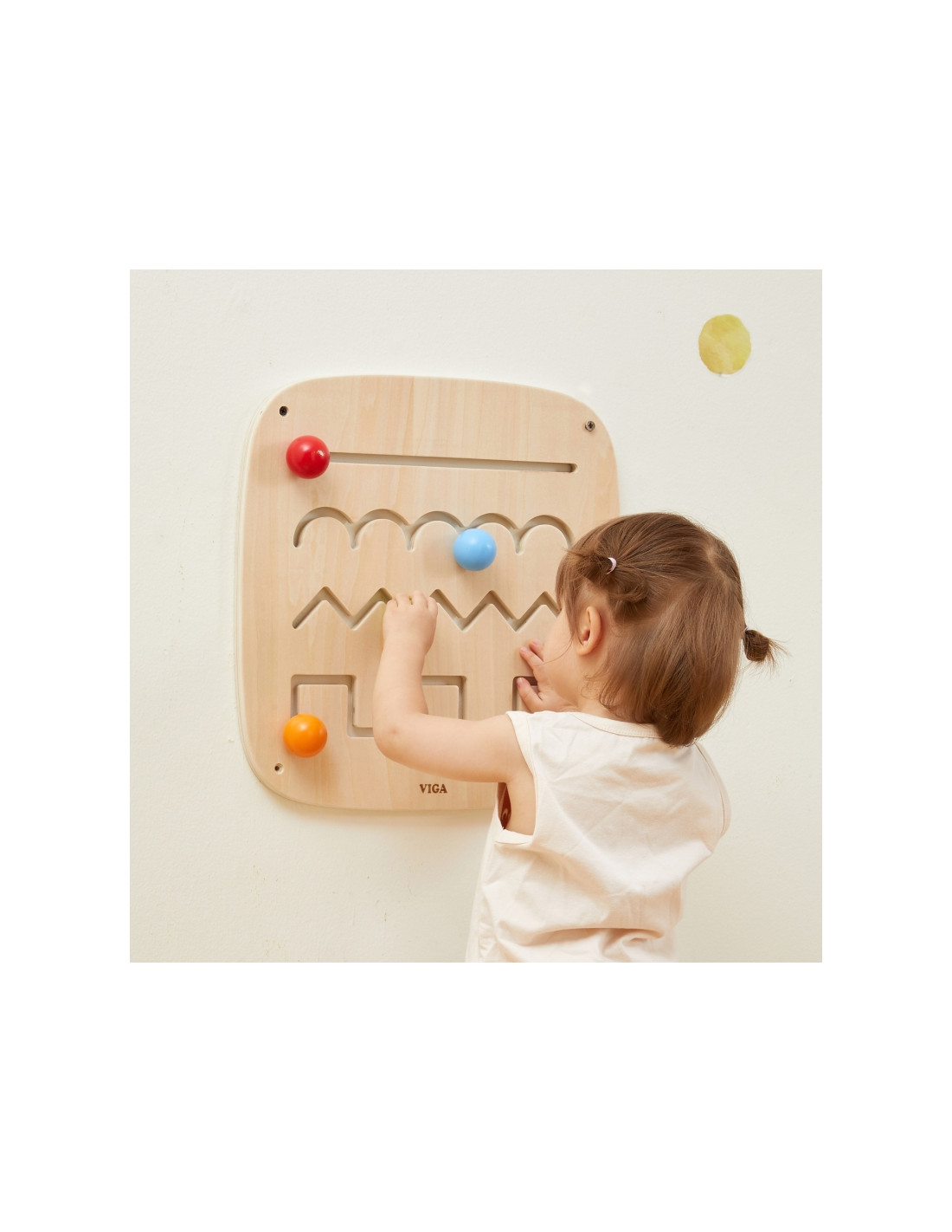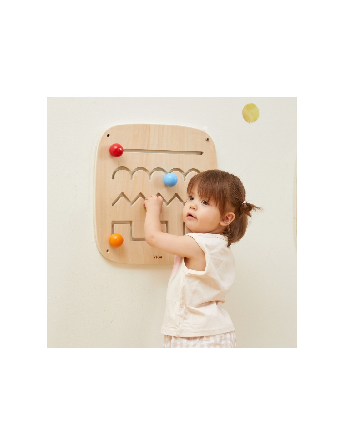 Ši medinė manipuliacinė lenta yra puiki mokymosi priemonė žaidimui, skirta 12 mėnesių ir vyresniems mažyliams. Ji padeda lavinti akių ir rankų koordinaciją bei smulkiąją motoriką, interaktyviai supažindindama mažylius su įvairių linijų ir formų pasauliu. Lentoje yra keturios slankiojančios trasos su skirtingais raštais – tiesios, banguotos, zigzago ir kaladėlės formos. Prie kiekvienos trasos pridedamas spalvingas kamuoliukas su lengvai suimama rankena, skirta mažoms rankytėms. Judindami kamuoliukus, vaikai atranda skirtingas linijų savybes, lavina atpažinti spalvas ir mokosi tokių sąvokų kaip kampai ir kreivės. Lentą lengva pritvirtinti prie sienos, o tvirta medinė konstrukcija užtikrina patvarumą ir saugumą žaidimo metu.