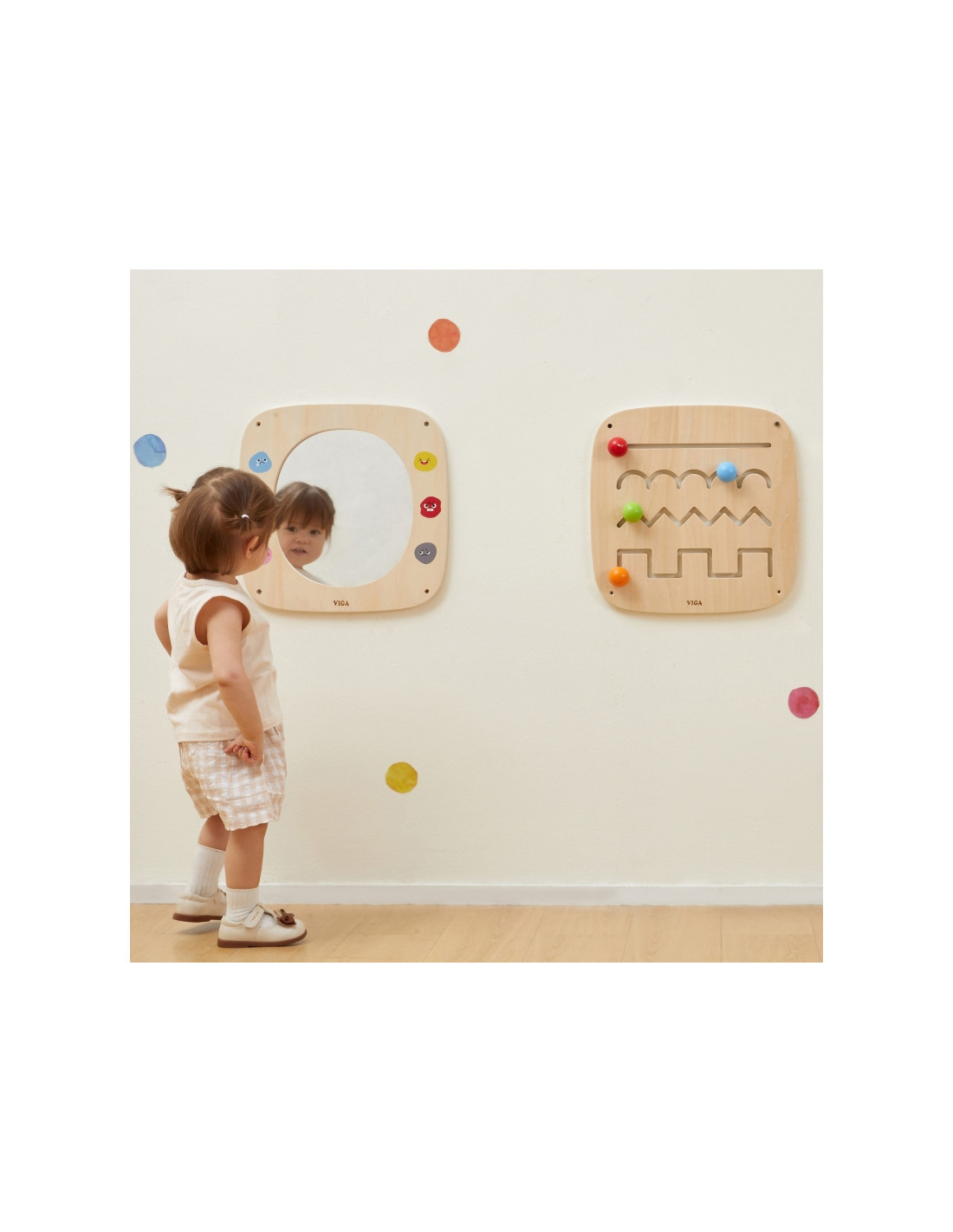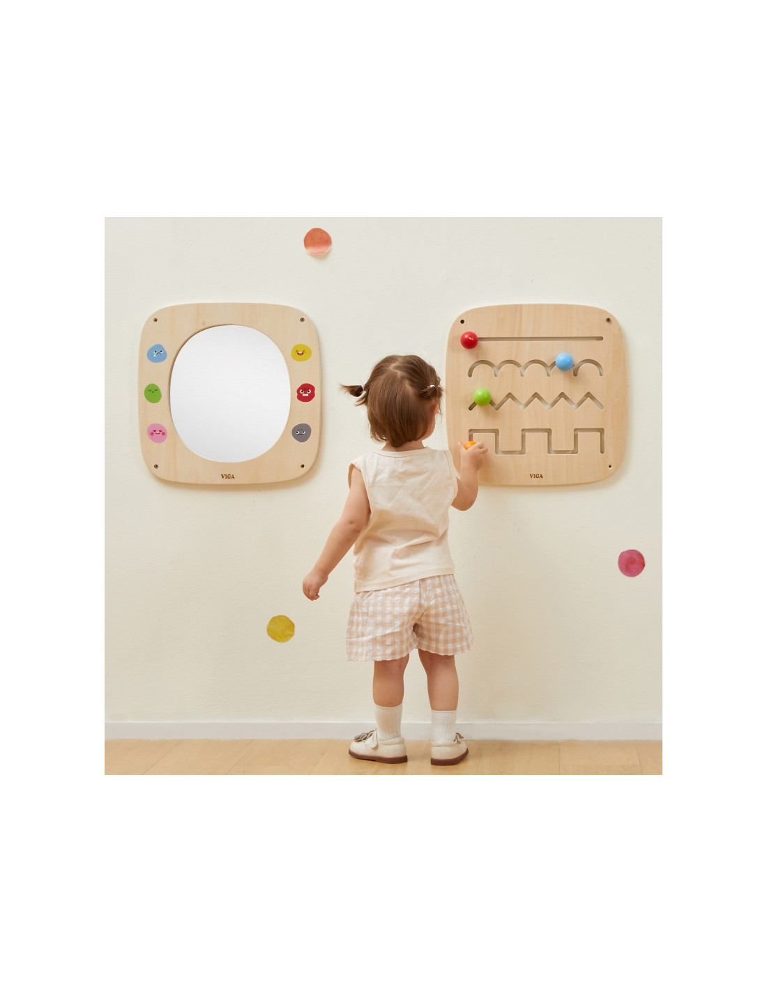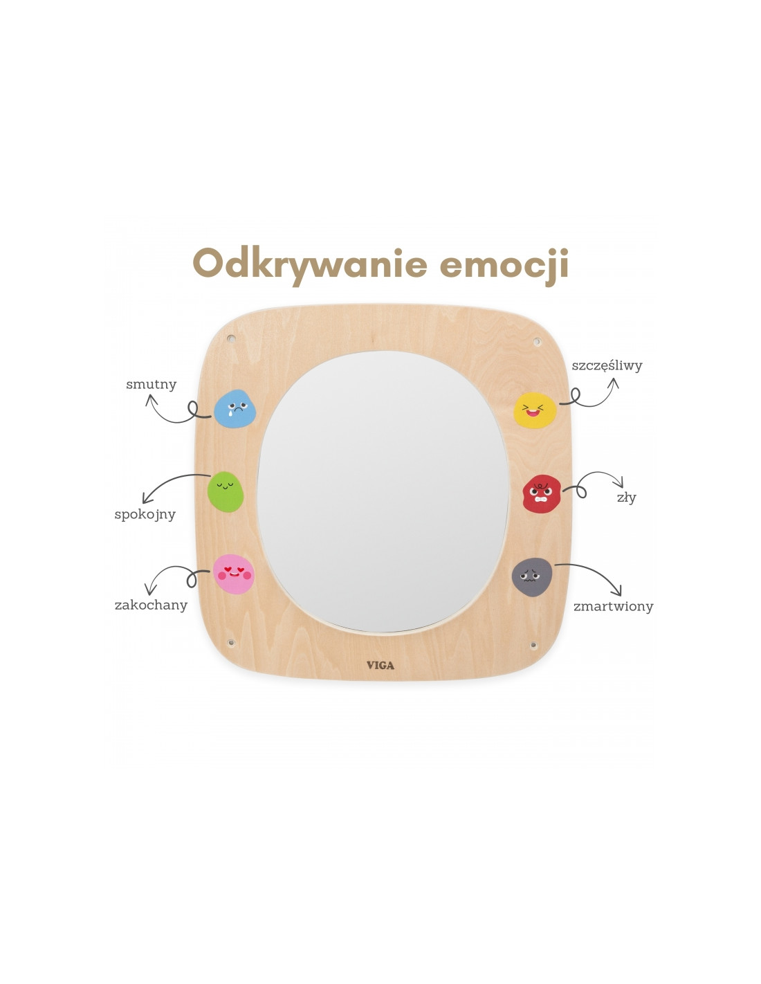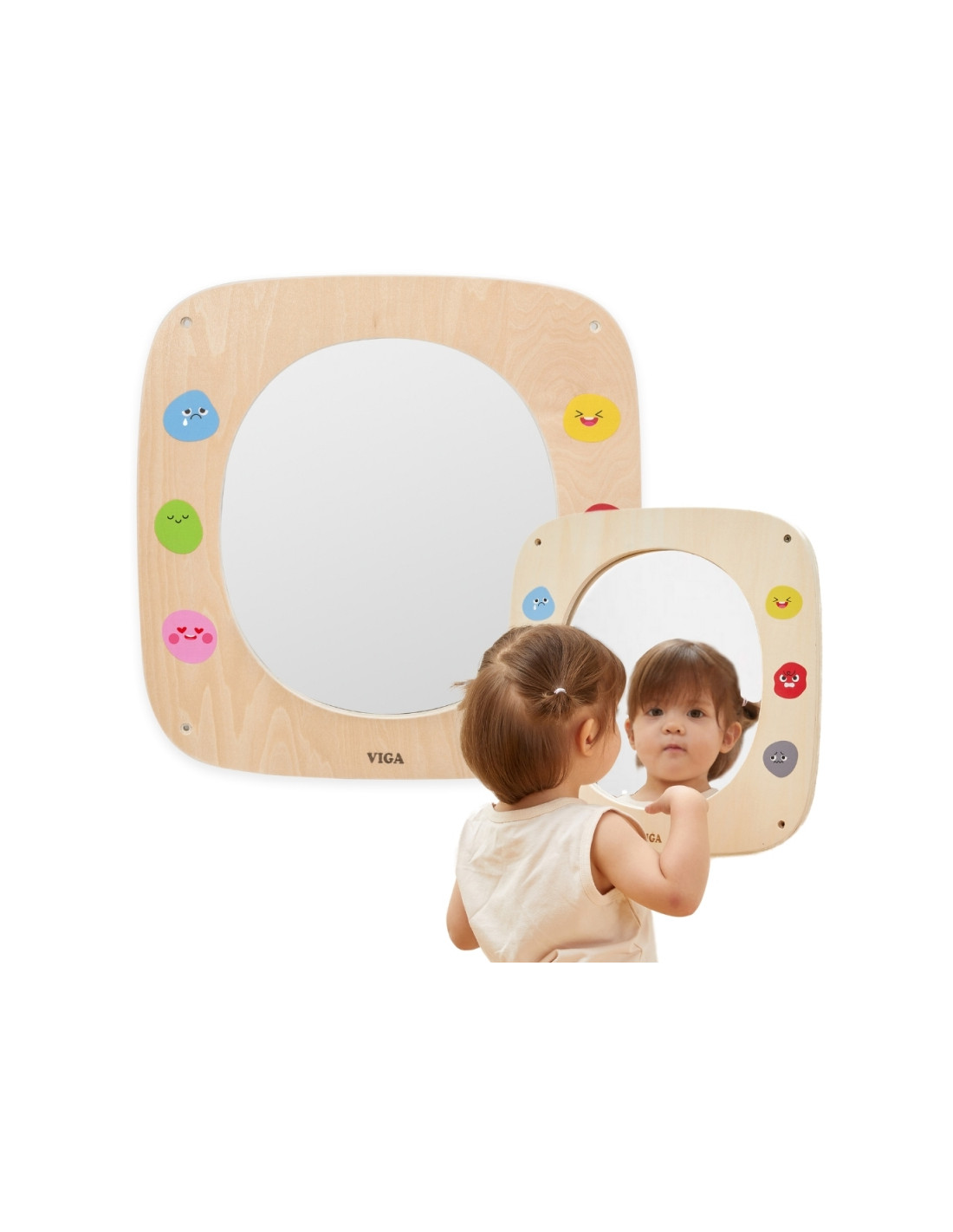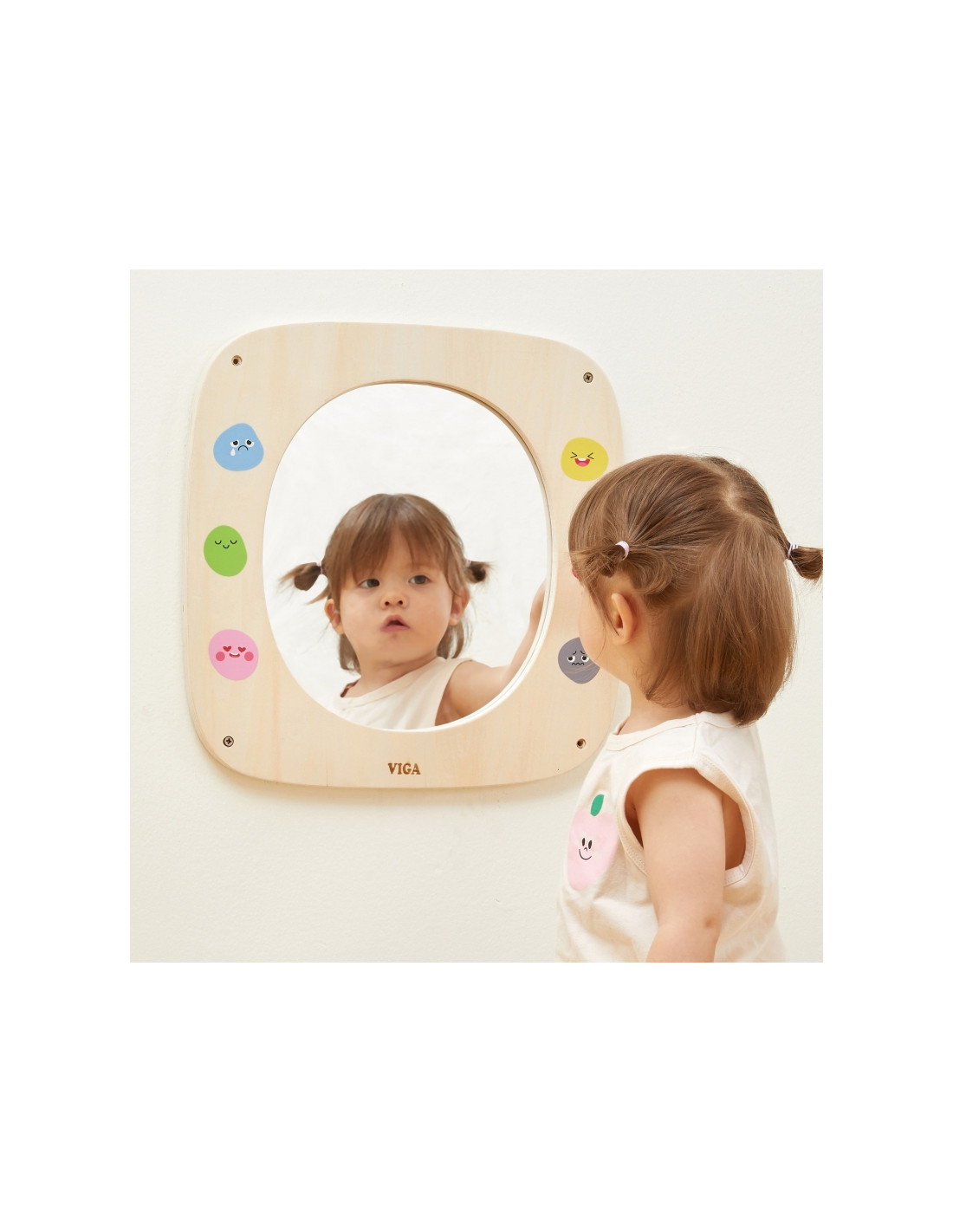 Ši „Viga“ medinė lenta yra puiki mokymosi priemonė mažyliams, sukurta galvojant apie mažus vaikus. Ji skatina emocinį ir motorinį vystymąsi, leisdama mažyliams interaktyviai ir įtraukiančiai tyrinėti emocijų pasaulį. Lentos centre yra saugus veidrodis, apsuptas šešių spalvingų, išraiškingų veidų, vaizduojančių skirtingas emocijas, tokias kaip džiaugsmas, liūdesys, pyktis ir ramybė. Vaikai gali stebėti savo atspindį ir imituoti savo veido išraiškas, taip lavindami emocinį sąmoningumą ir padėdami koordinuoti veido raumenis. Lentą lengva pritvirtinti prie sienos, o tvirta medinė konstrukcija užtikrina patvarumą ir saugumą žaidimo metu.
