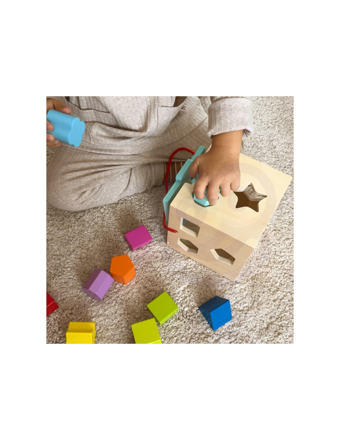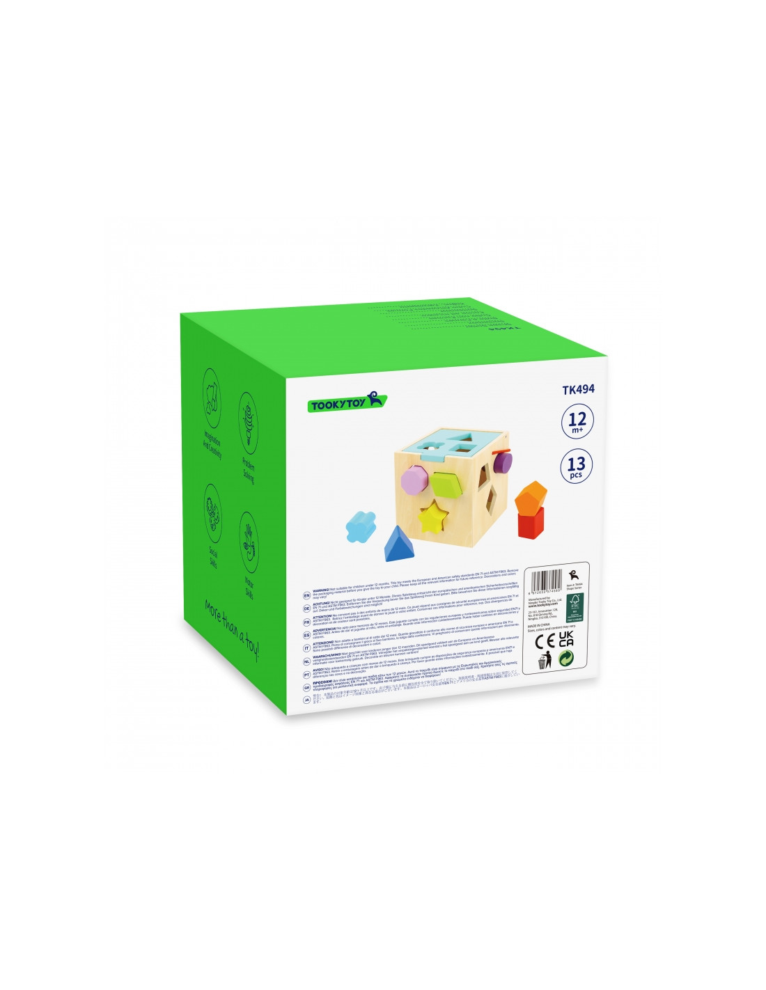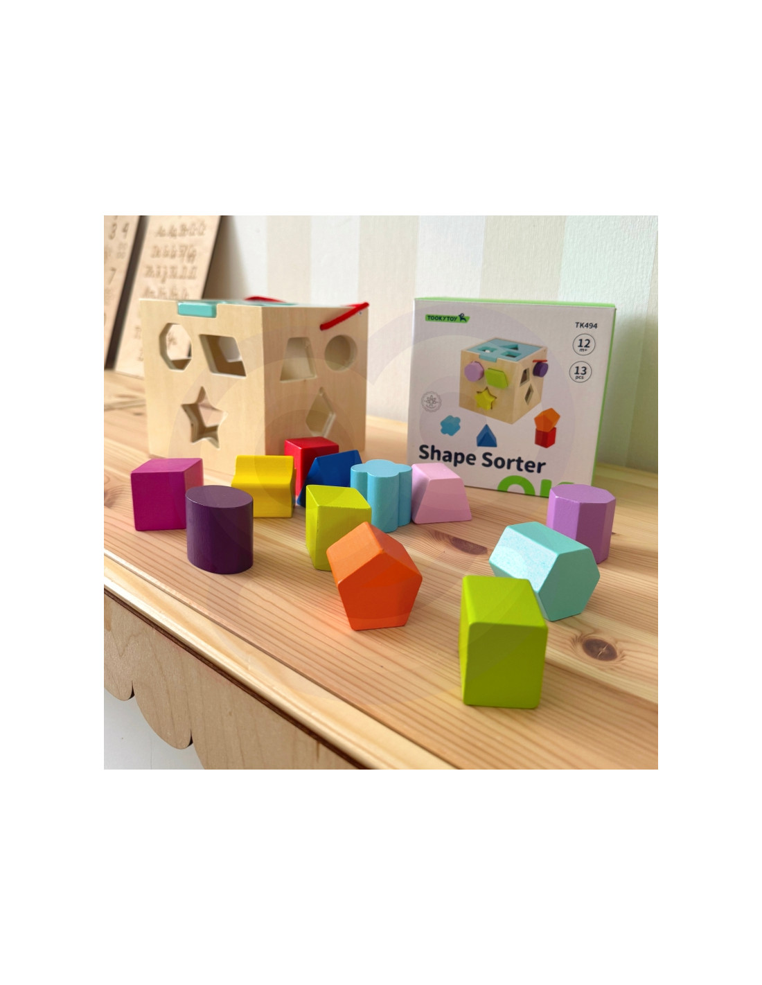 Medinis figūrėlių rūšiavimo kubas „TOOKY TOY“ suteiks valandų valandas pramogų mažiems vaikams. Šešiakampė medinė dėžutė turi keturis šonus su skylutėmis, pažymėtomis skirtingomis formomis, kad būtų lengviau rasti tinkamas vietas vienam iš 12 spalvingų kaladėlių . Visas rinkinys yra tvirtos konstrukcijos ir saugus vaikams.