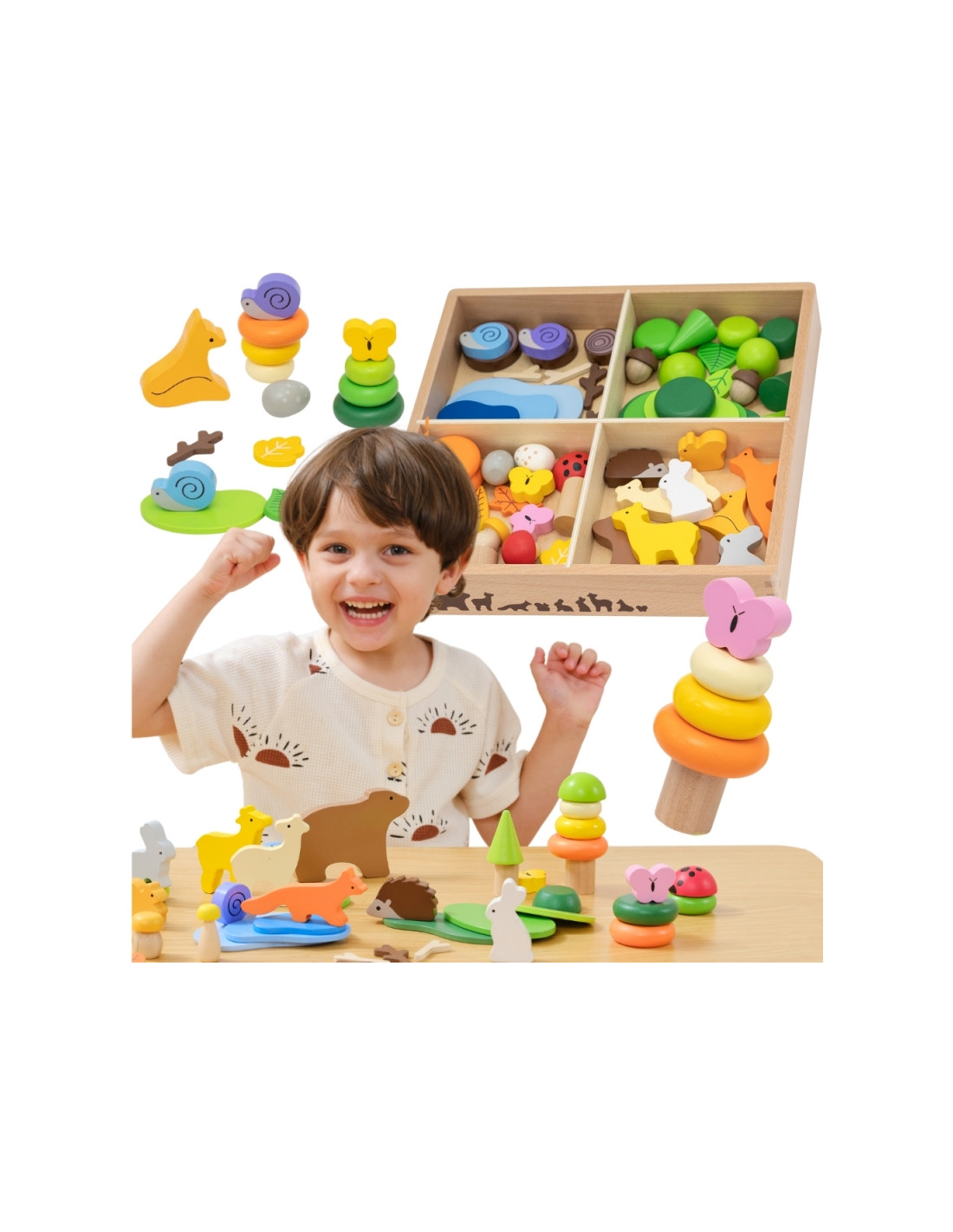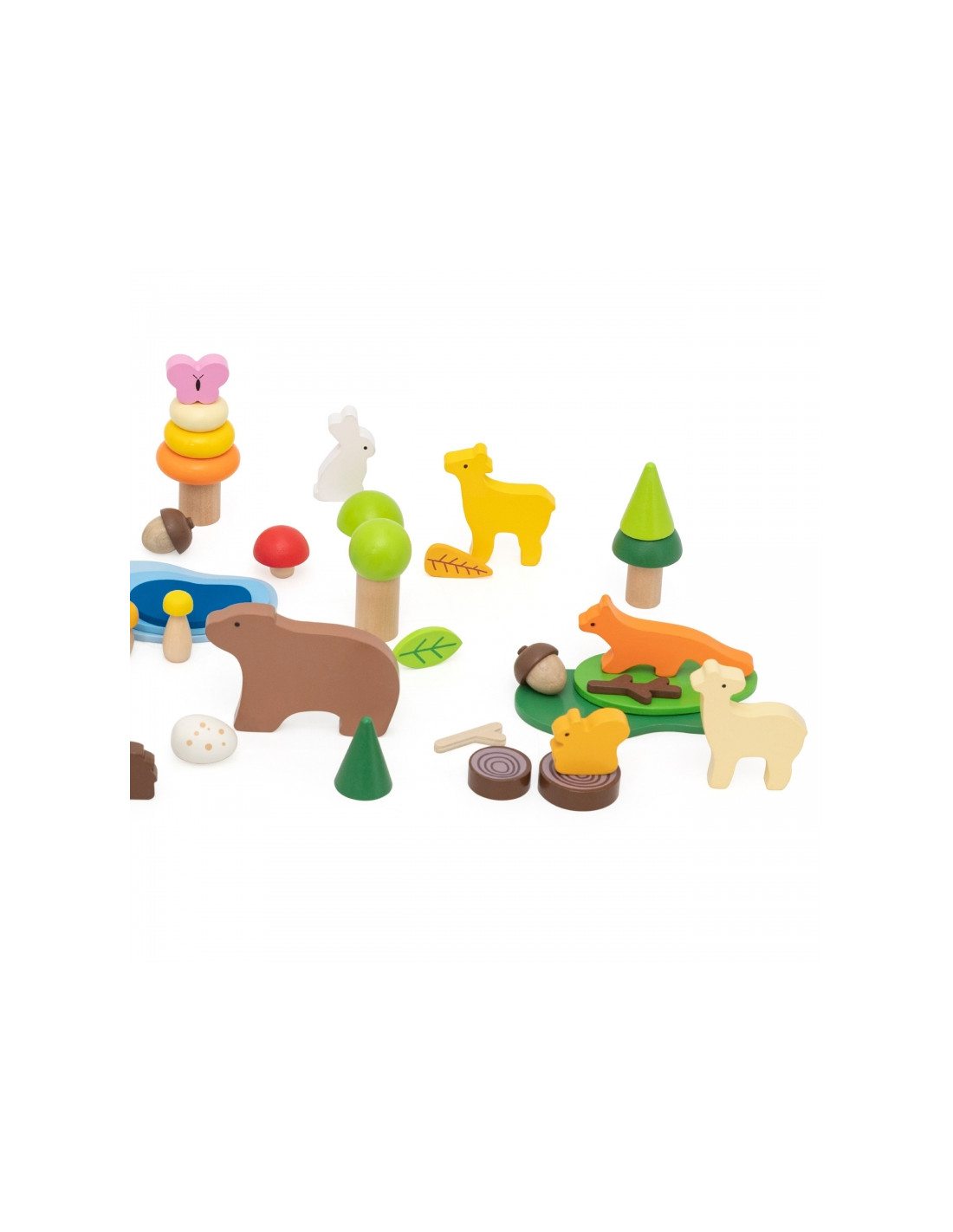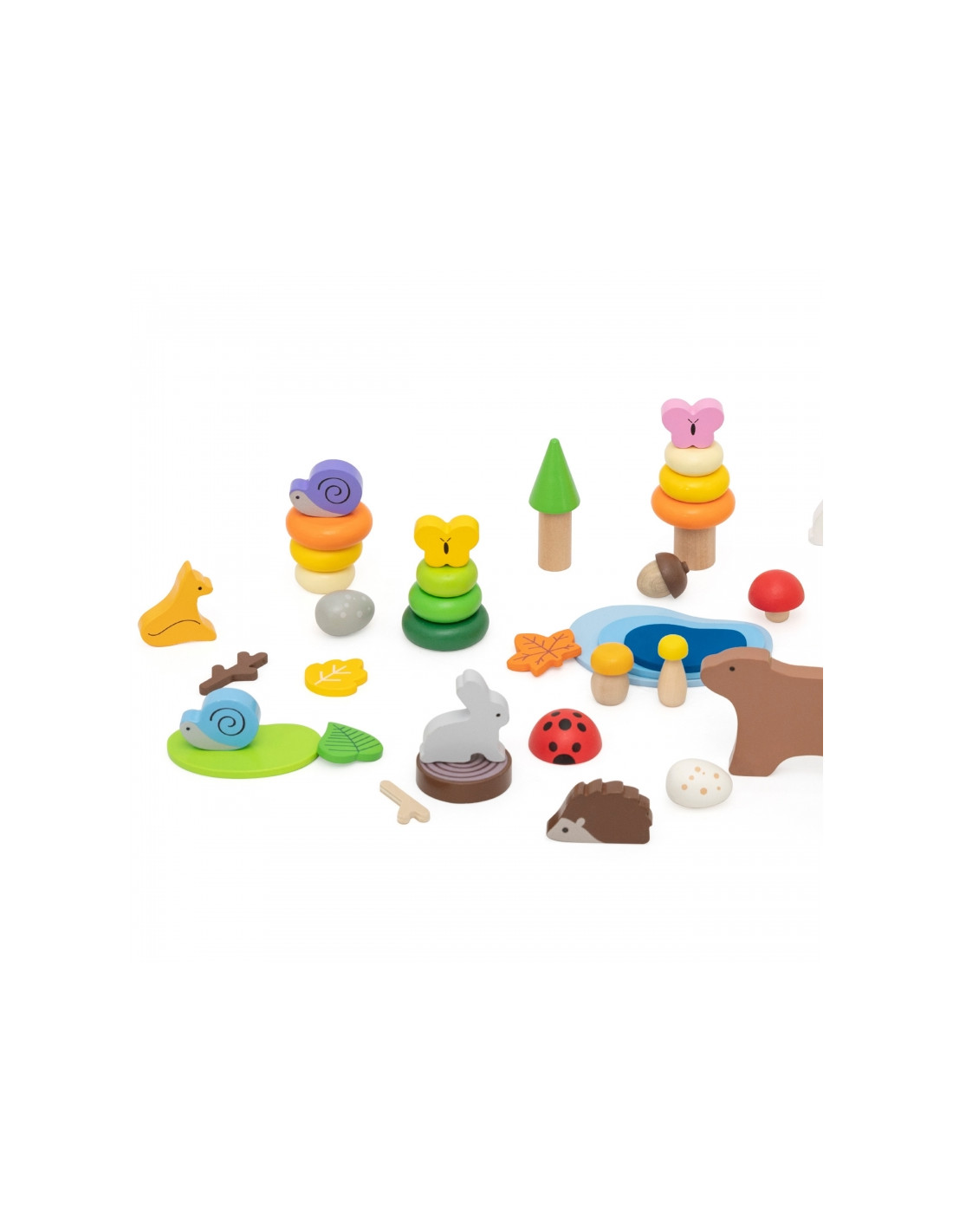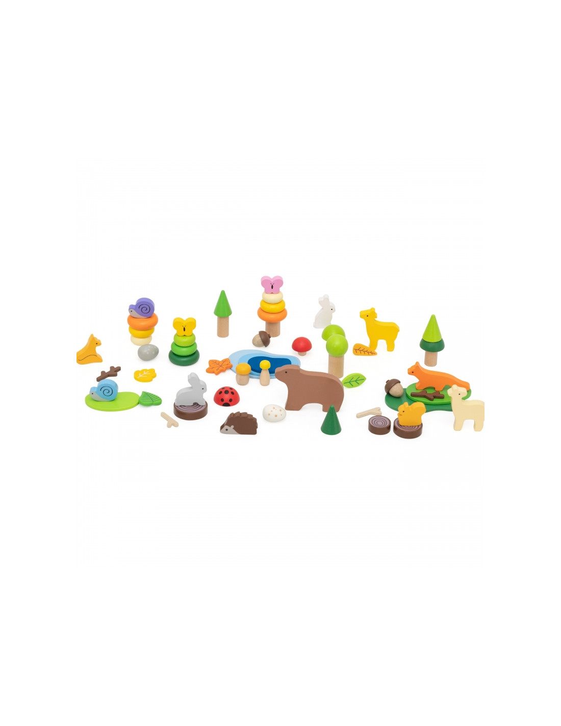 - - Miško tema: gyvūnų figūrėlės (lokys, elnias, lapė, kiškis, sraigė, drugelis, boružėlė) ir gamtos elementai (medžiai, ežeras, grybai, lapai)