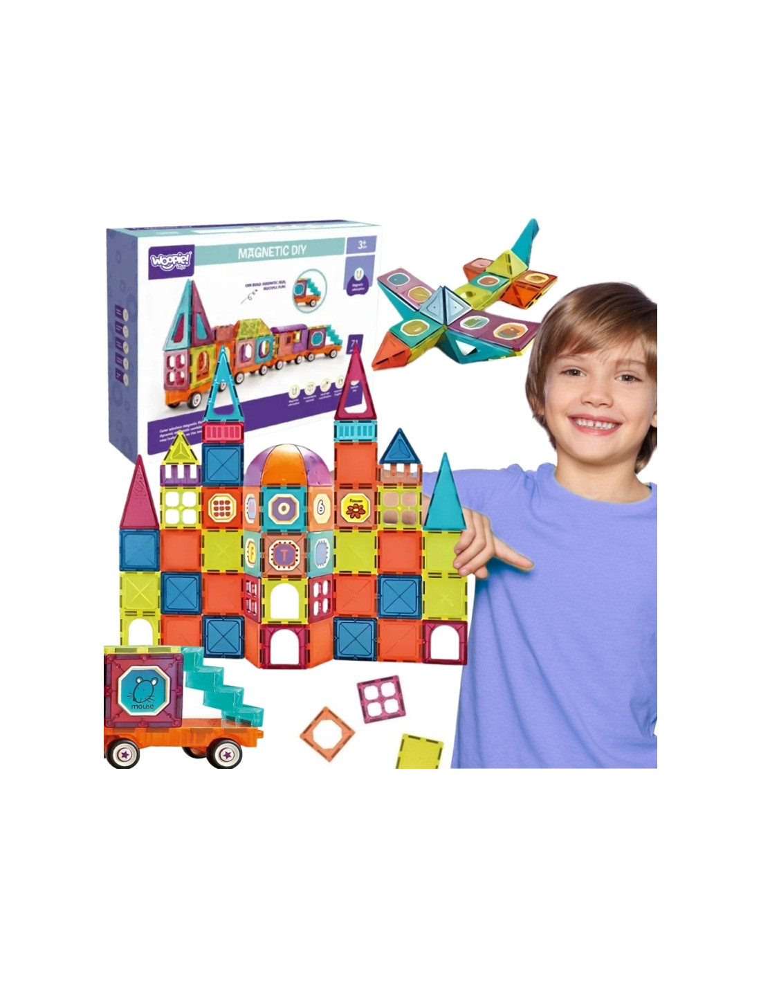 - 71 magnetinė kaladėlė, įskaitant transporto priemonių ratus. - Įvairios formos, spalvos ir grafika (pvz., pelė).