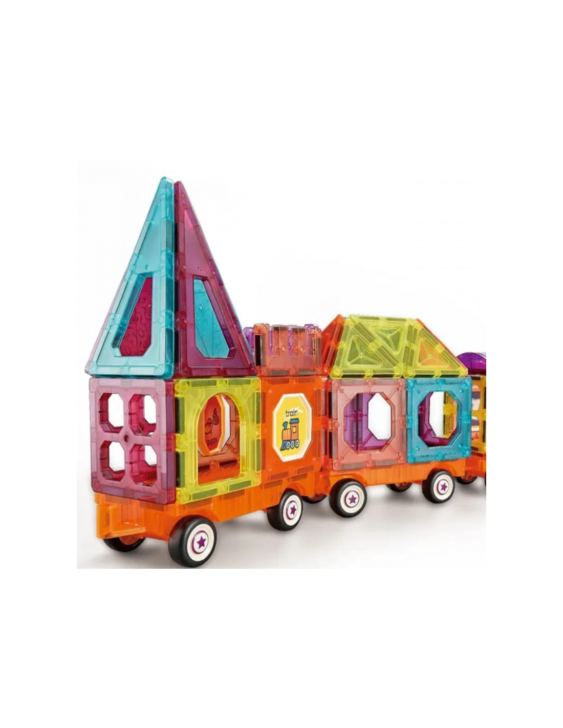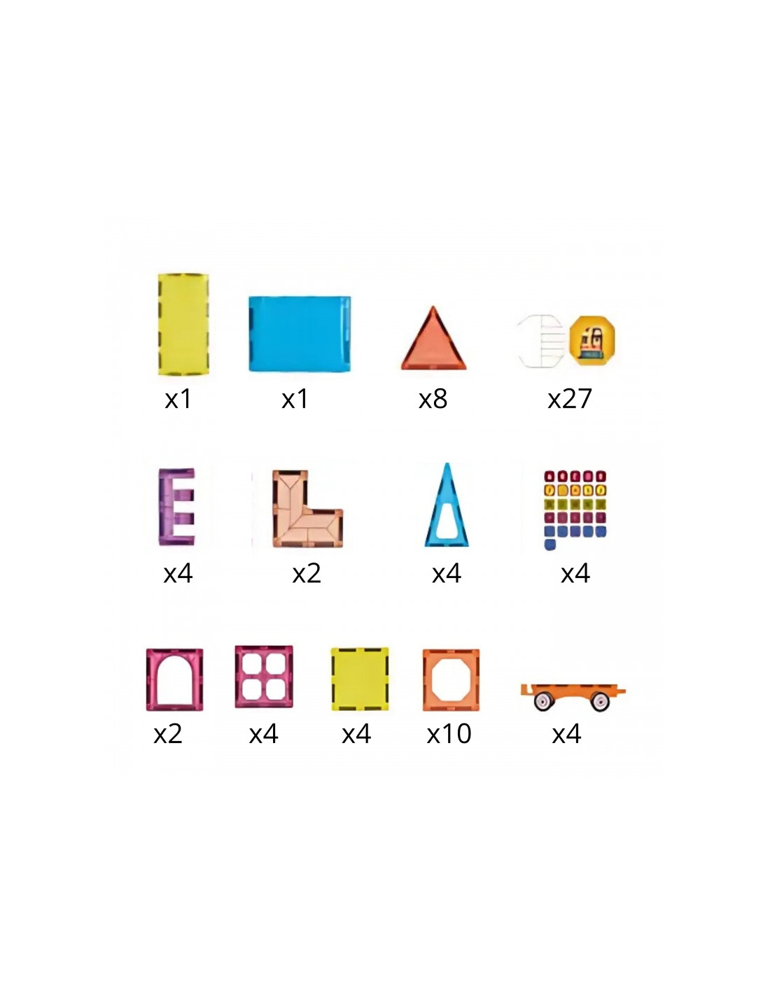 - 71 detalė apima magnetines plyteles, ratus ir figūrėles.