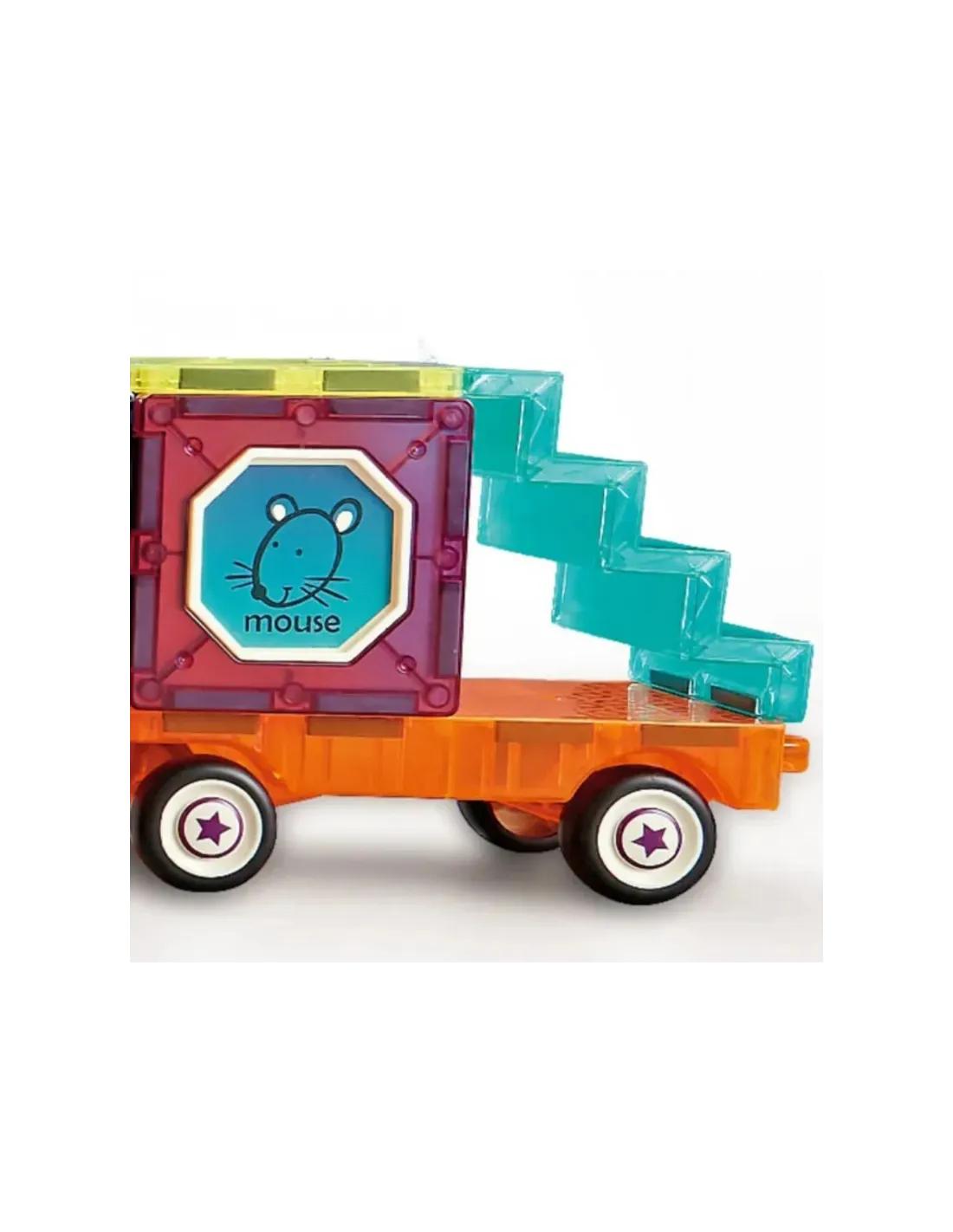- 71 magnetinė kaladėlė, įskaitant transporto priemonių ratus. - Įvairios formos, spalvos ir grafika (pvz., pelė).