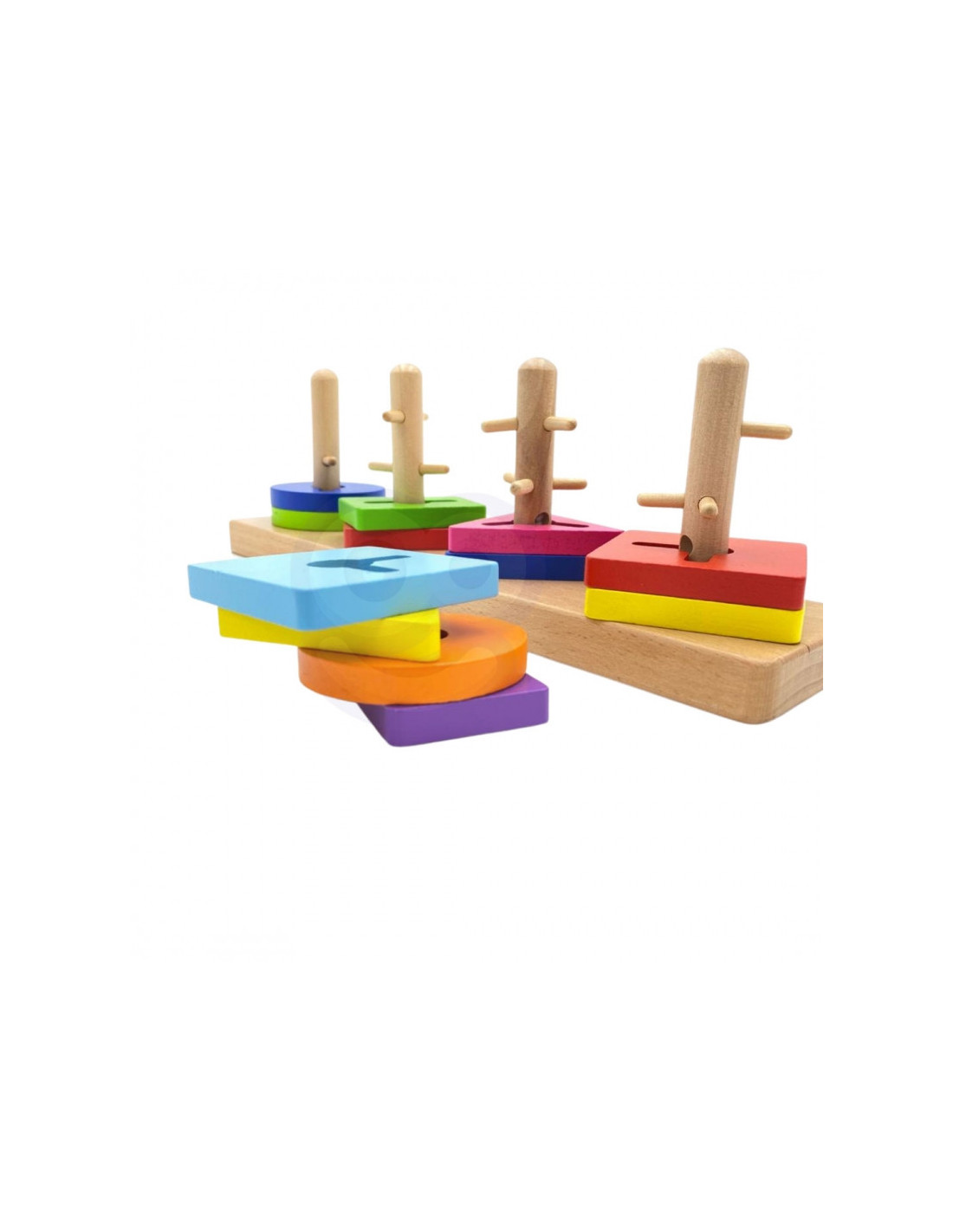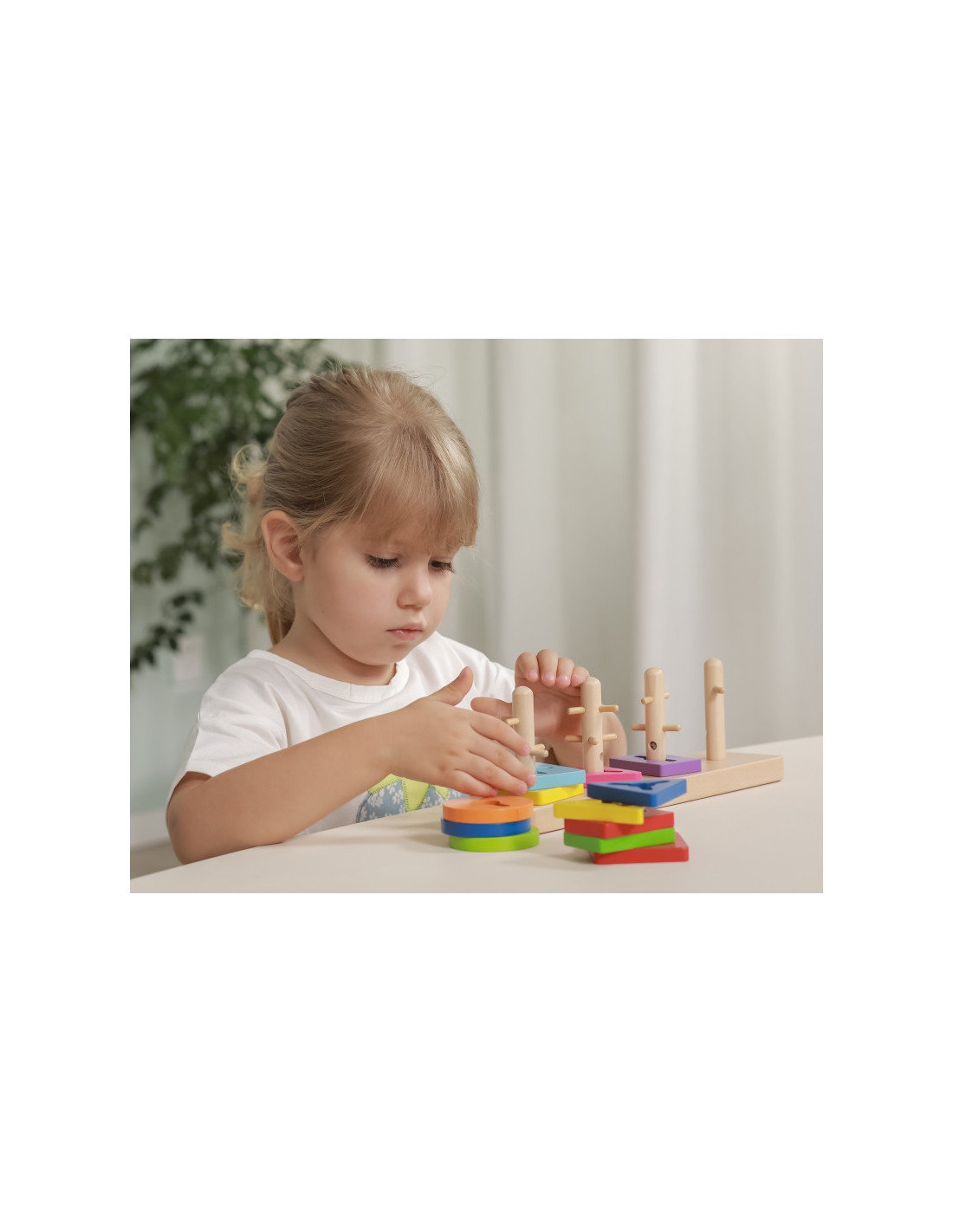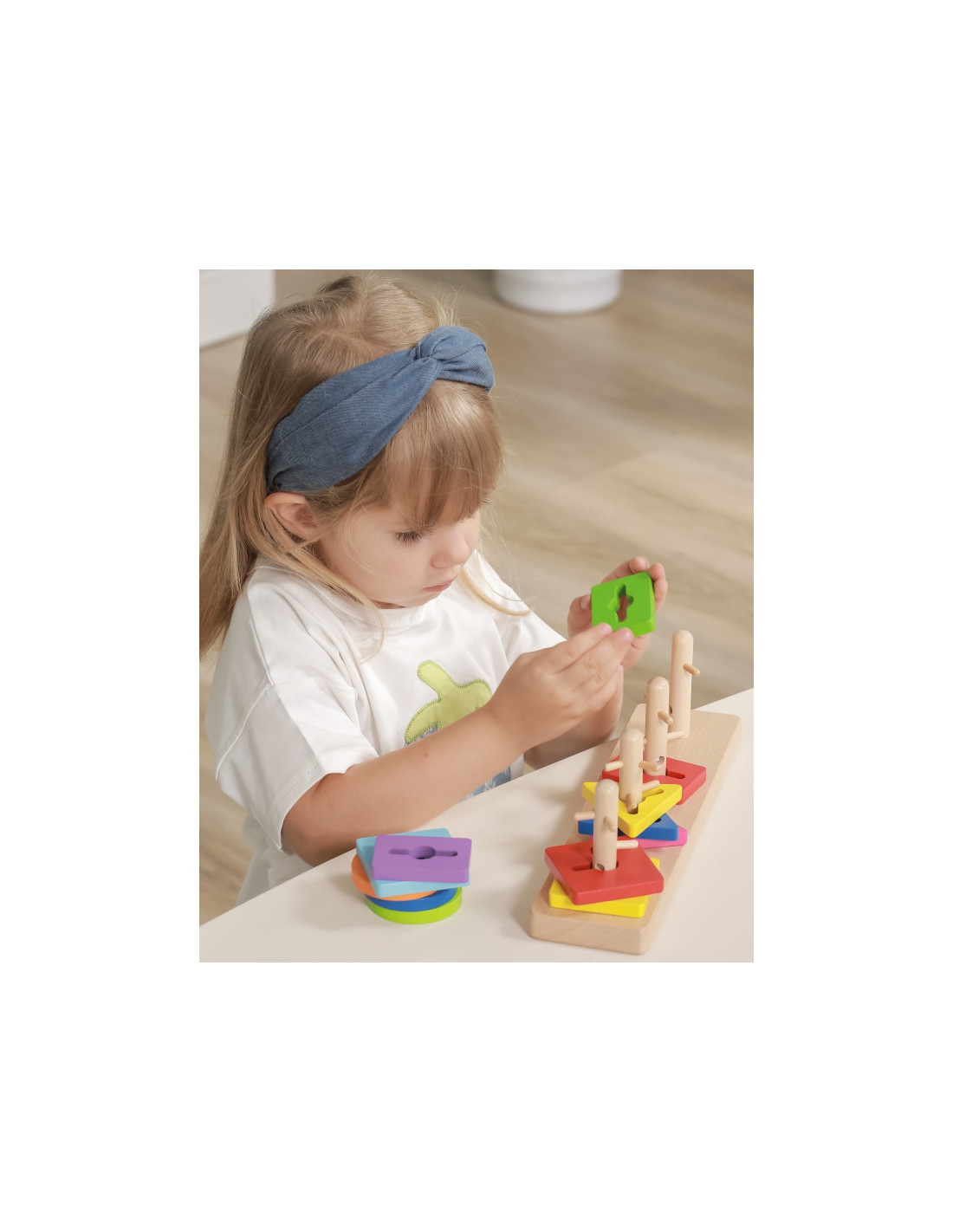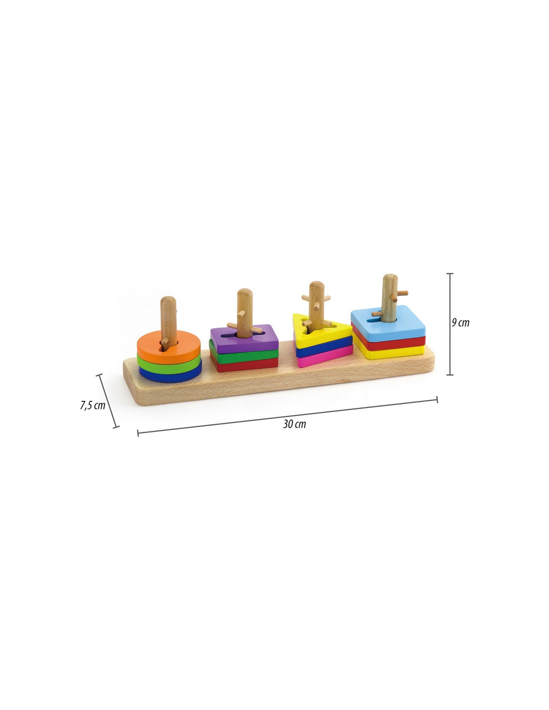 " Viga"medinis geometrinis rūšiuoklis - tai lavinamasis žaislas, skirtas mokytis skaičiuoti ir atskirti formas bei spalvas. Tinkamas figūras reikia uždėti ant kiekvienos iš penkių rankenėlių, o iš pirmo žvilgsnio paprasto žaidimo sunkumas yra tas, kad kaladėles reikia priderinti prie tinkamų skirtukų. Žaisdamas vaikas lavina rankų darbo įgūdžius, rankų ir akių koordinaciją ir loginį mąstymą . Ryškios spalvos traukia mažylio akį ir skatina šį pojūtį. Rūšiuoklė neturi aštrių briaunų, o naudojami netoksiški dažai užtikrina vaikų ir aplinkos saugumą.
