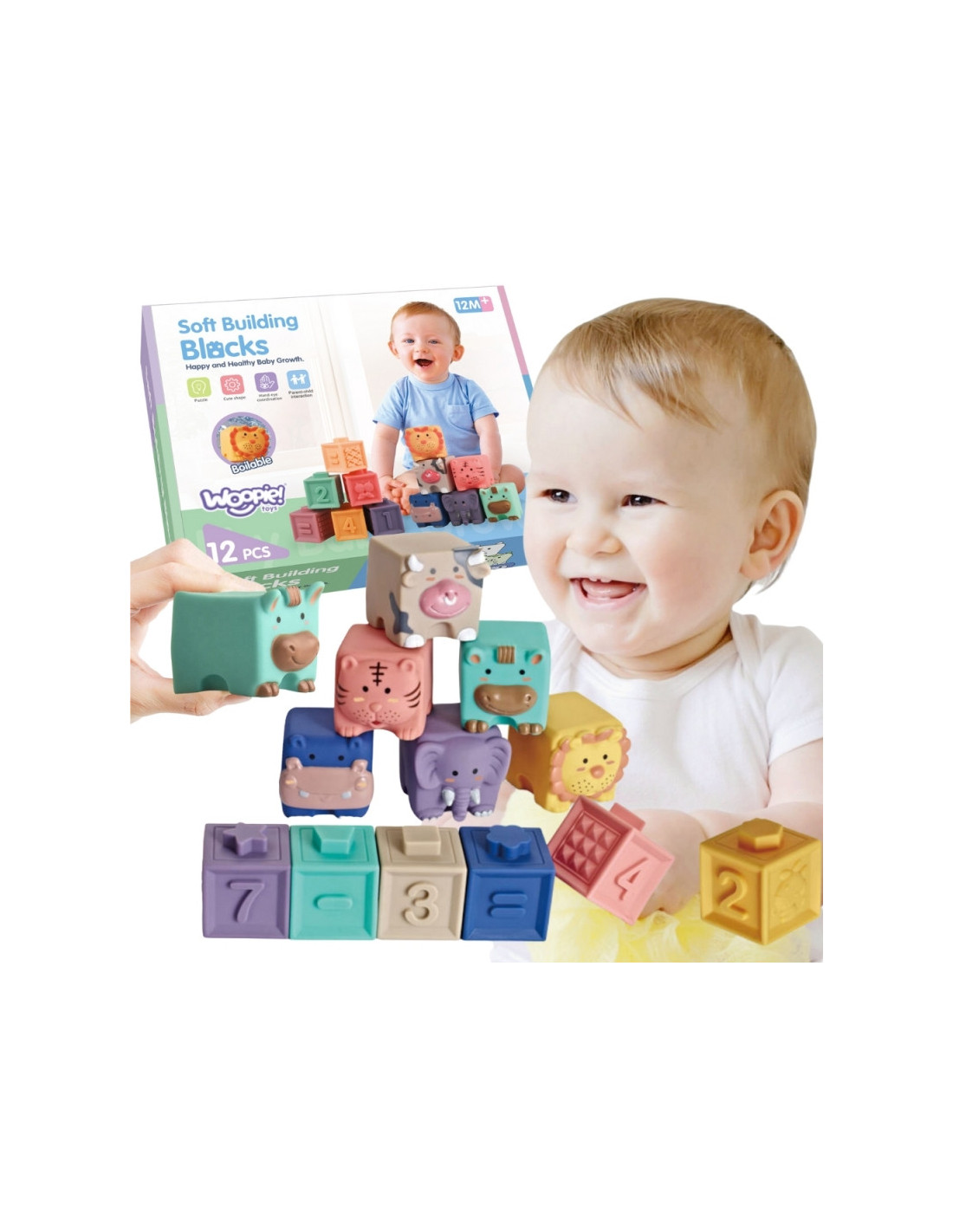 WOOPIE BABY sensoriniai blokai Squeeze Puzzle Sound Learning to Count 12 vnt.