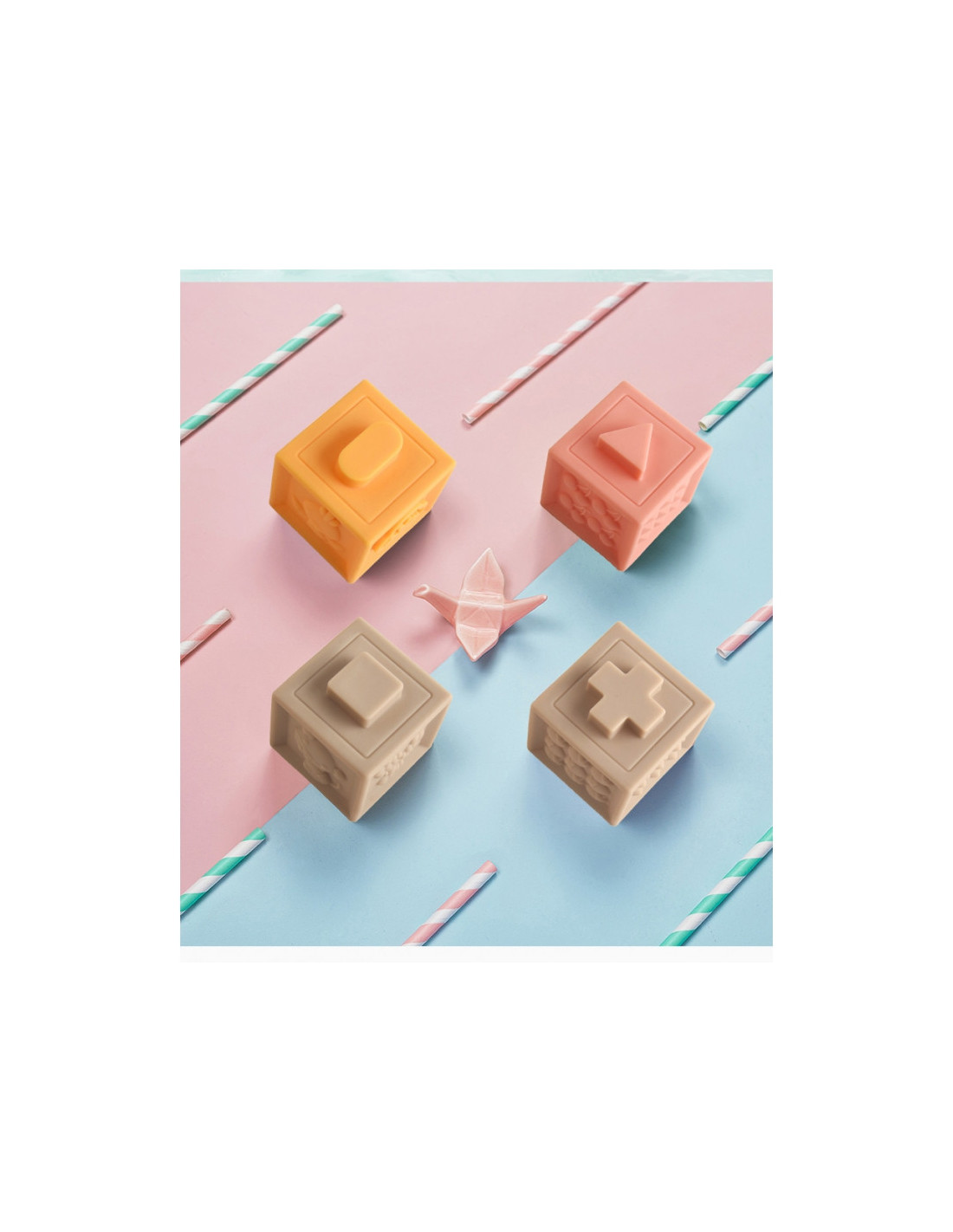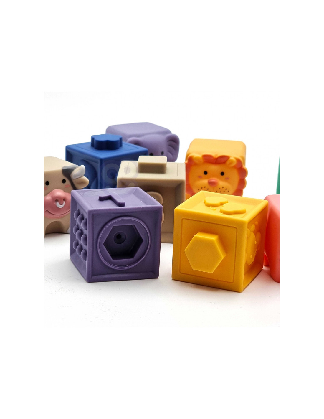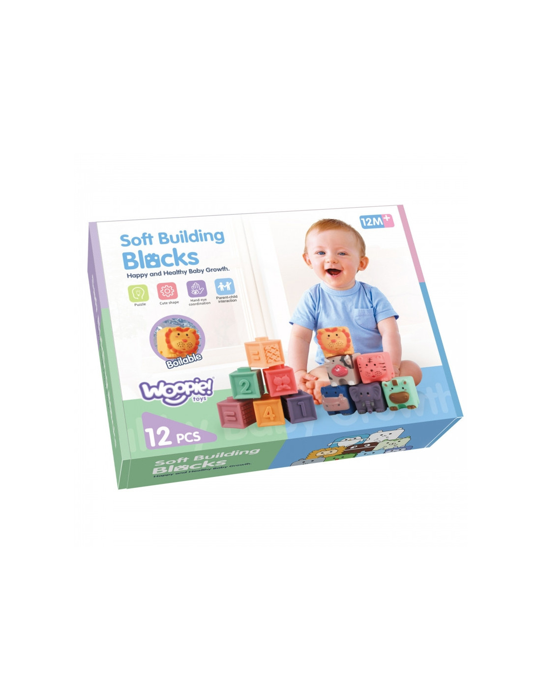 WOOPIE sensoriniai dėlionės blokeliai pradžiugins kiekvieną mažylį. Dėl įdomių formų, spalvų ir galimybės išspausti garsą, jie puikiai stimuliuoja vaiko regos ir klausos koordinaciją, motoriką ir lytėjimo pojūtį. Blokeliuose yra išgaubtos formos su skaičiais ir matematiniais ženklais, tekstūros ir (arba) raštai, gyvūnų atvaizdai, geometrinės figūros ir vaisiai. Be to, kaladėles galima derinti tarpusavyje. Blokeliai yra minkšti ir malonūs liesti, o paspaudus skleidžia garsus. Dėl savo struktūros juos taip pat galima naudoti kaip kramtuką. Blokeliai taip pat turi lavinamąją vertę, pavyzdžiui, mokoma skaičiuoti, nes galima atlikti paprastus matematinius veiksmus. Be to, dėl gyvūnų atvaizdų vaikas gali mokytis apie gamtos pasaulį. Prislopintų spalvų gaminys tinka vaikams nuo 12 mėnesių.