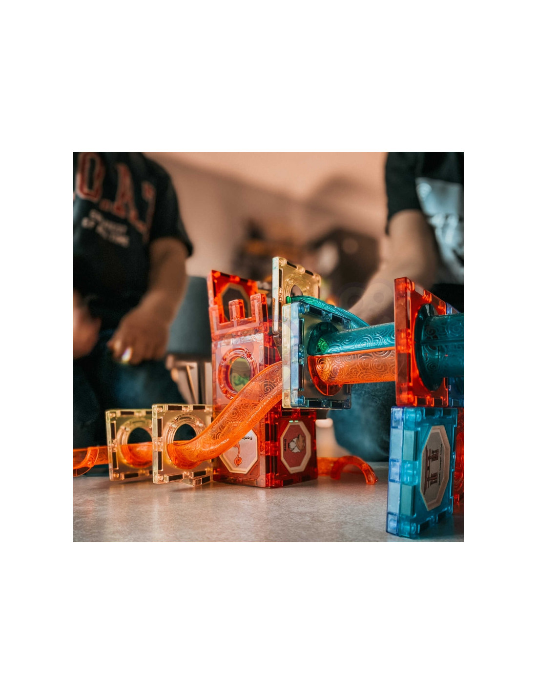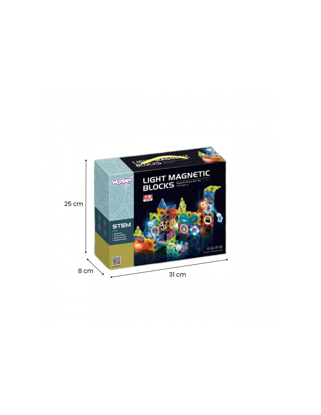 Magnetinės WOOPIE prekės ženkloplytos pritrauks dėmesį ir sužavės jūsų vaiką. Blokelius labai lengva sujungti tarpusavyje ir iš jų galima kurti nuostabias konstrukcijas su kalneliais, pavyzdžiui, takelį, kuriuo juda kamuoliukas. Kad takelis būtų dar įspūdingesnis, jį galima apšviesti pridėtu žibintuvėliu, o jūsų vaikas galės stebėti, kaip juda šviesa, taip lavindamas savo suvokimą. Paprasčiausiai sutvarkę takelį taip, kad kamuoliukai nesunkiai pasiektų galą, lavinsite vaiko loginį mąstymą, vaizduotę ir kūrybiškumą bei padėsite jam susikaupti konstruojant. Dėliodamas kaladėles vaikas susipažįsta su formomis ir spalvomis, lavina rankų darbo įgūdžius, vadinamąją smulkiąją motoriką.
