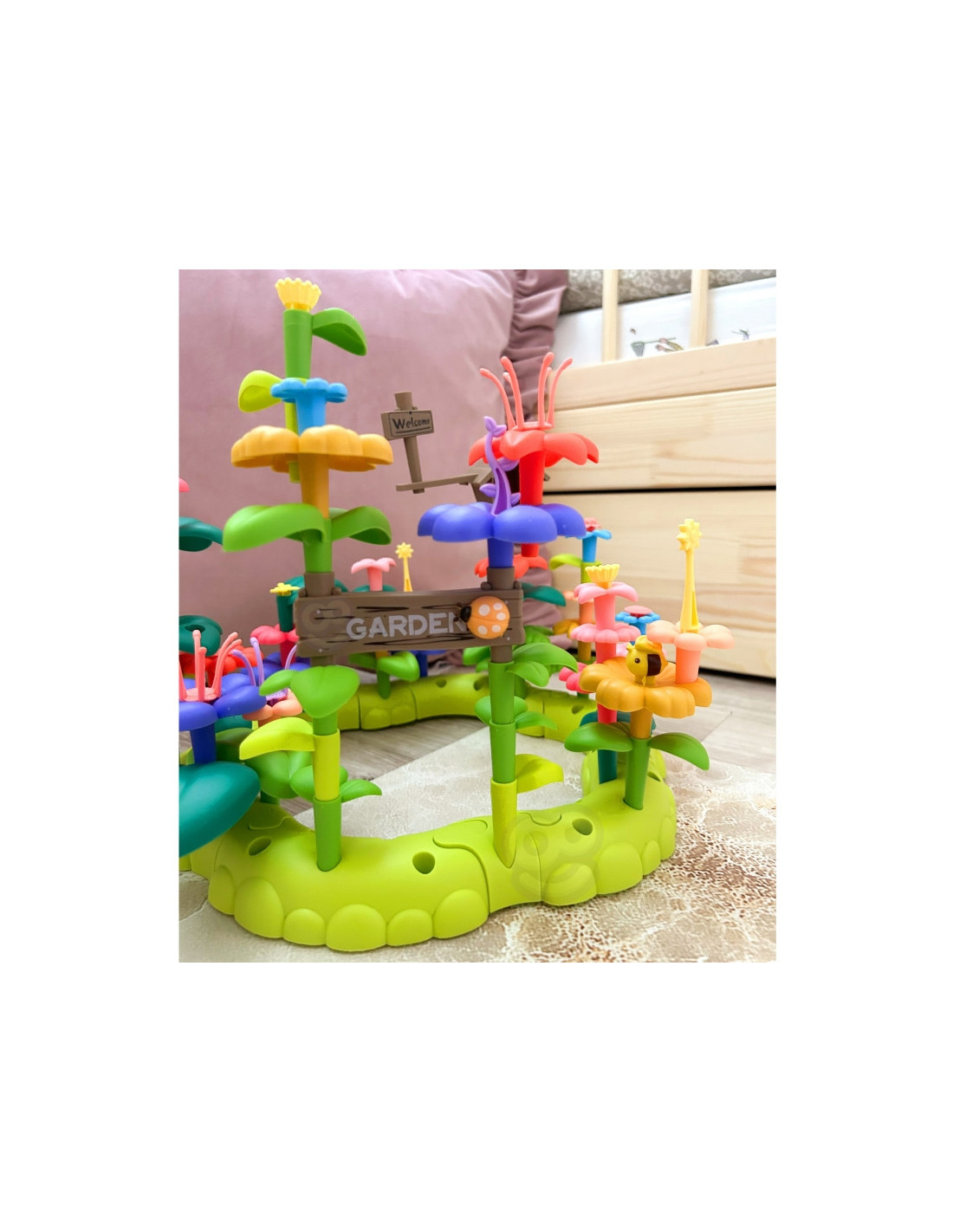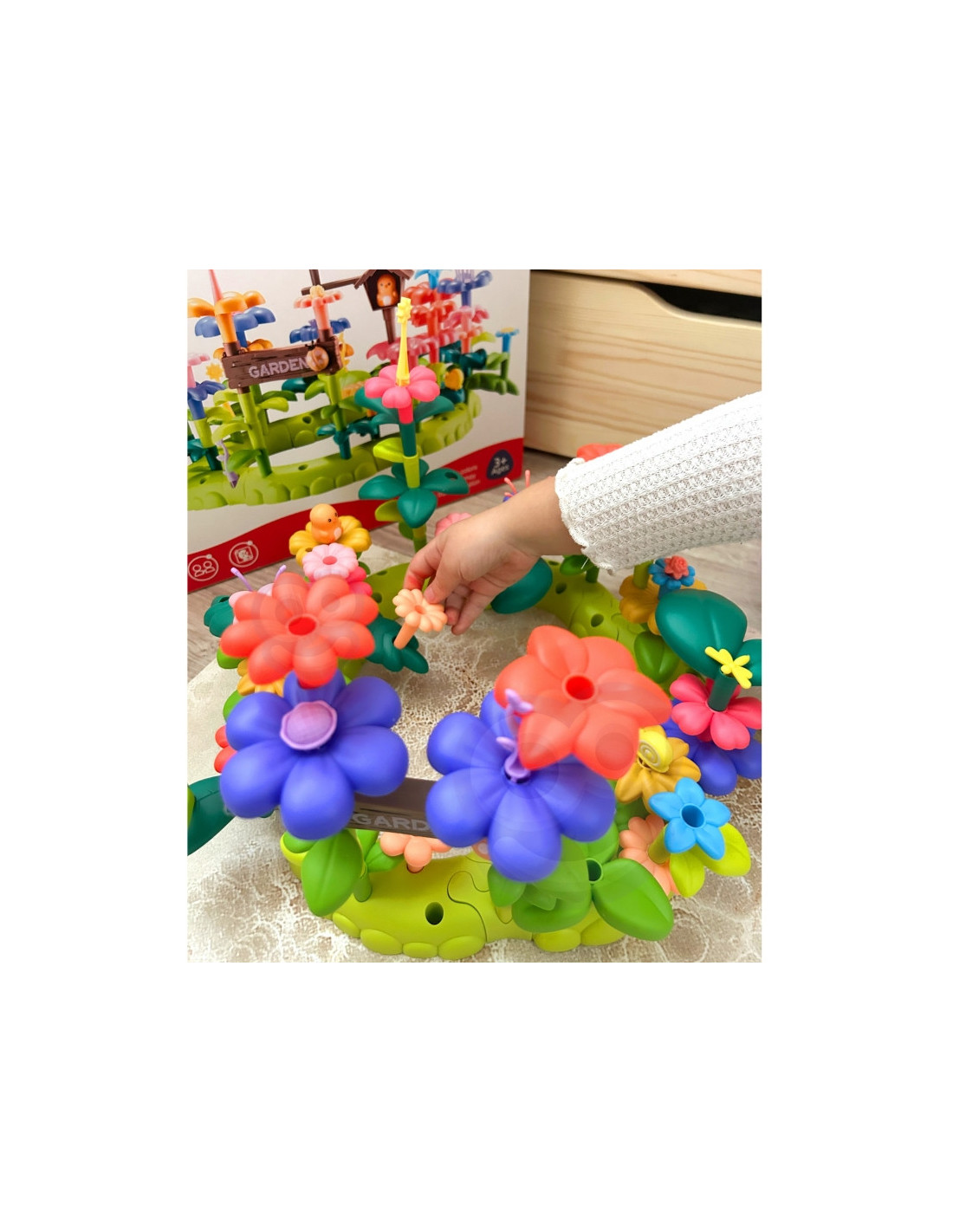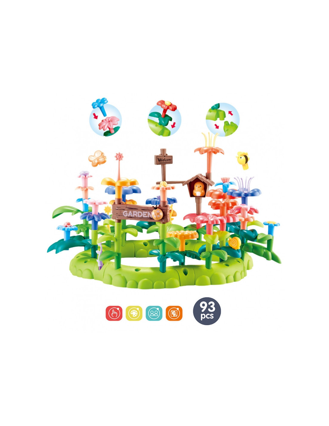 - - Rinkinį sudaro 93 dalys: spalvingos gėlės, lapai ir kiti sodo reikmenys.