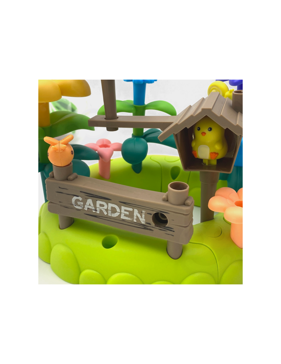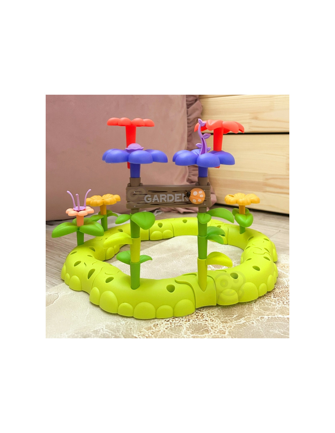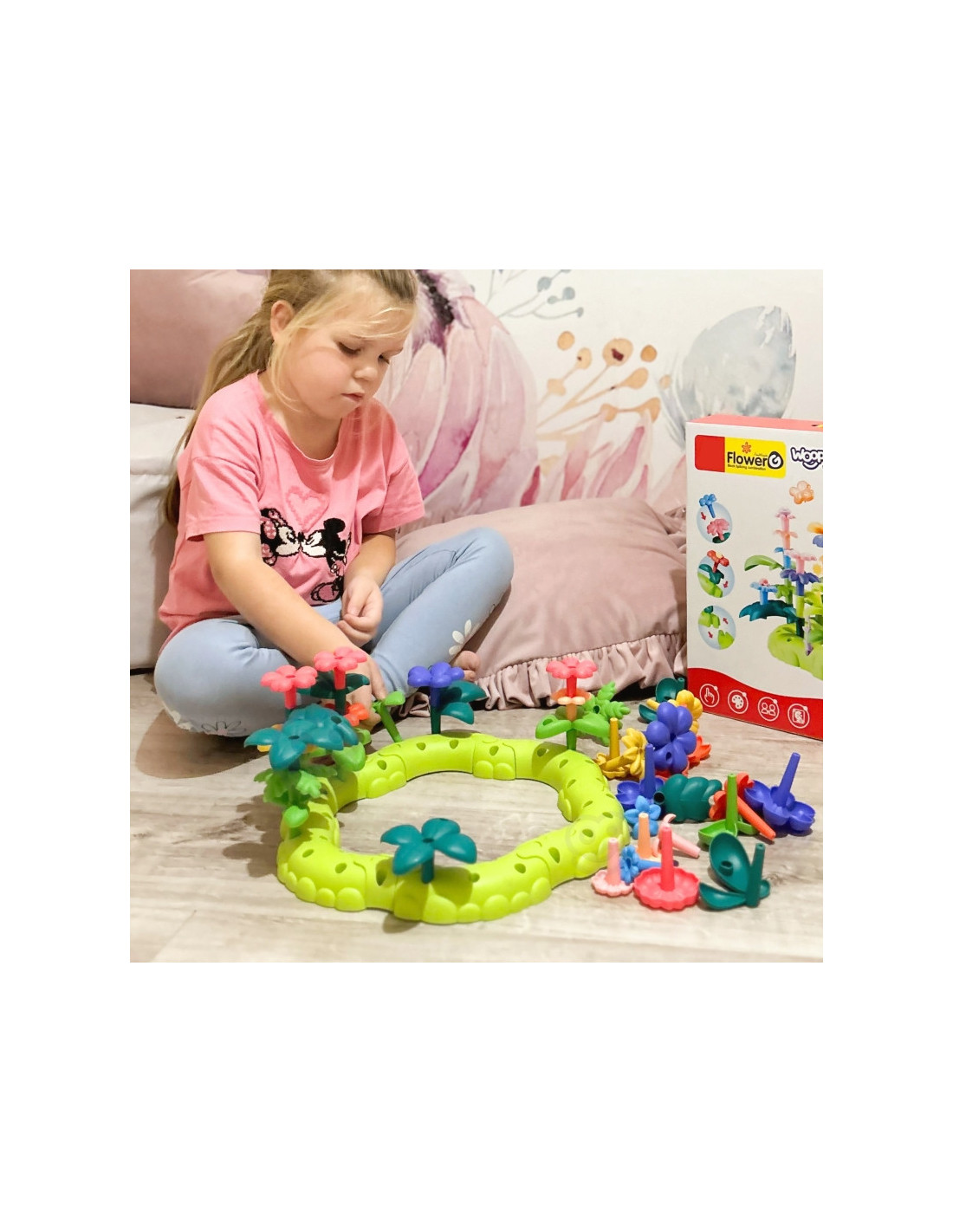 - - Rinkinį sudaro 93 dalys: spalvingos gėlės, lapai ir kiti sodo reikmenys.