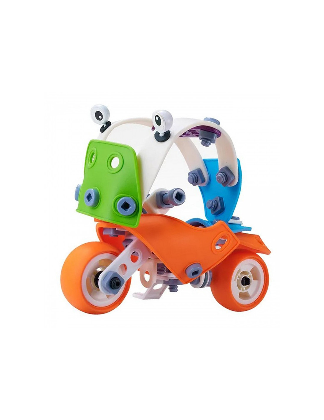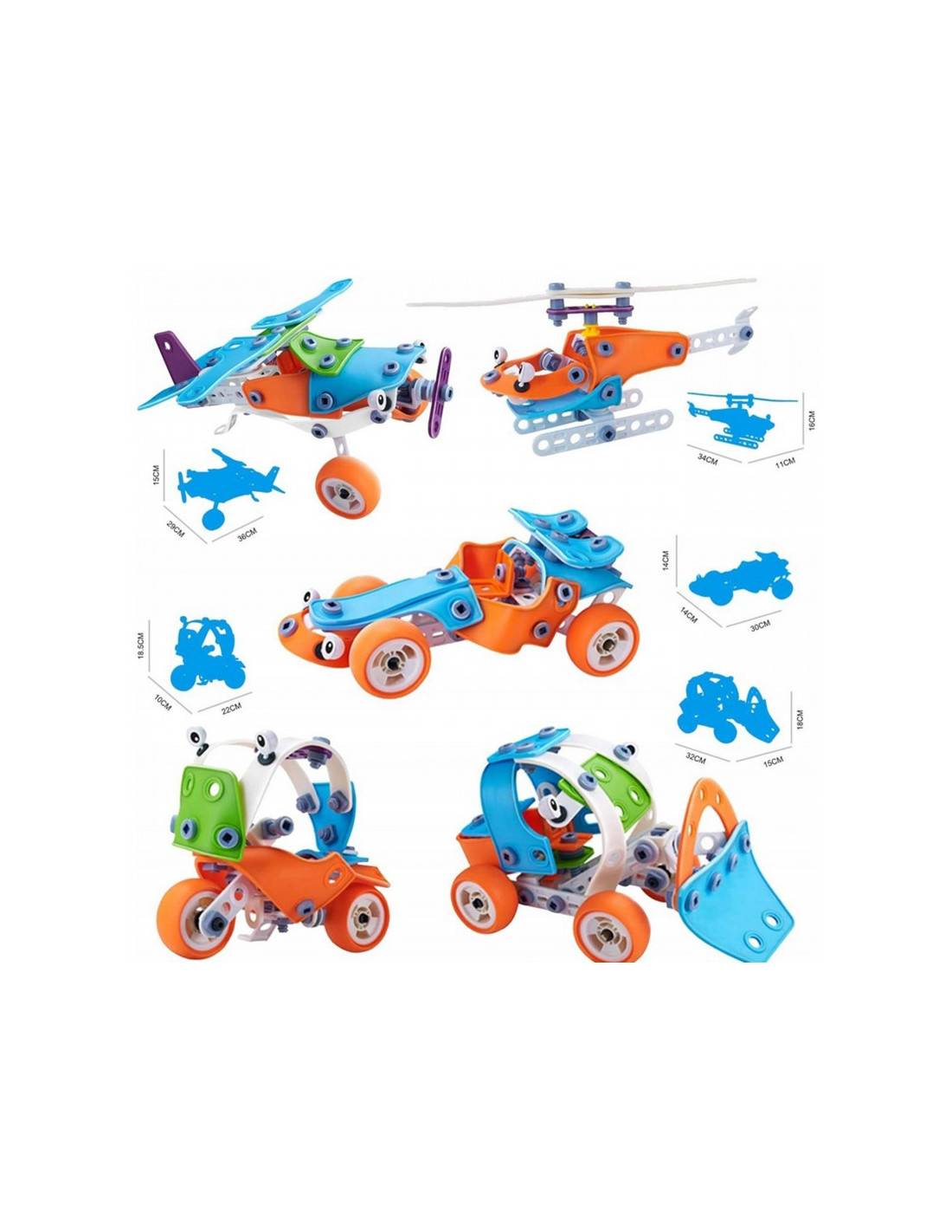 - Rinkinį sudaro: Įvairių formų blokeliai, atsuktuvas ir veržliaraktis, tvirtinimo varžtai su veržlėmis, ratai, vaizdinė instrukcija, skirta 6 skirtingoms transporto priemonėms iš statybvietės sukonstruoti