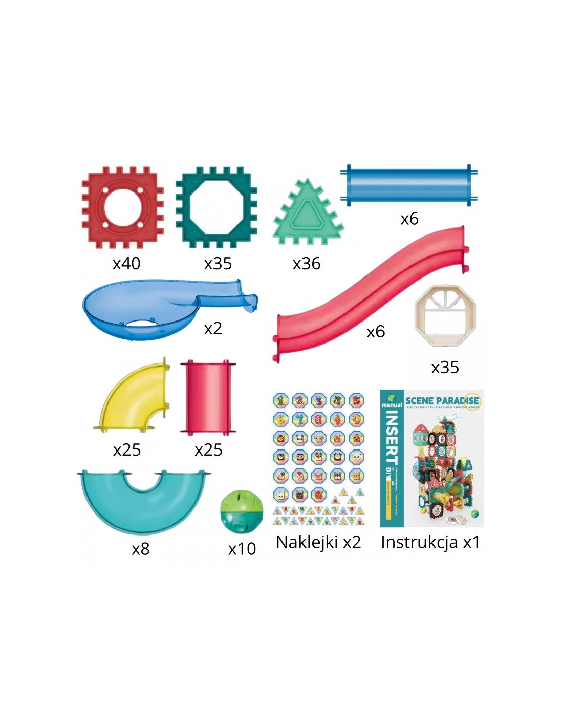- - Iš viso 228 skirtingos statybinės kaladėlės ir rutuliniai bėgių elementai