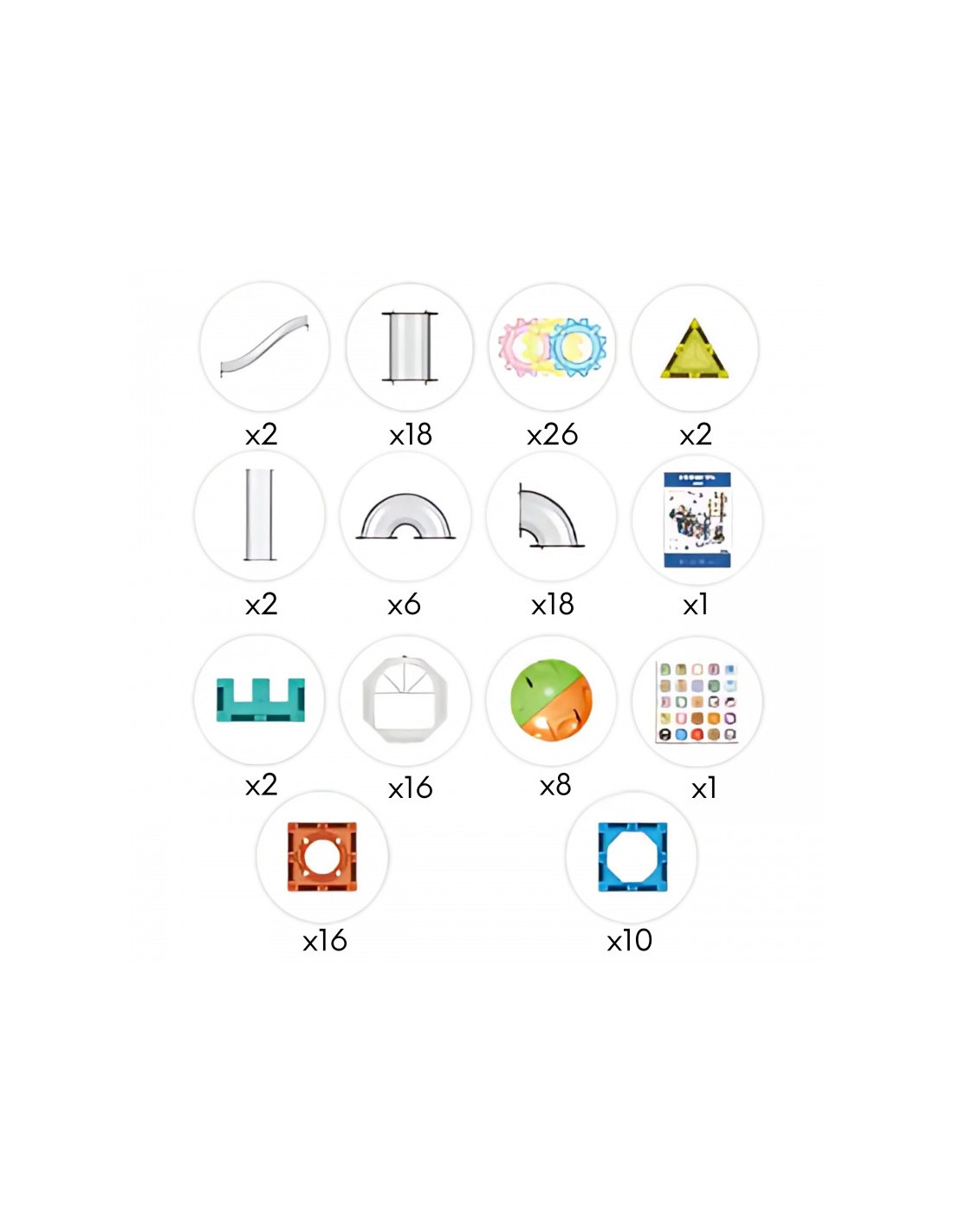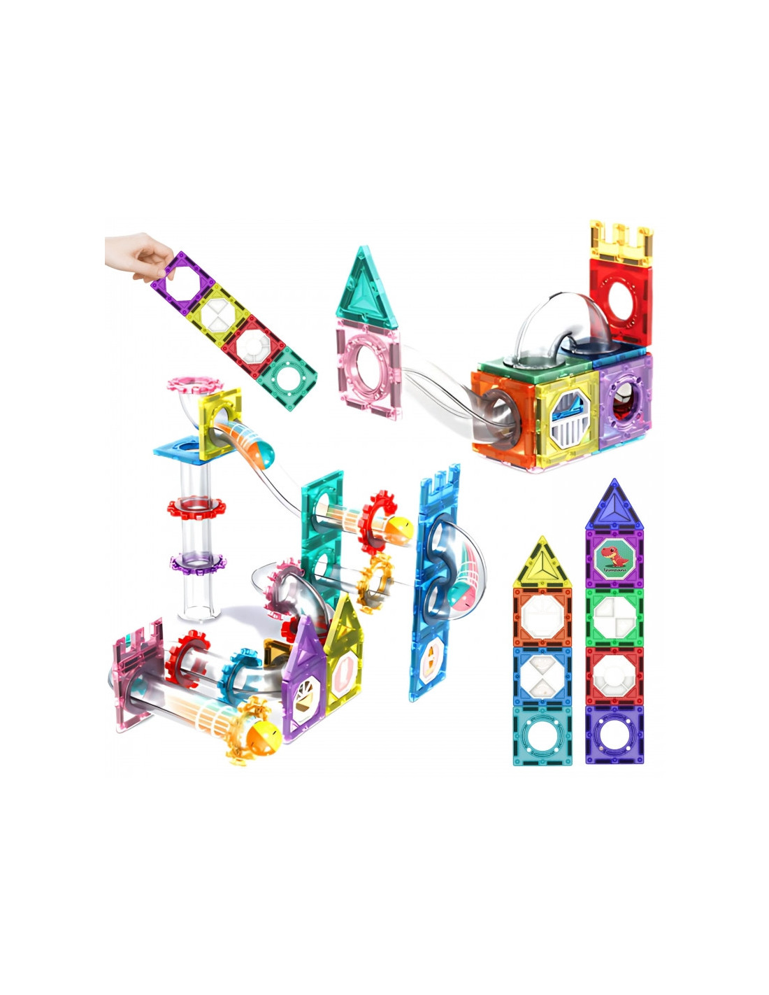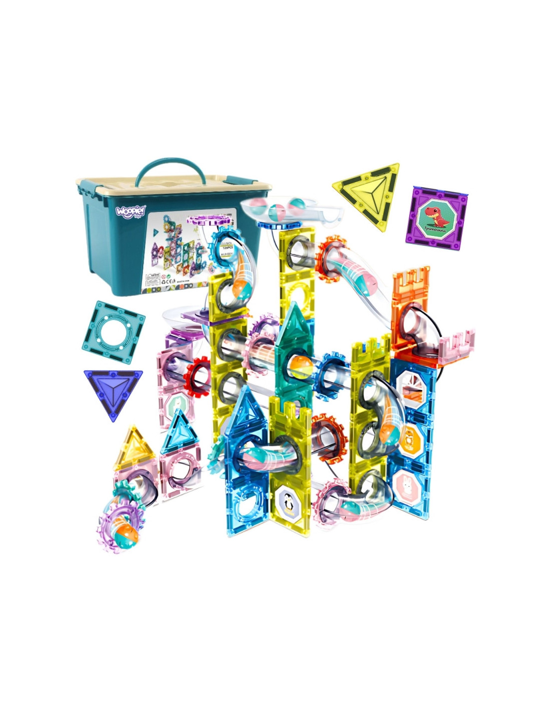 - - Iš viso 126 skirtingos magnetinės statybinės kaladėlės ir rutulinio takelio dalys