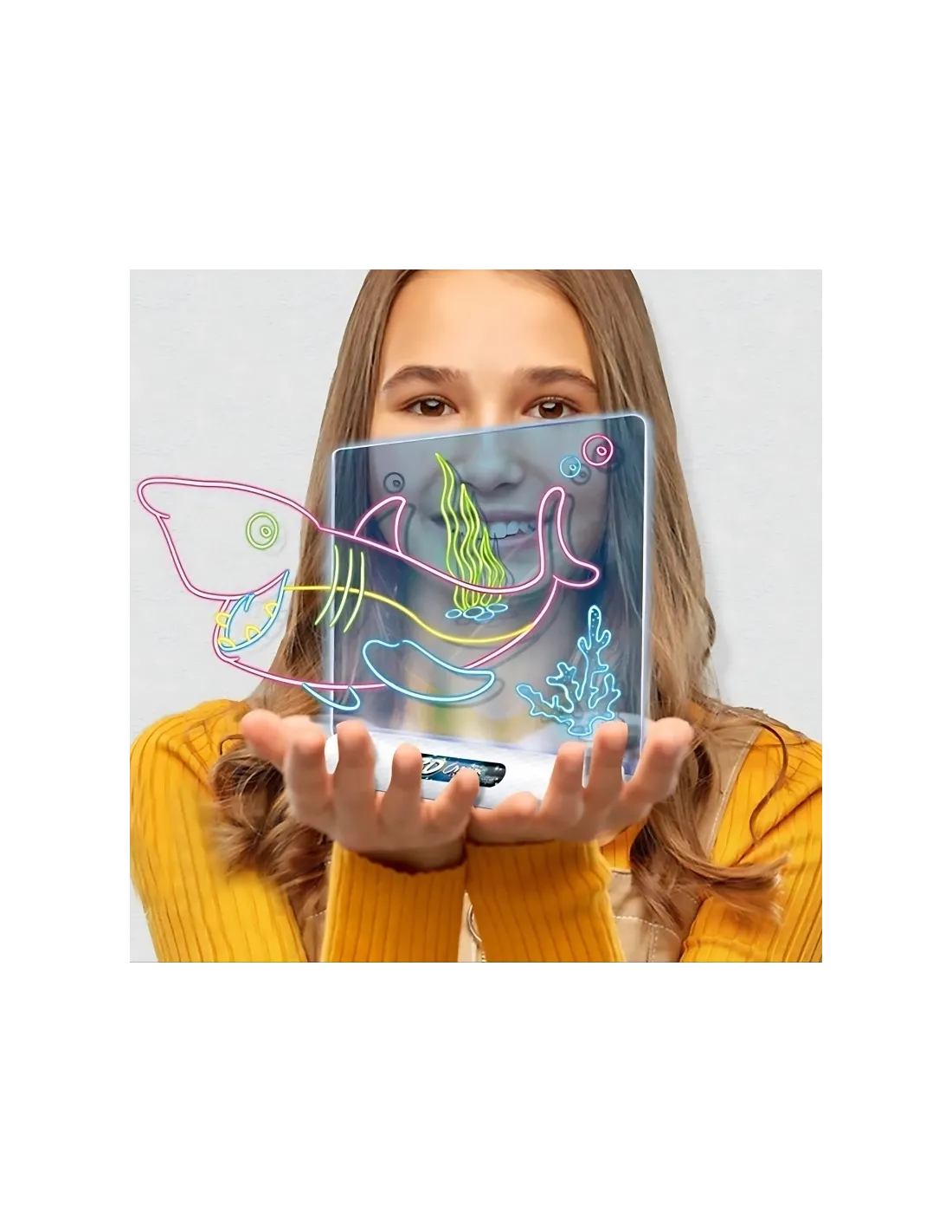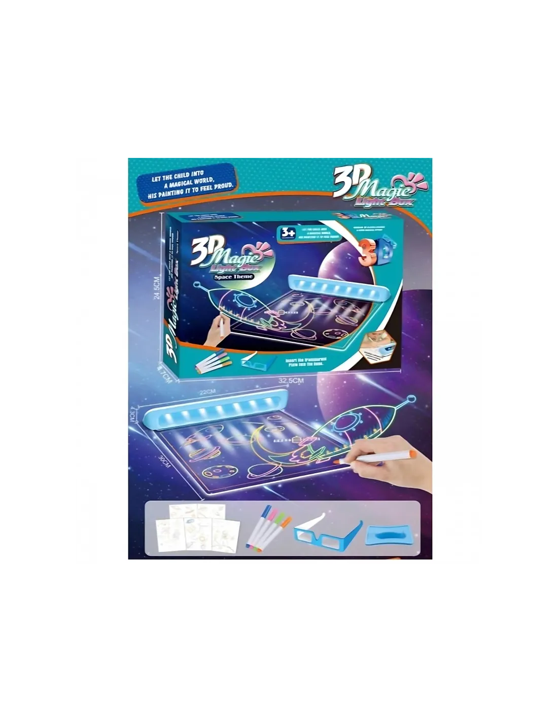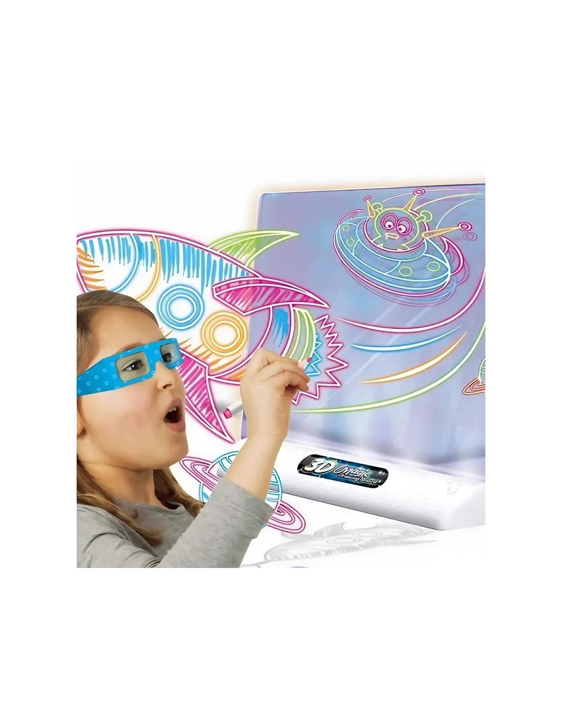 Nustebinkite savo vaiką moderniu piešimo būdu! Ši stebuklinga 3D lenta leidžia kurti trimačius piešinius naudojant specialius fluorescencinius rašiklius ir eskizus. Dėl įmontuoto LED apšvietimo ir pridedamų 3D akinių kiekvienas piešinys tiesiogine prasme atgyja!