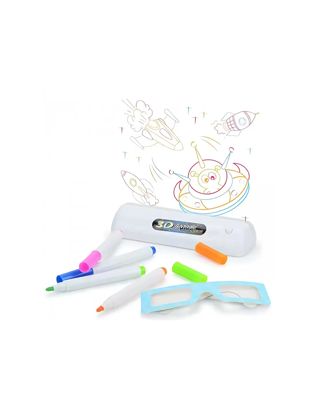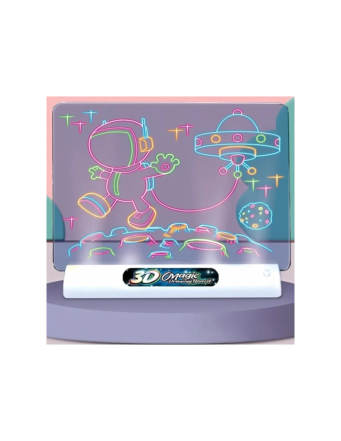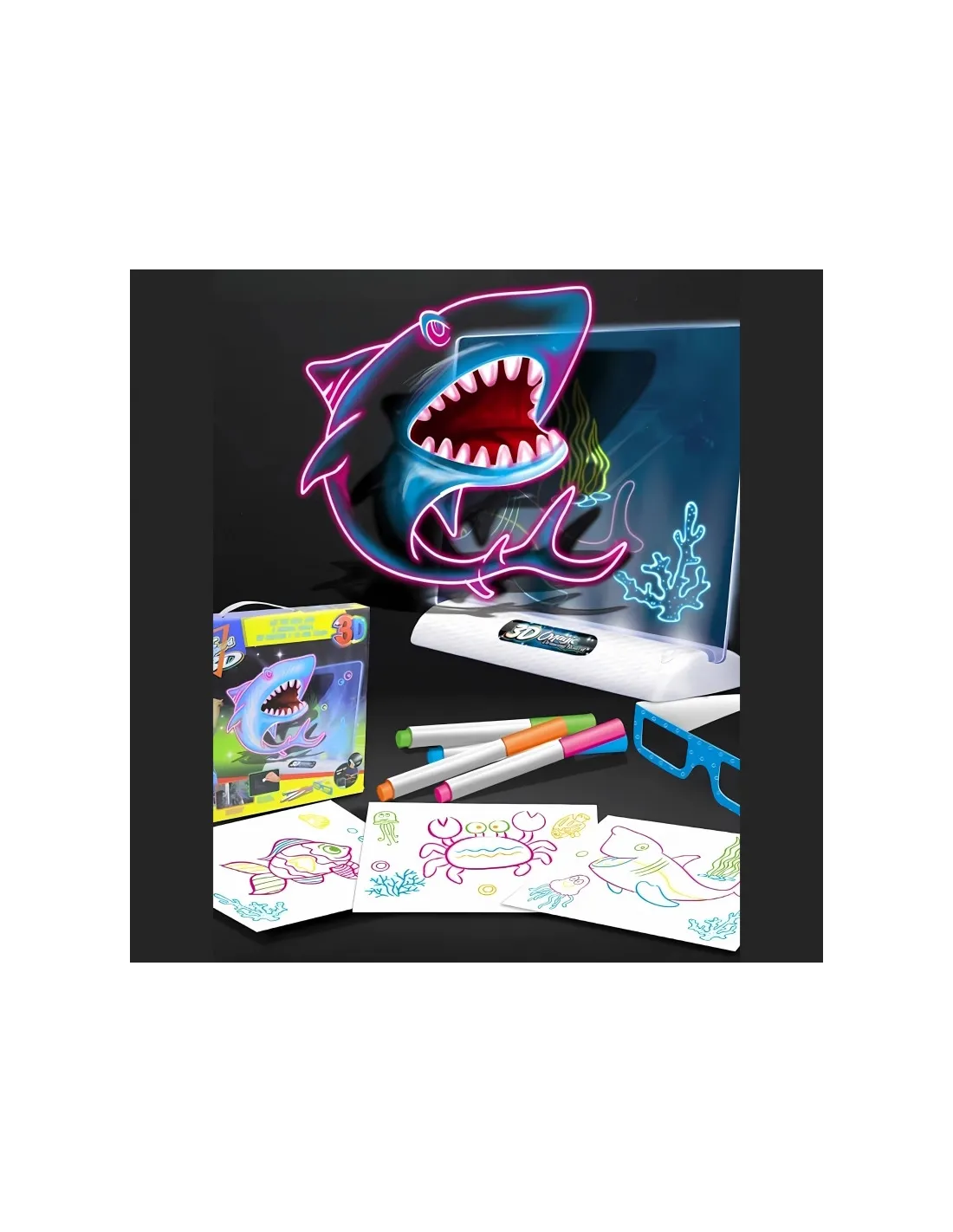Nustebinkite savo vaiką moderniu piešimo būdu! Ši stebuklinga 3D lenta leidžia kurti trimačius piešinius naudojant specialius fluorescencinius rašiklius ir eskizus. Dėl įmontuoto LED apšvietimo ir pridedamų 3D akinių kiekvienas piešinys tiesiogine prasme atgyja!