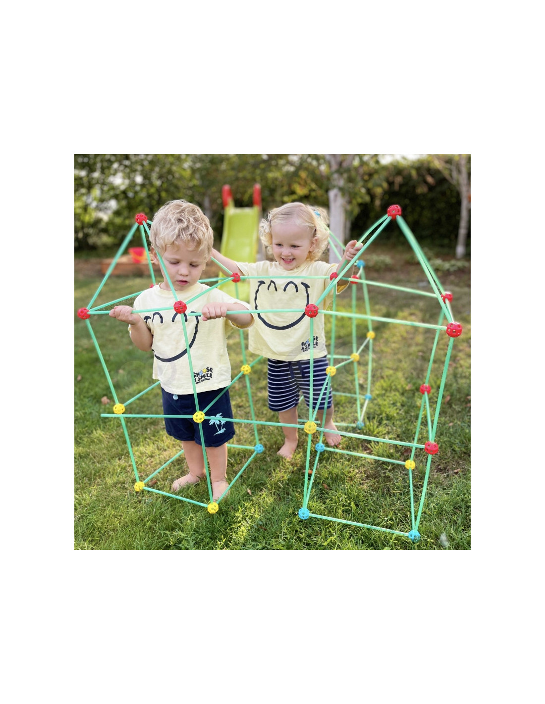 WOOPIE konstravimo rinkinys pažadins jūsų vaiko didįjį statybininką! Rinkinį sudaro 128 detalės , įskaitant vamzdelius, jungtis ir audinį konstrukcijos uždengimui. Detales galima sujungti ir suformuoti trimatę konstrukciją, pavyzdžiui, palapinę, aptrauktą audiniu. Rinkinys leidžia kūrybiškai žaisti tiek viduje , tiek lauke .