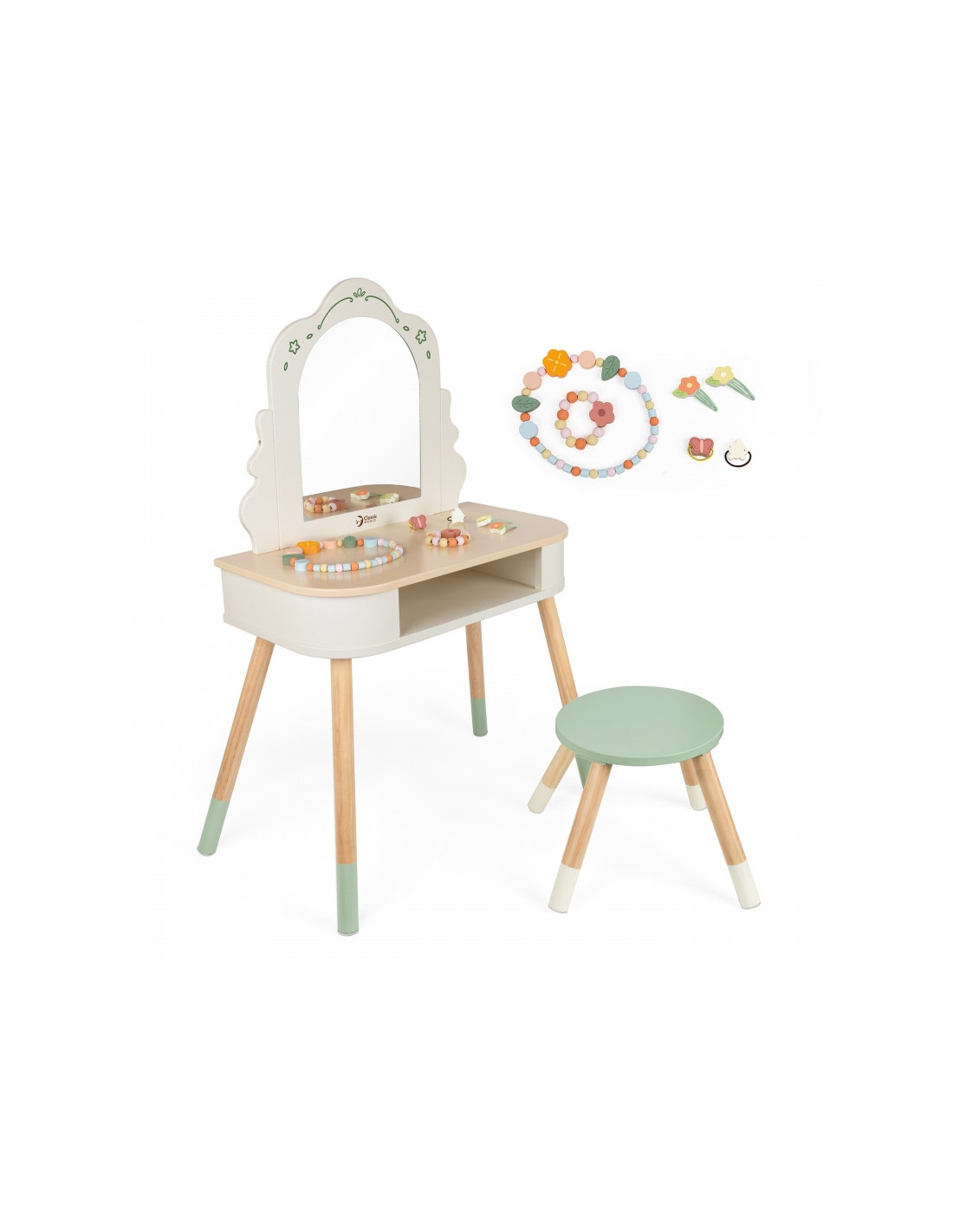 „Classic World“ kosmetinis staliukas su veidrodžiu. Dailios formos, pastelinių spalvų staliukas komplektuojamas drauge su kėdute ir papuošalais. Grožio staliukas namuose – kiekvienos mergaitės svajonė. Rinkinį sudaro apvali kėdutė, veidrodis ir įvairūs aksesuarai. Viskas pagaminta iš medžio. Tvirtas, kokybiškas, išskirtinis žaislas. Talpioje lentynėlėje (stalčiaus nėra) tilps mielos smulkmenos, papuošalų dėžutė ar kiti priedai.