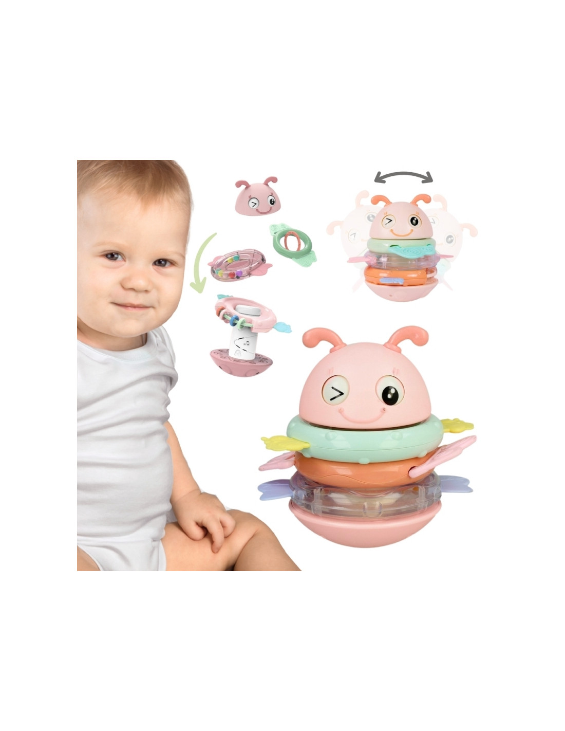 Geltonoji bitė Wańka Wstańka 2in1 iš Woopie - tai daugybę užduočių atliekantis sensorinis žaislas, kuris džiugina tiek savo funkcionalumu, tiek išvaizda! Dėl barškučių ir kramtukų su garso efektais derinio jis suteikia jūsų mažyliui visapusišką pramogą ir kartu padeda vystytis nuo pirmųjų gyvenimo mėnesių. Tris spalvingus ratukus, kurie atlieka ir barškučių, ir kramtukų funkcijas, galima uždėti ant specialaus pagaliuko, kuris, priklausomai nuo pasirinkto režimo, gros dainelę arba skleis juokingą garsą. Viską vainikuoja žavios bitės su judančiomis akimis galva, kuri sukuria patrauklią formą, traukiančią vaiko akį. Žaislas sukurtas atsižvelgiant į pačius mažiausius vaikus. Minkšti silikoniniai krašteliai ant ratukų puikiai tinka kaip kramtukai, o saugios, suapvalintos formos leidžia lengvai paimti ir manipuliuoti. Visos detalės yra spalvingos, įvairios tekstūros ir pakankamai didelės, kad skatintų kūdikio pojūčius, smalsumą ir motorinius įgūdžius. Dėl suapvalinto pagrindo žaislas judėdamas švelniai siūbuoja, todėl ne taip lengva jį apversti! Tai ne tik žaislas, bet ir kasdienio mokymosi ir vystymosi palydovas.