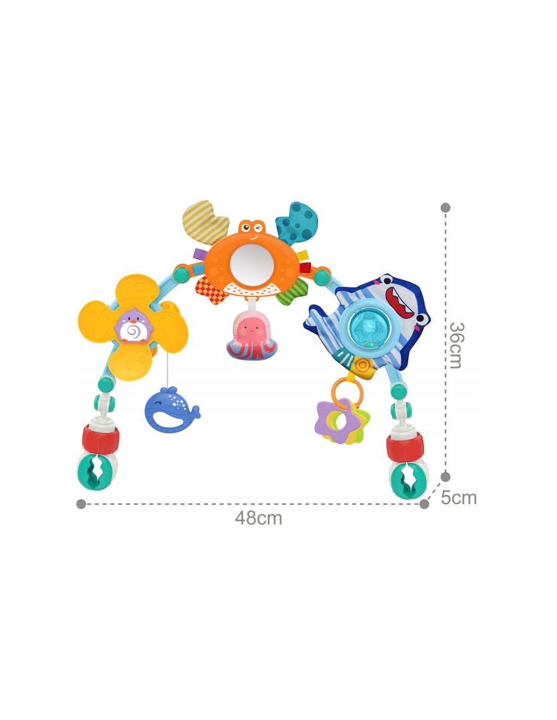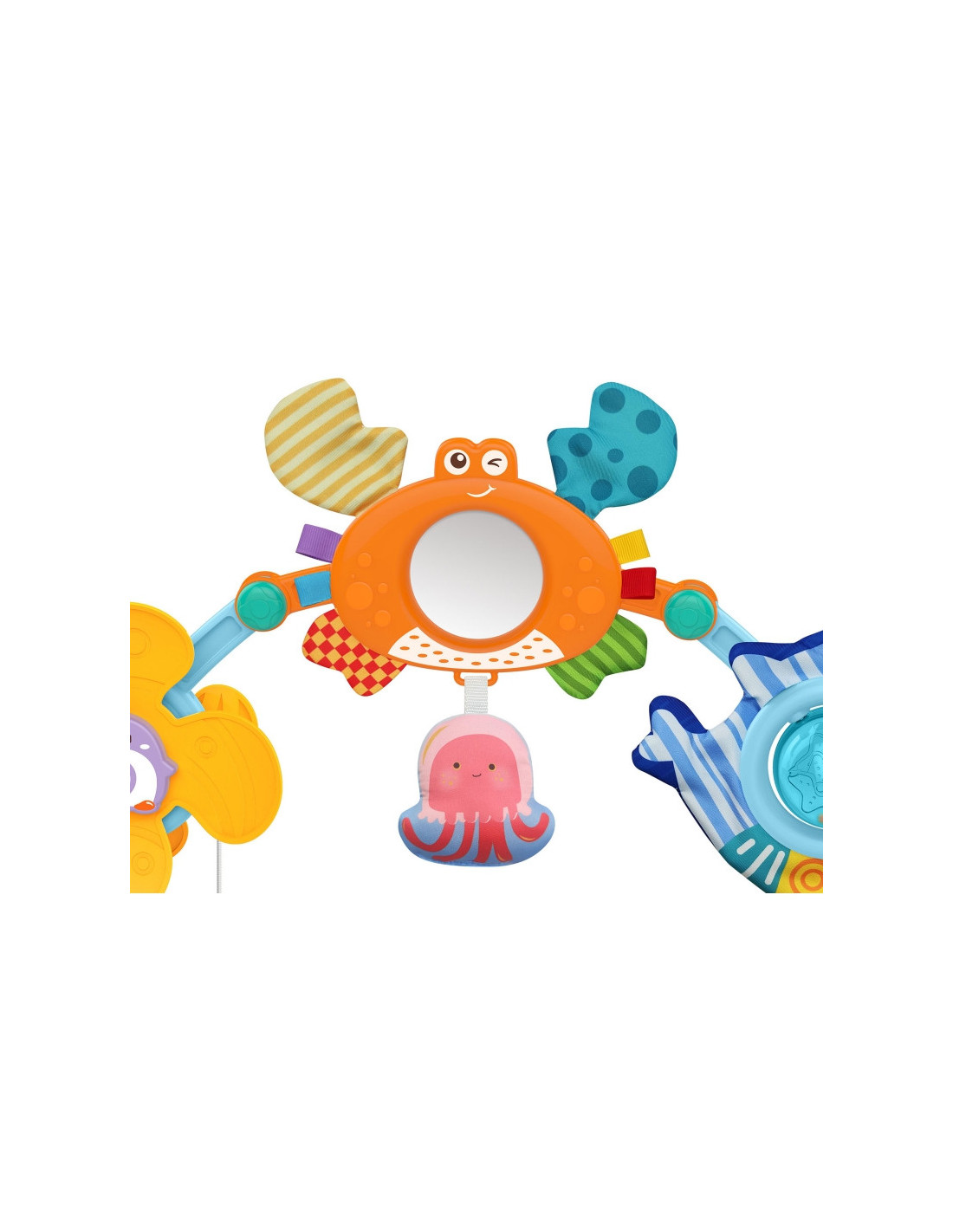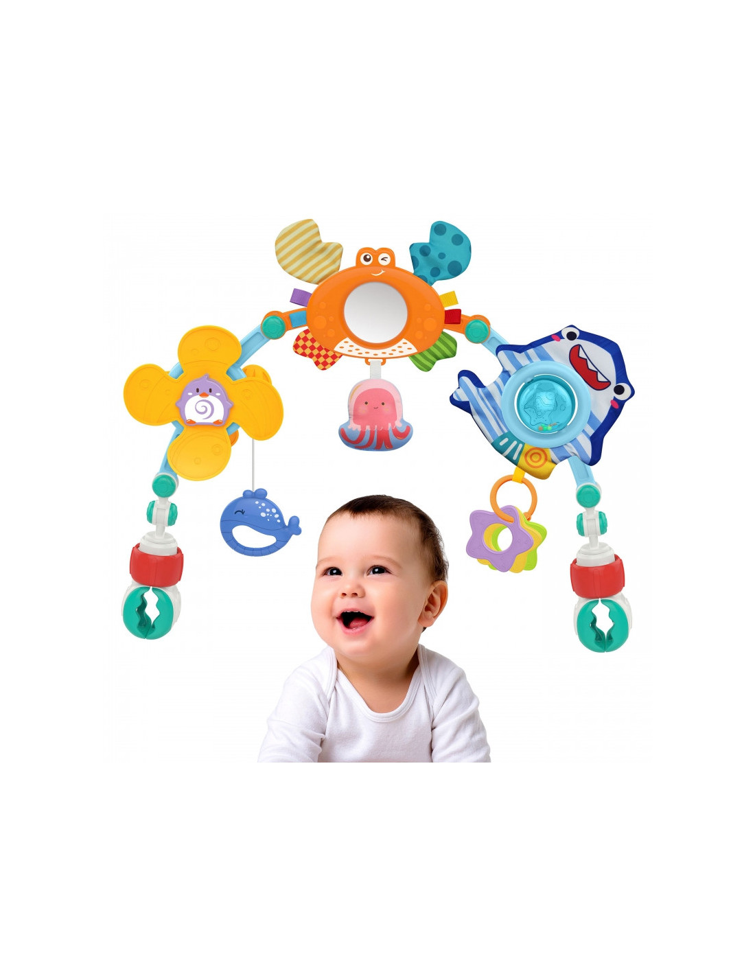 WOOPIE žaislų lankelis - tai universalus žaislas, kuris suteiks žavesio ir pramogos bet kuriam vežimėliui, automobilio kėdutei ar vaikiškai lovytei. Jis labai lankstus, todėl jį lengvai pritvirtinsite praktiškai bet kur. Ant lankelio yra įvairių jūros žaisliukų: pingvinas vėjo malūnėlis, krabas, aštuonkojis, ryklys ir delfinas, kurie reaguoja į kūdikio sąveiką, taip pat žvaigždutės formos pakabukai. Kiekvienas iš šių žaislų yra skirtingos tekstūros ir veikia skirtingai, o tai stimuliuoja kūdikio lytėjimo pojūtį ir padeda lavinti jo motorinius įgūdžius.